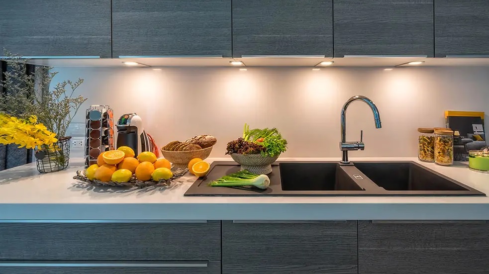 LED lente zem sienas skapīšiem izgaismos darba virsmu un priekšmetus uz galda virsmas. Šāds apgaismojums vakarā izskatās īpaši mājīgi.