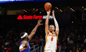 Kristaps Porziņģis izpilda metienu pret Orlando. Foto. AP. Scanpix Liepājas basketbolists Kristaps Porziņģis otrdien guva 15 punktus Nacionālās basketbola asociācijas (NBA) mačā, kurā viņa pārstāvētā Atlantas "Hawks" komanda izcīnīja uzvaru....