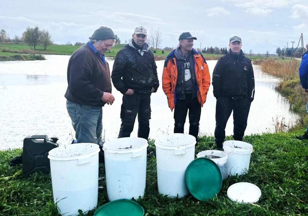 Bārtas un Kalētu pagastu apvienības pārvaldnieks Ģirts Laugalis kopā ar palīgiem Bārtā Gulbju dīķī ielaiduši turpat divus tūkstošus zivju mazuļu – līņus, karūsas un karpas.