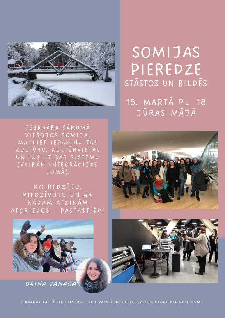 Februāra sākumā D. Vanagai bija iespēja nedēļu ciemoties Somijā projektā “Sadarbība mūžiglītības attīstībai”, kura laikā viņa iepazinās ar Somijas kultūru, izglītību un integrācijas procesiem tajā.