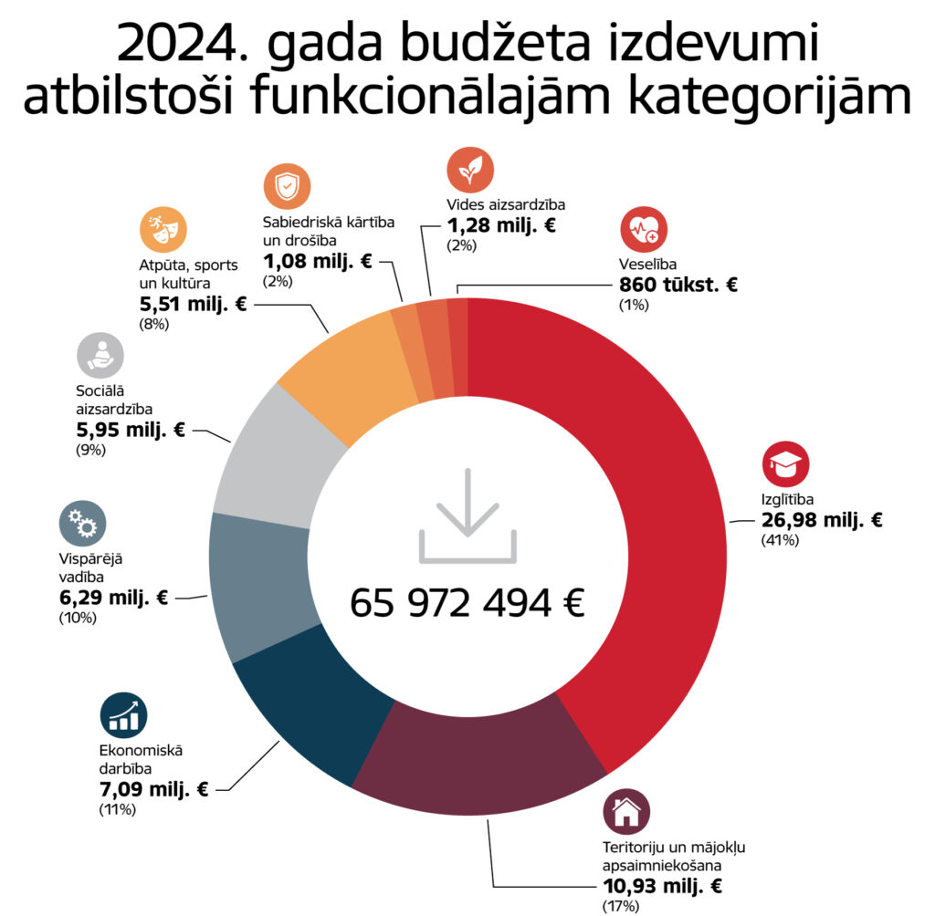 Pamatbudžeta izdevumu kopējais apjoms prognozēts 65 972 494 eiro, kas ir par 3,8% vairāk jeb 2 438 917 eiro nekā iepriekšējā gada izpilde.