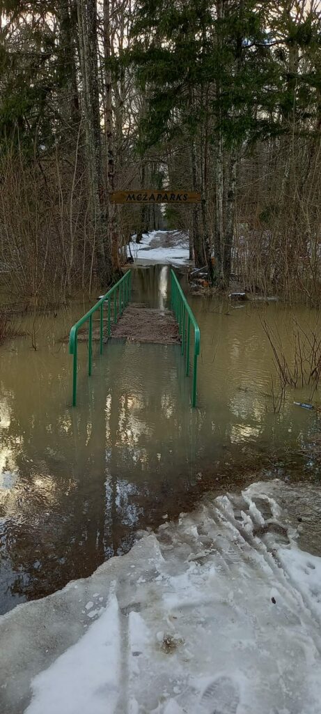 Pirmdien applūdis tiltiņš pie ieejas Cīravas Mežparkā. Foto – Sarmīte Braša.