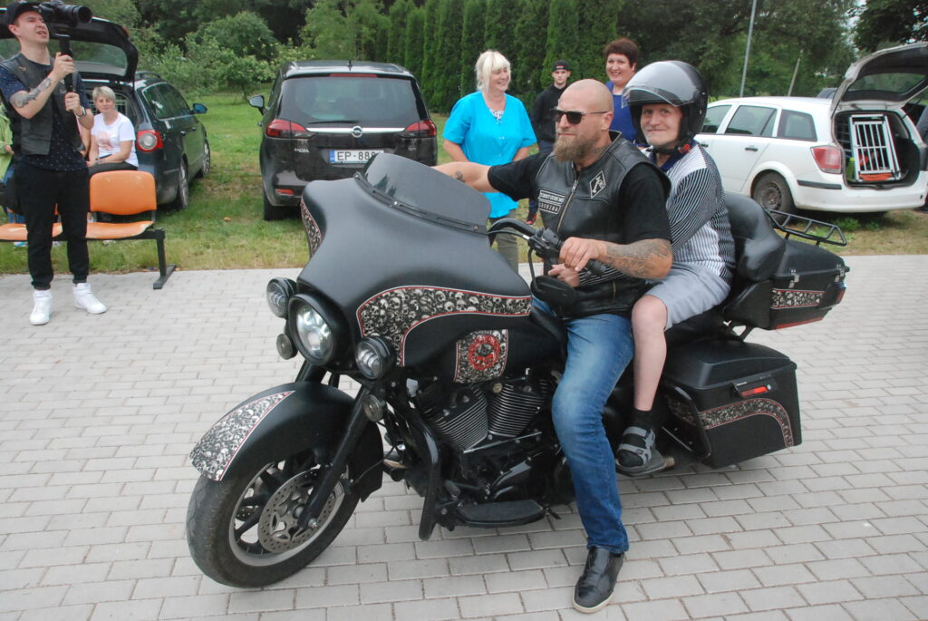 Šovasar Toms Būks kopā ar citiem motobraucējiem ar močiem vizināja Valsts sociālās aprūpes centra “Kurzeme” filiāles “Iļģi” iemītniekus. Foto – Uldis Dobelis