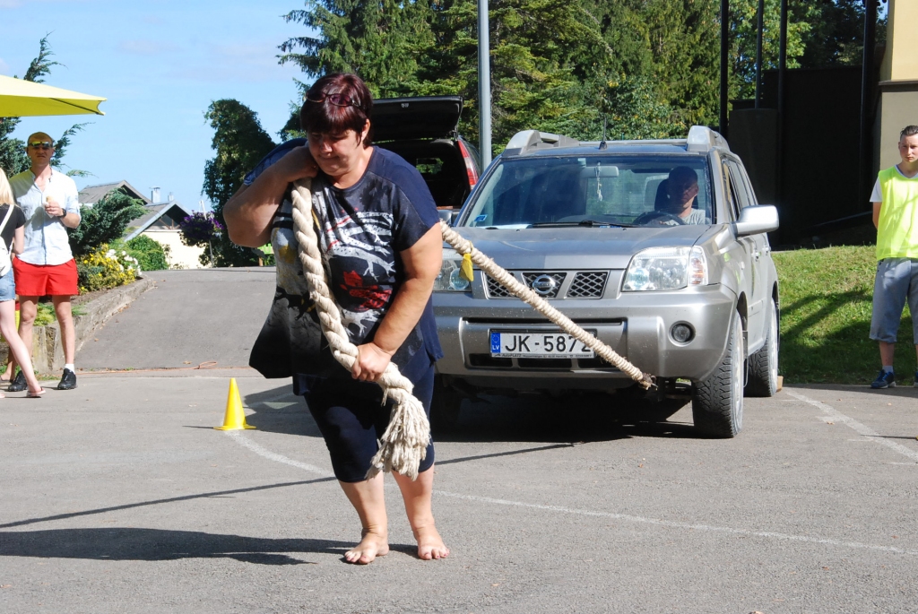 Vienā no iepriekšējiem gadiem Vecpilī automašīnu vilkšanas sacensībās piedalās Vecpils kultūras pasākumu organizatore Inta Dreimane.