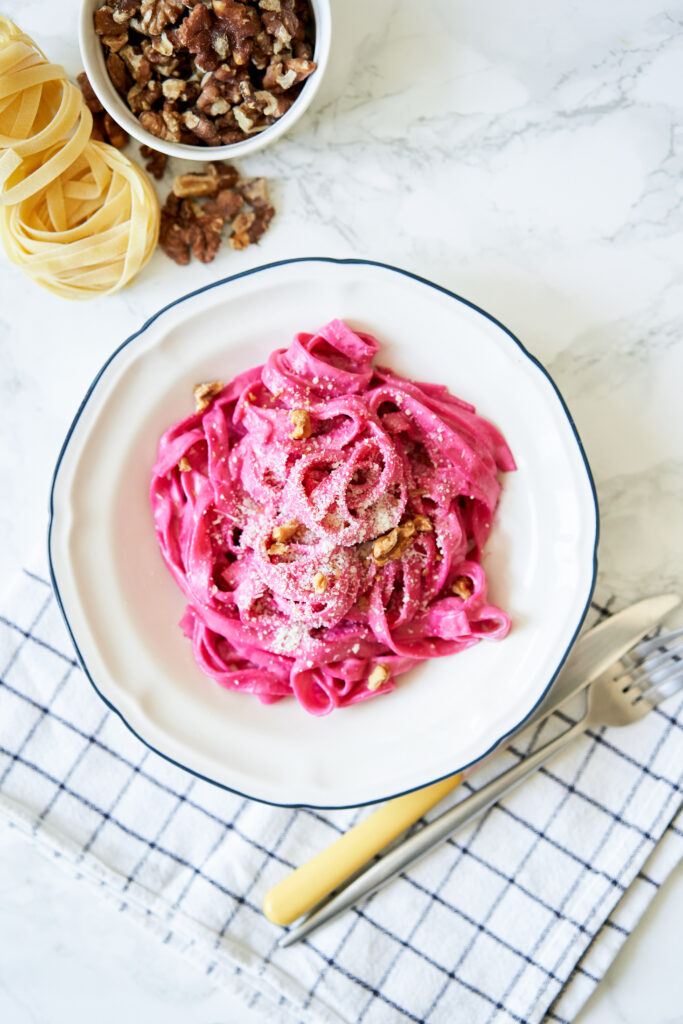 2) Blenderī liec kazas sieru, gabalos sagrieztu bieti, olīveļļu, piparus, timiānu, 30 g valriekstu un pusi no ūdens, kurā vārījās pasta.