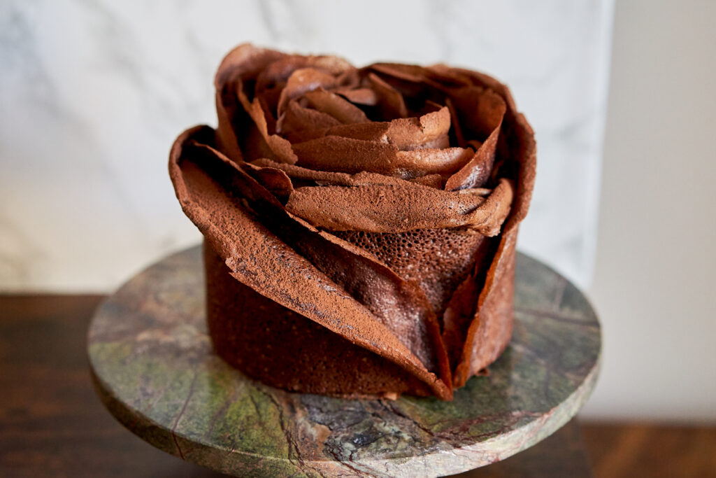 9) Pārloki pankūkas uz pusēm, uzklāj nedaudz krēma uz atlocītās pankūku pamatnes daļas, un sarullē pankūku klājumu no viena gala līdz otram, izveidojot “rozes” centru. Atkārto šo procesu ar visām pārējām pankūkām, satinot “rozi” arvien lielāku.