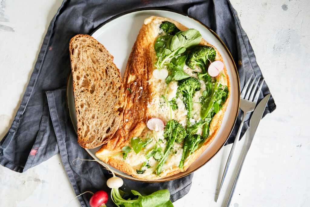 4)Uzreiz virsū omletei liec brokoļu ziedkopas un zirņu dīgstus veidojot uz omletes “ziedu zīmējumu”.