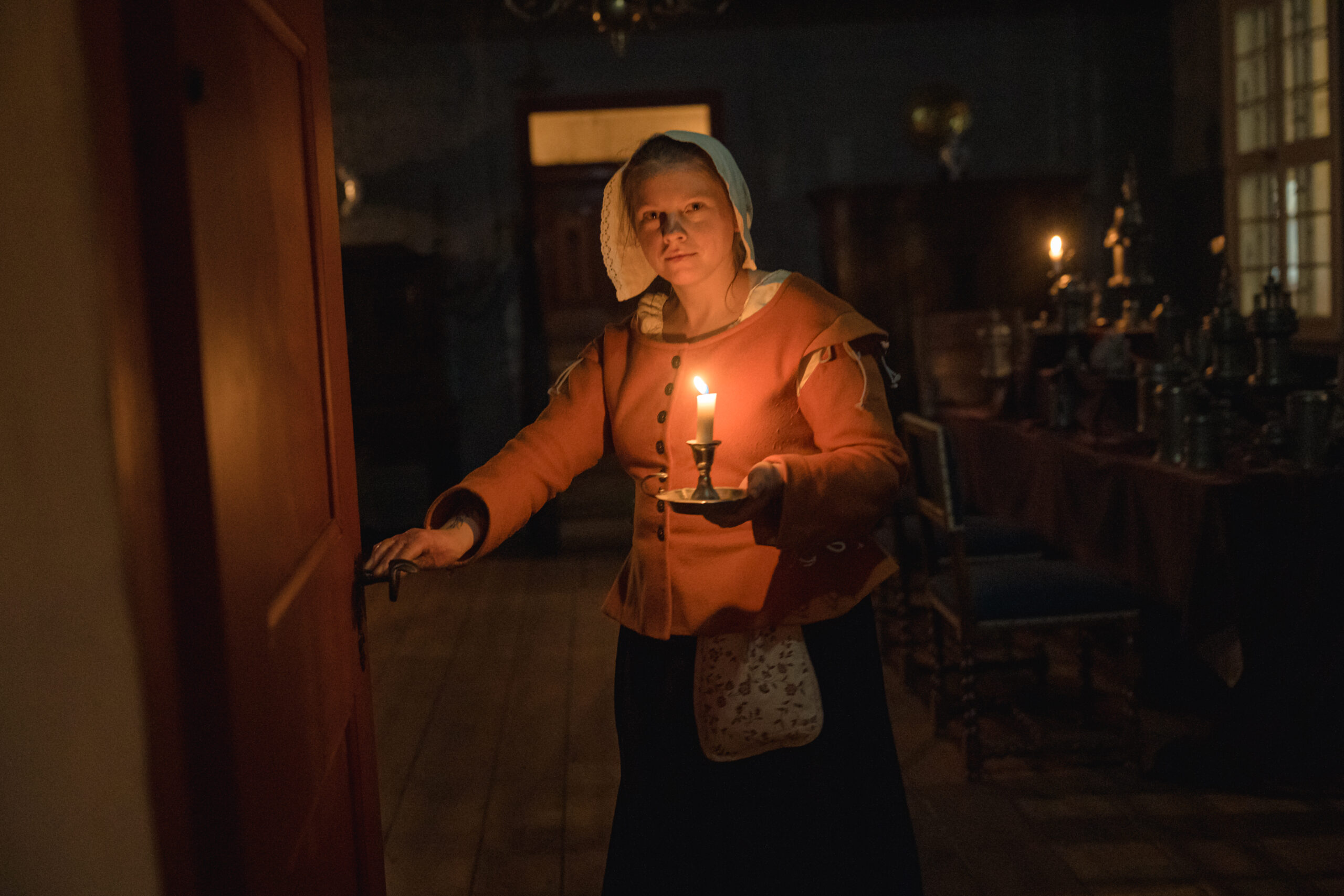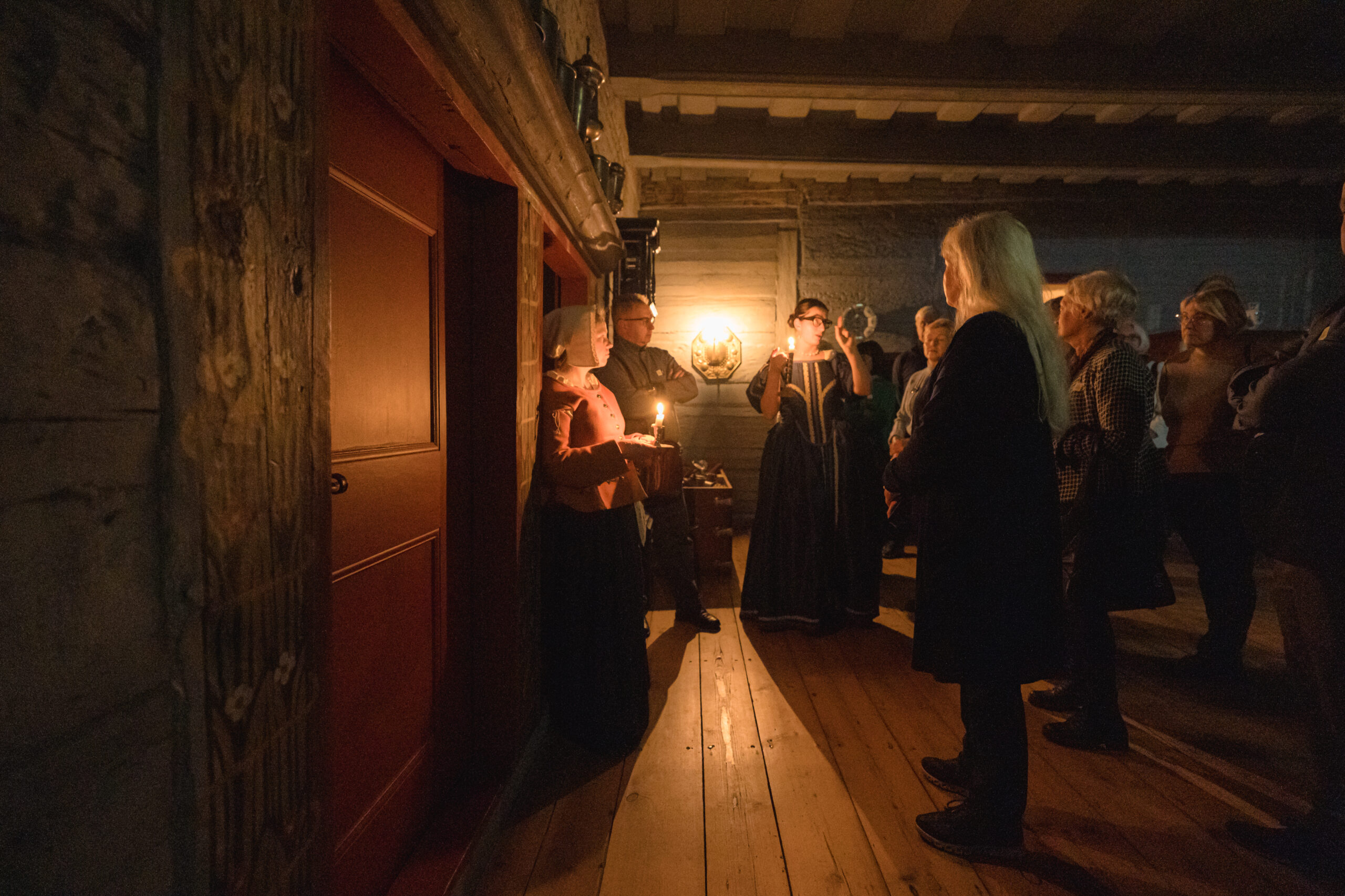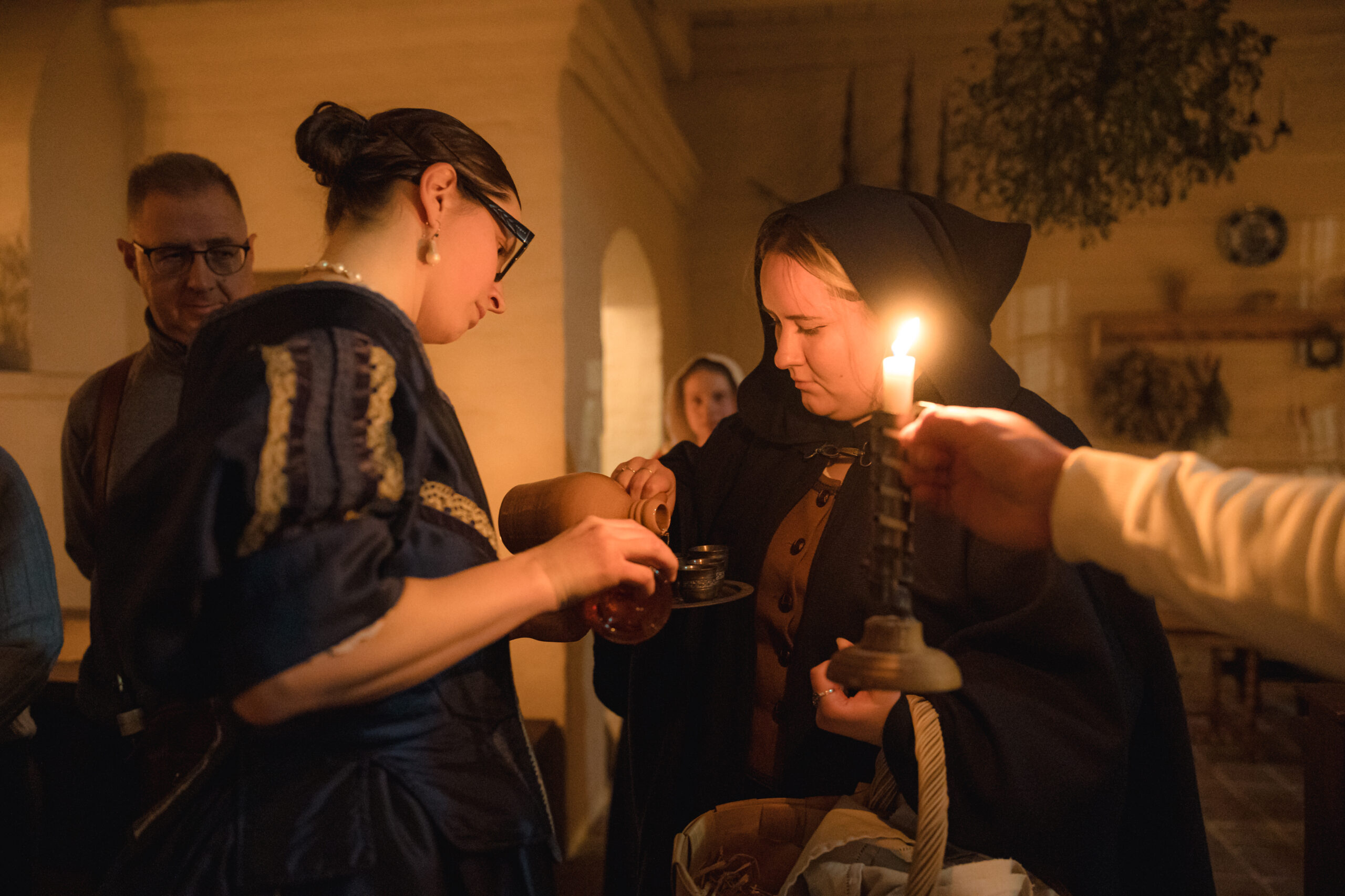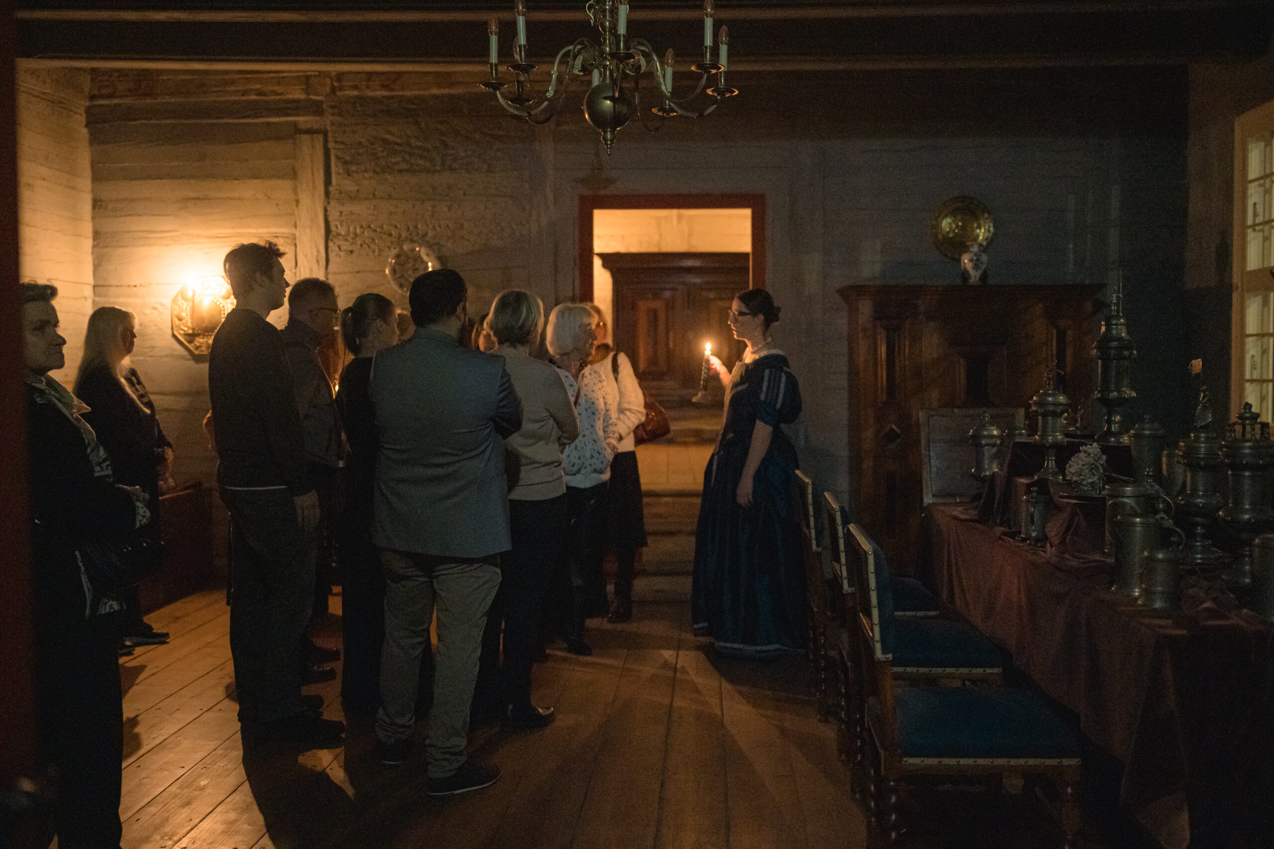 “Ekskursija sveču gaismā” ļāva piedzīvot īpašu senatnes noskaņu, ielūkojoties vēsturiskajos interjeros un tā laika ļaužu vakara gaitās. Apmeklētāji sastapa namā ieklīdušu zintnieci, guļamkambarī trīs dienas aizsnaudušos spēlmani, kā arī nama saimnieci ar kalponi, kuras dalījās dienas gaitās un ievadīja klātesošos nama vēsturē, portālu “ReKurZeme” informē Liepājas muzeja filiāles Liepājas 17.-19.gs. interjera muzejs “Hoijeres kundzes viesu nams” vadītāja Ieva Dzintare.