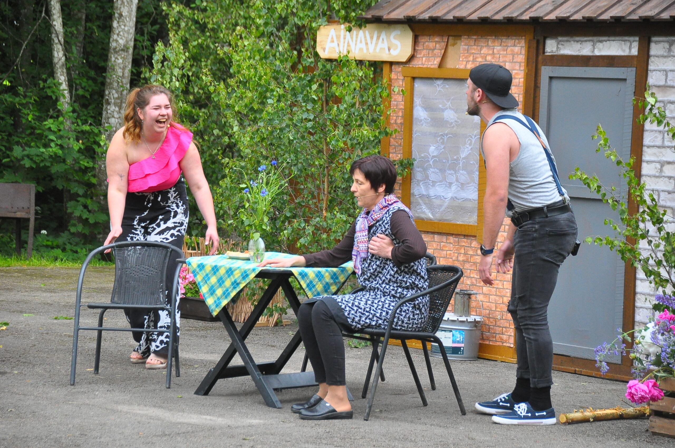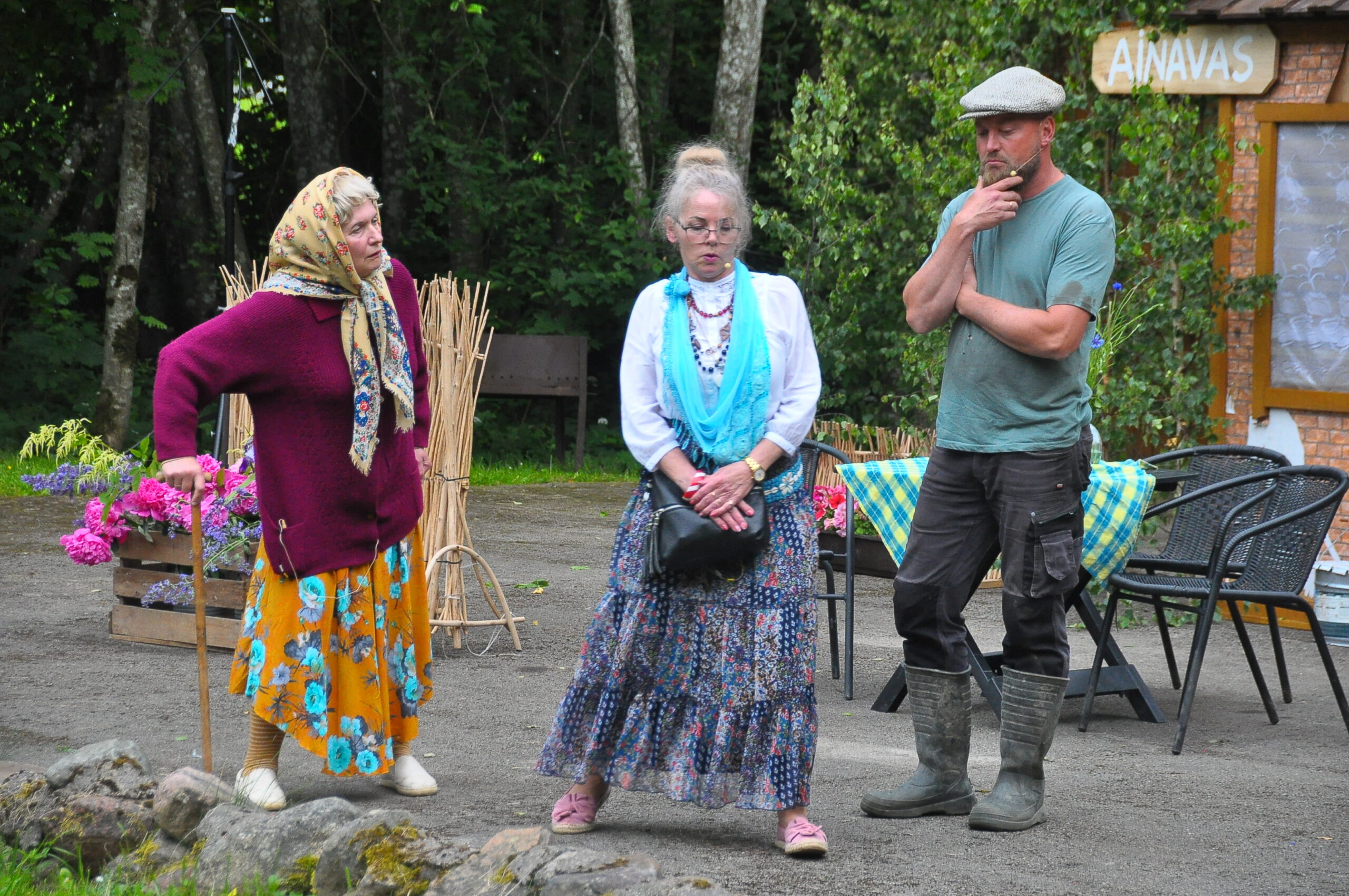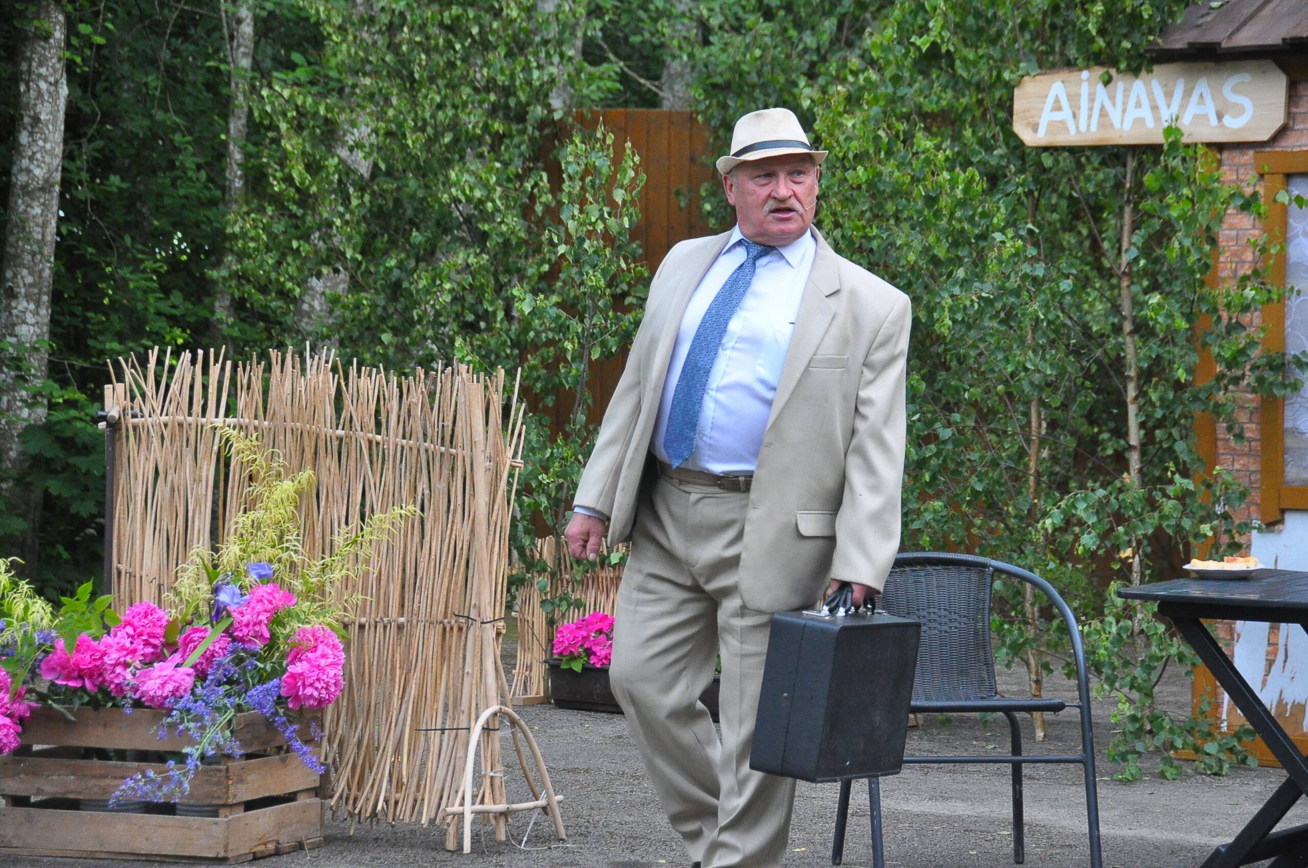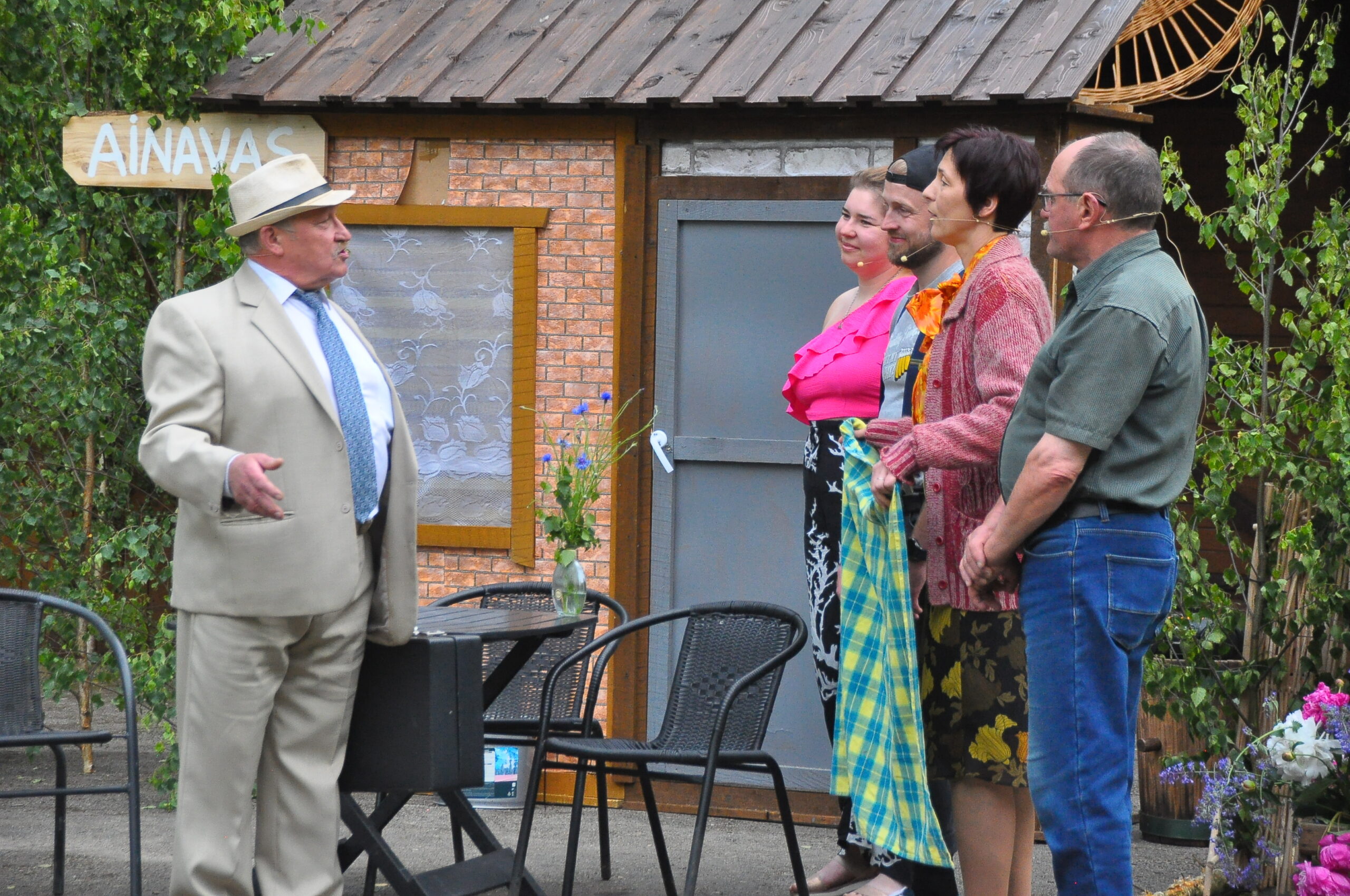 Nepārspējams izrādē bija arī Aizputes Tautas teātra režisors Igors Māters, kurš iejutās Levija Šnicela lomā – “Sāls” bankas kredītdaļas vadītājā. Savukārt saimnieku bērni bija Sindija Ruzaiķe un Elgars Jonass.