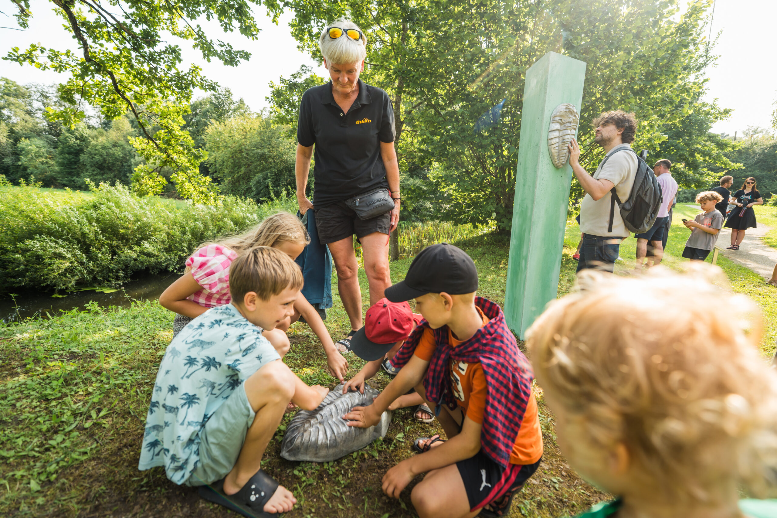 Ievas Vieses vairāku mediju instalācija “Trialitāte” ar čugunā lietiem trilobītiem – sen izmirušiem jūras posmkājiem – simboliski “ievieto” senatni mūsdienu ainavā. Darbs reflektē par kustību, laika slāņiem un trešo skatījuma plakni – kā saikni starp cilvēku, vidi un līdz šim nezināmo.