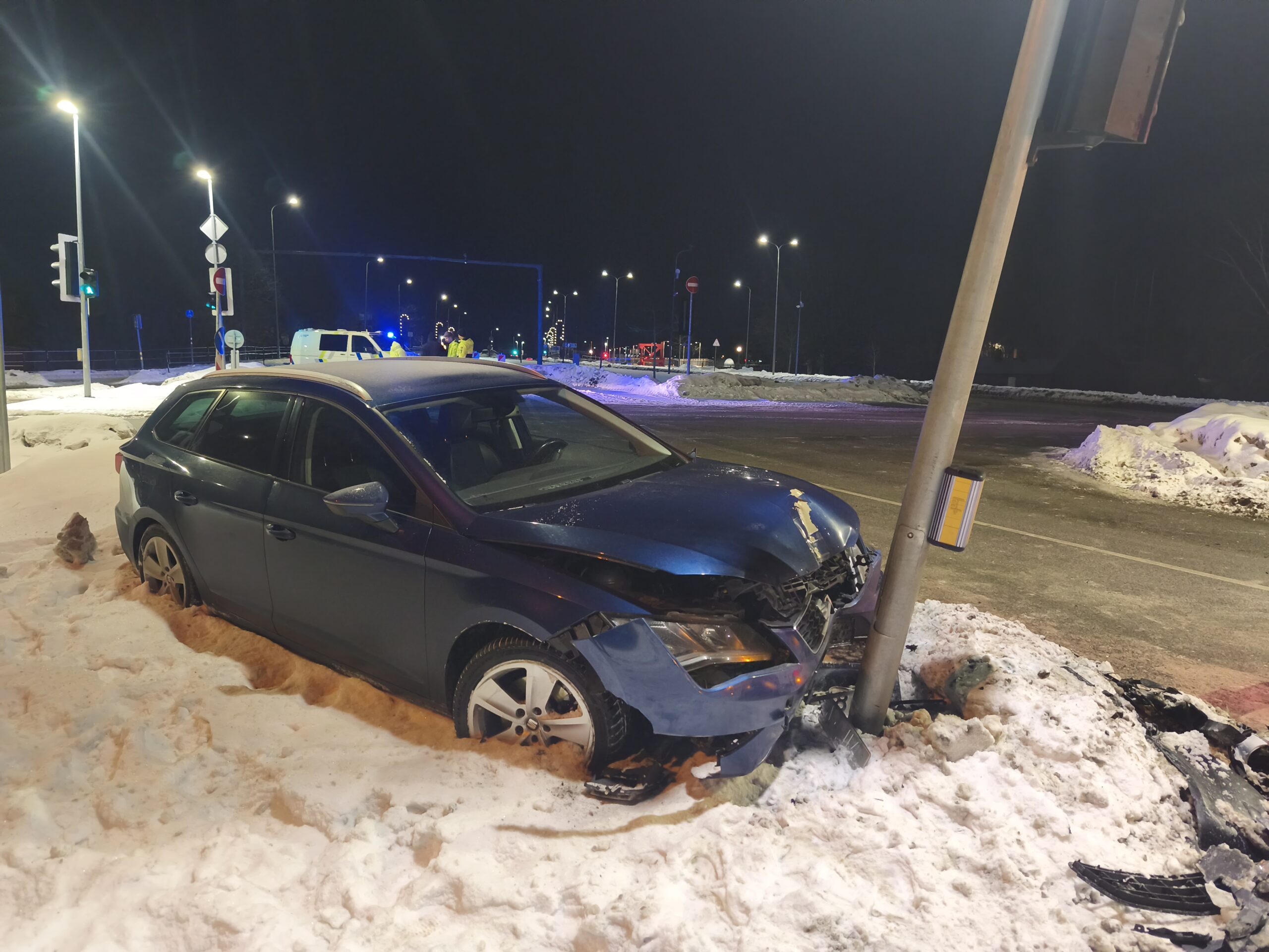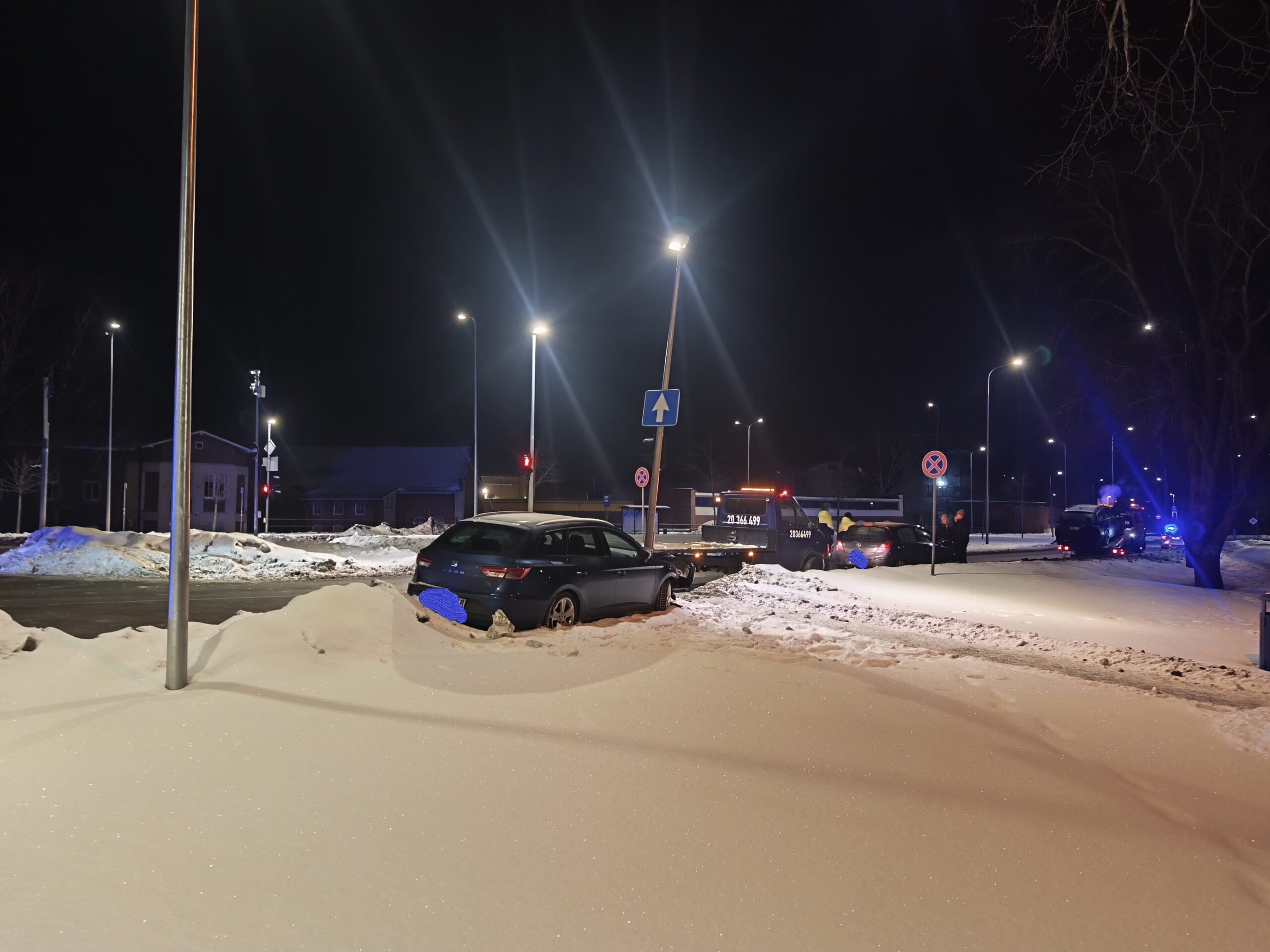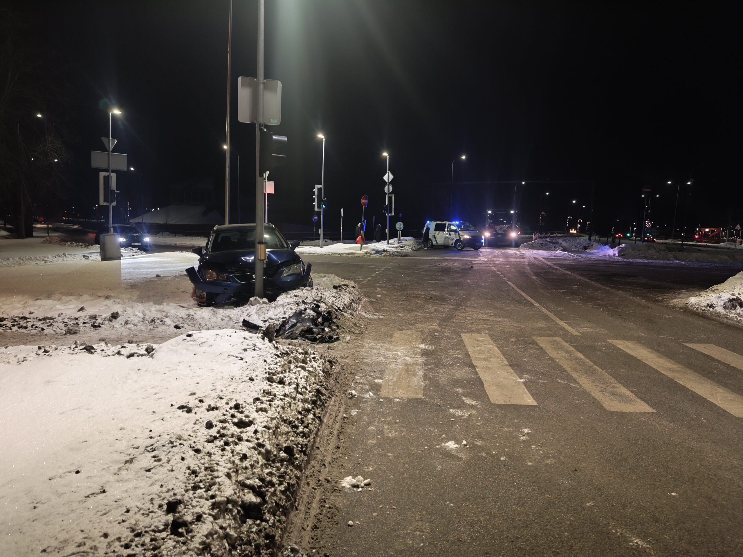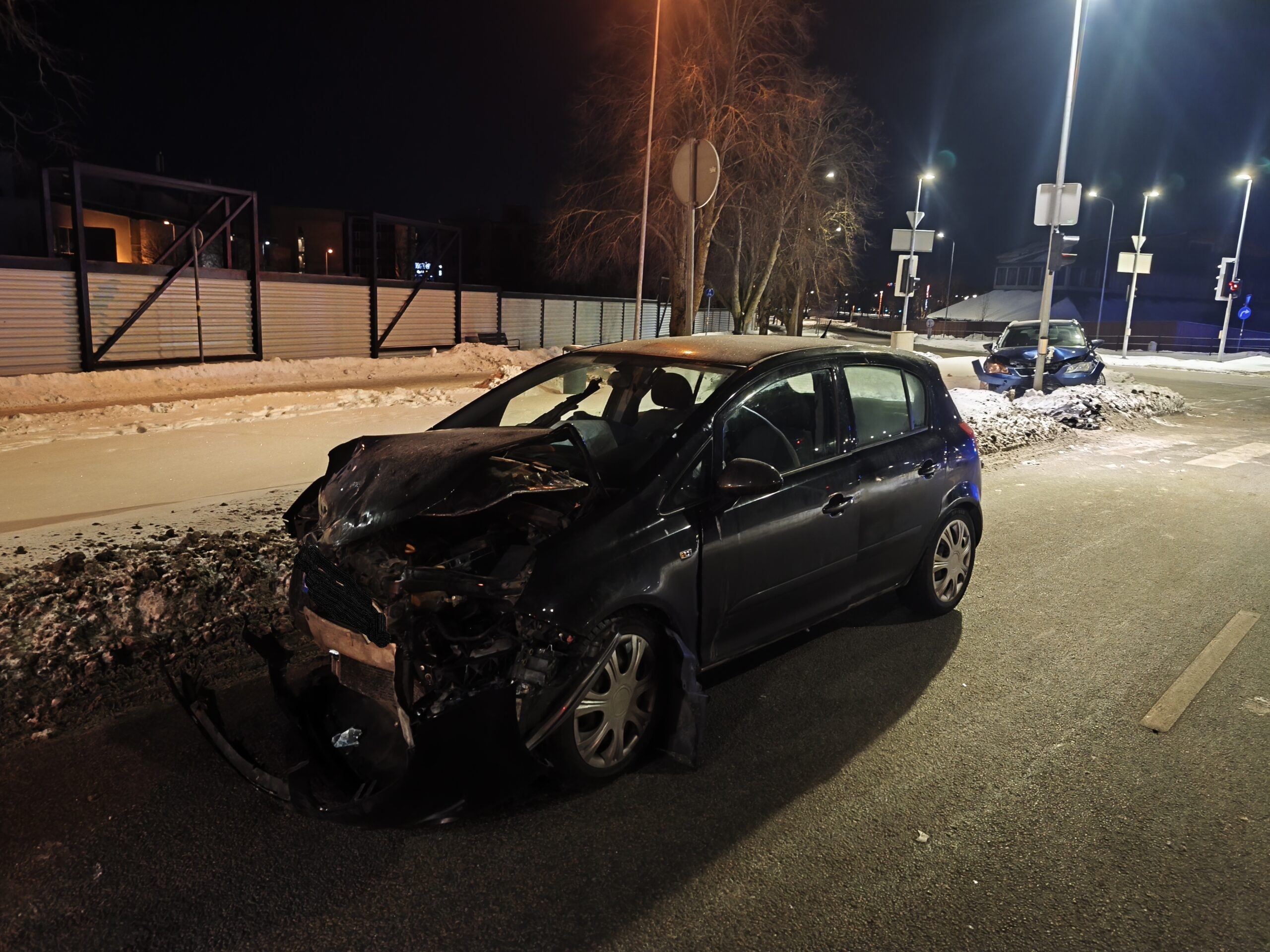 Avārija notika Jaunā tilta un Ādu ielas krustojumā, kur viena automašīna bija ieskrējusi stabā, pamatīgi sadauzīta bija arī otra automašīna.