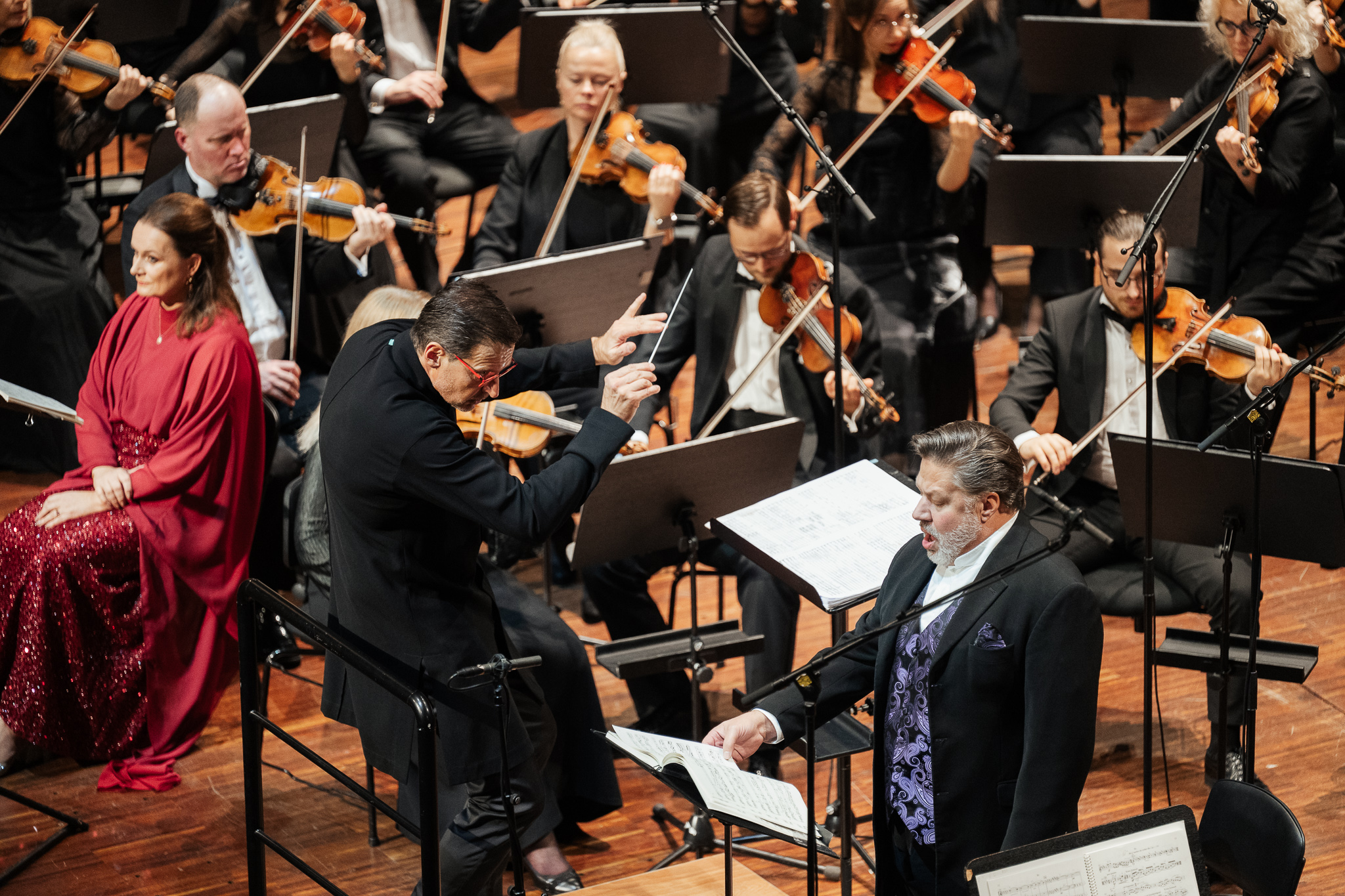 Diriģenta vadībā apvienojās Valsts akadēmiskais koris “Latvija”, Rīgas Projektu koris, Igaunijas Nacionālais vīru koris, Liepājas Simfoniskais orķestris un Latvijas Nacionālais simfoniskais orķestris. Savukārt Toves un karaļa Valdemāra spēcīgās mīlas stāstu klausītājiem uzbūra tumsnēji daiļās un mirdzošās balss īpašniece Magdalēna Anna Hofmane (Magdalena Anna Hofmann) un Latvijas publikai pazīstamais amerikāņu operdziedātājs Korbijs Velčs (Corby Welch). Viņiem pievienojās Frankfurtes operas soliste Zanda Švēde (Mežadūja), viens no vadošajiem Latvijas Nacionālās operas solistiem Mihails Čuļpajevs (Nerrs Klauss), un Vācijā un Latvijā ievērojamus panākumus guvušais basbaritons Olivers Cvargs (Oliver Zwarg), kam tika uzticēta zemnieka un stāstnieka loma.