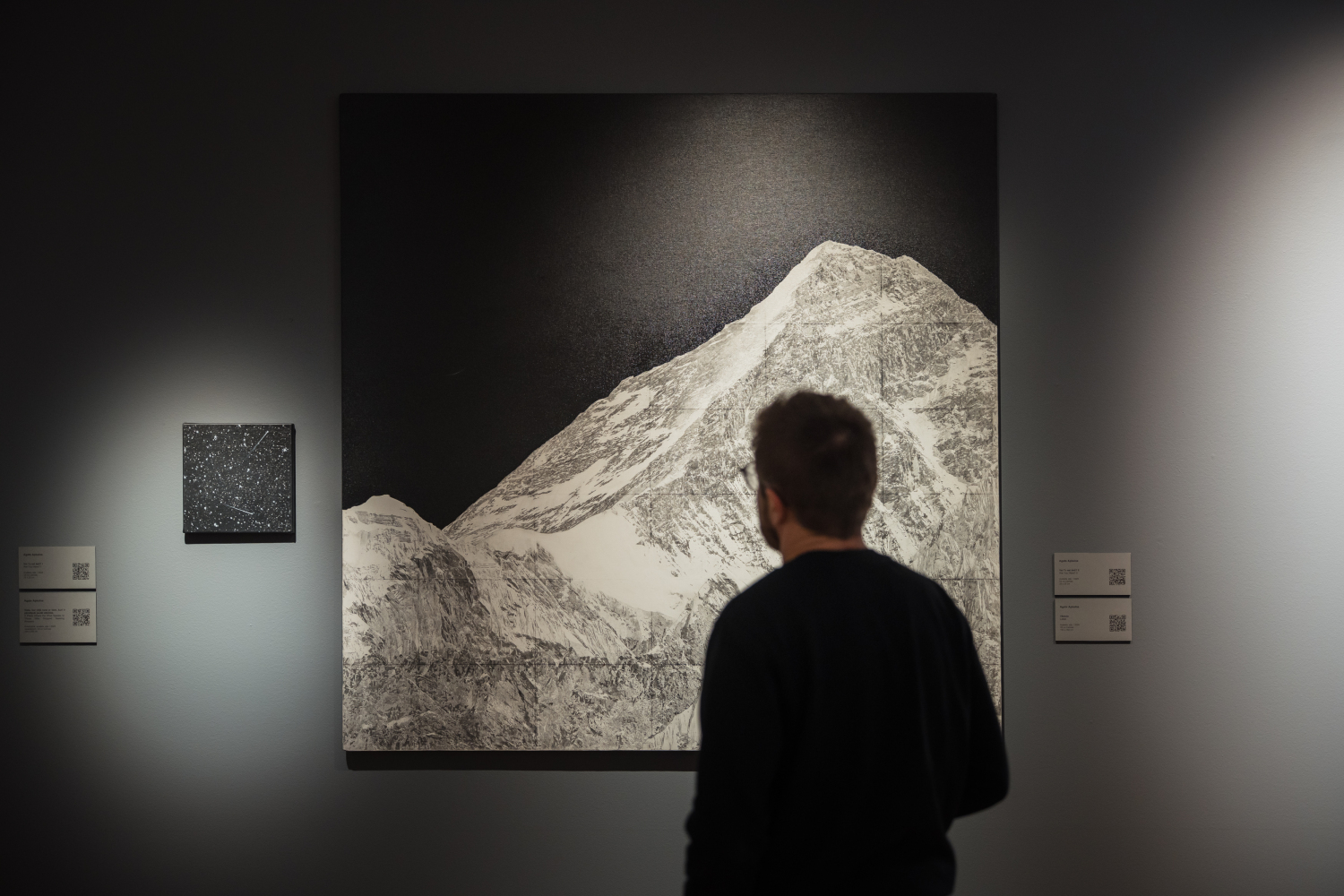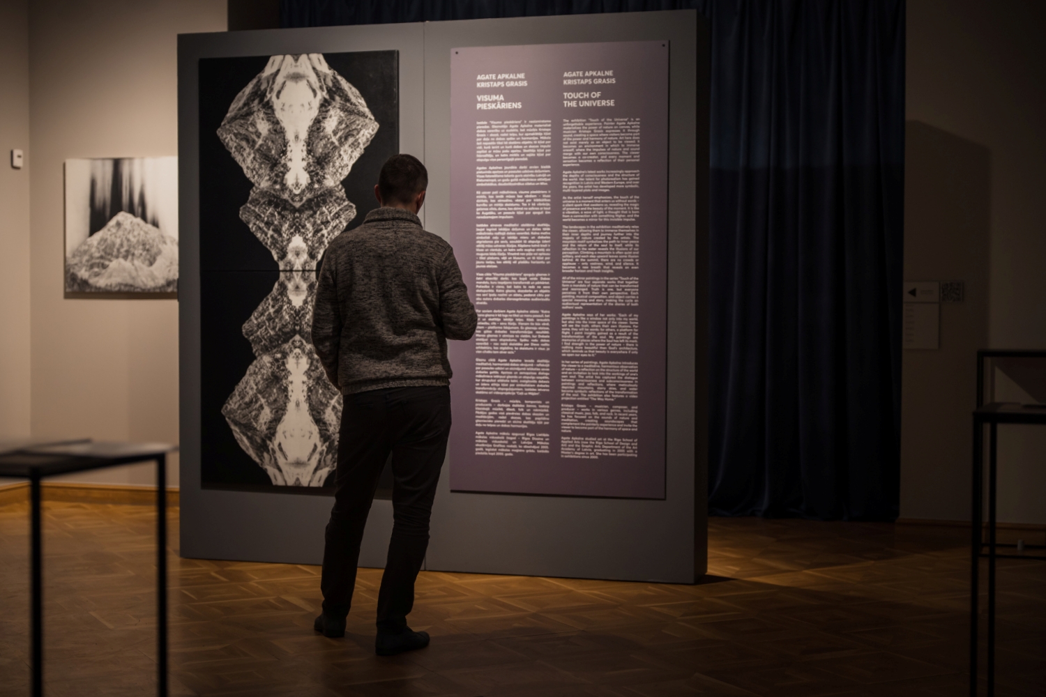Piektdien, 12. decembrī, Liepājas muzeja lielajā izstāžu zālē Kūrmājas pr. 16/18 tika atklāta divu latviešu mākslinieku – gleznotājas Agates Apkalnes un mūziķa Kristapa Graša – kopizstāde “Visuma pieskāriens”, kas piedāvā apmeklētājiem audiovizuālu, meditatīvu telpu, kur mūzikas un vizuālās mākslas sintēzē ziemeļnieciskās dabas skaistums un spēks atklājas zemes, ūdens un gaisa klātesamībā.