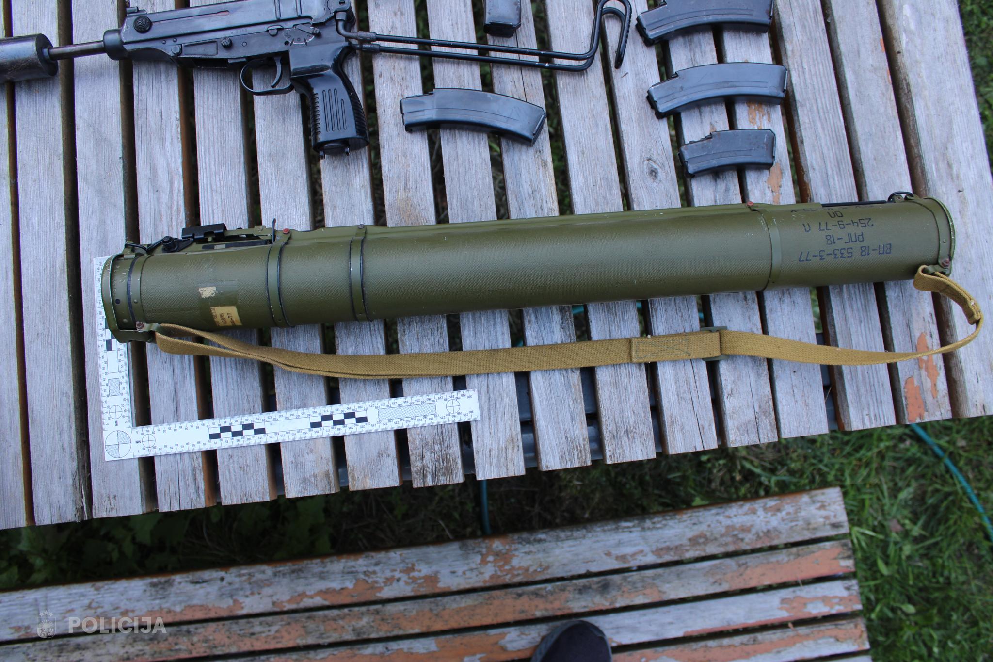 “Kalašnikova” tipa triecienšautene, trīs pistoles, tajā skaitā ar klusinātājiem, vairākas pusautomātiskās karabīnes, bises un pumpja bises, kā arī vienreizējās lietošanas bezatgrūdes prettanku raķešu palaidējs “RPG-18”. Tāpat dažādu kalibru munīcija – kopā 632 patronas.