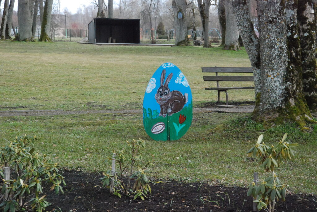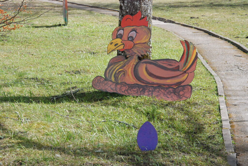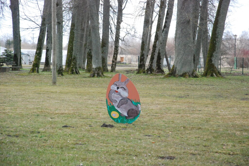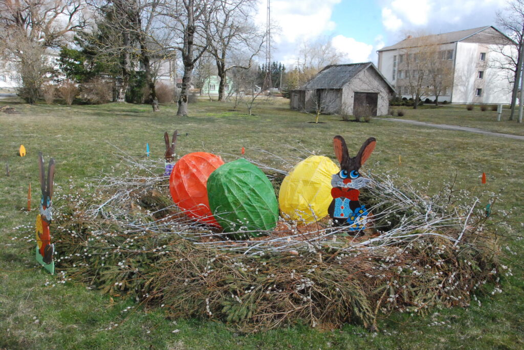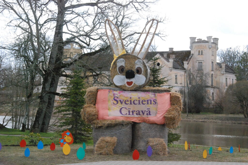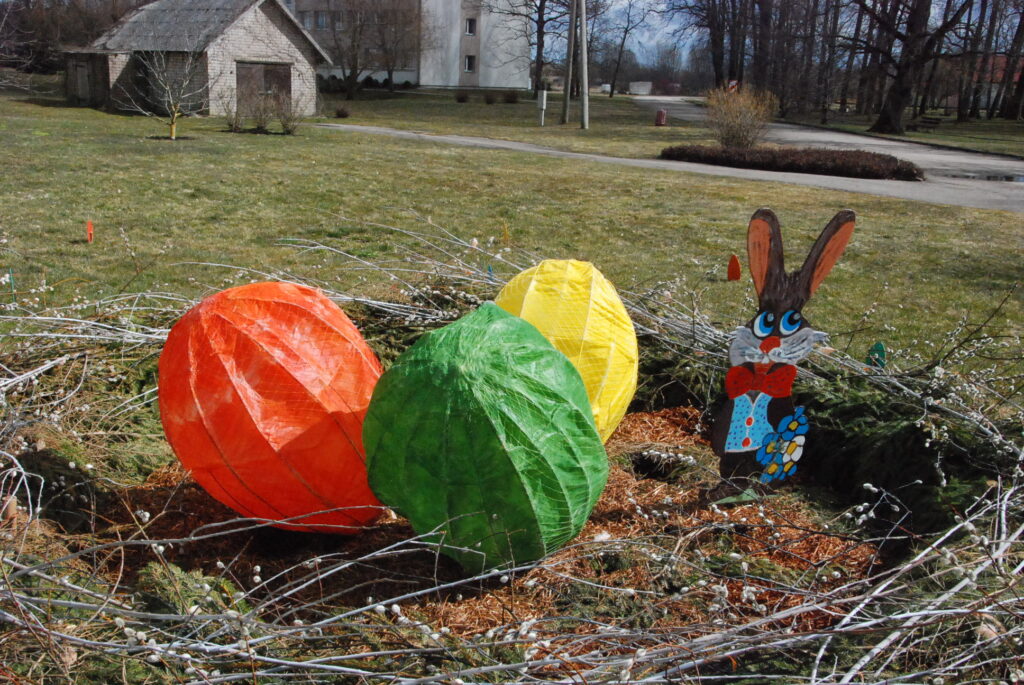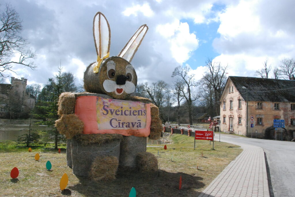 Fotoieskats, kā Lieldienām rotājusies Cīrava, kur pagasta centrā blakus autobusa pieturai pārsteidz milzīga izmēra Lieldienu zaķis.