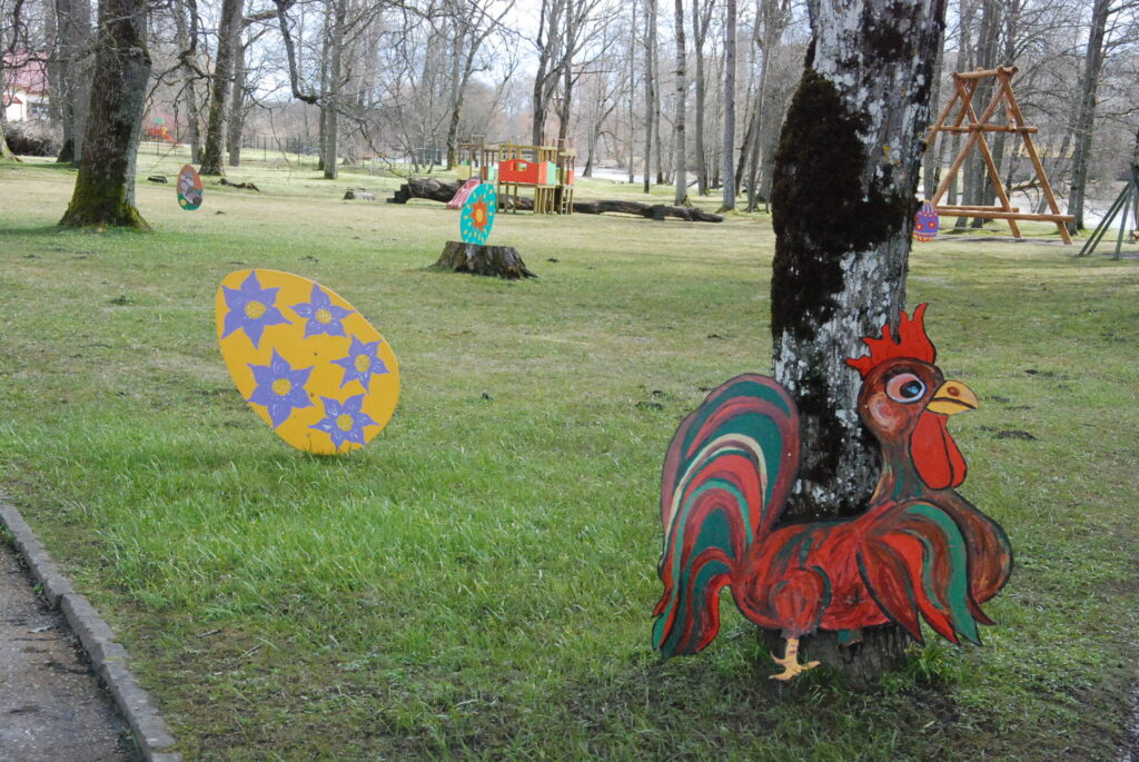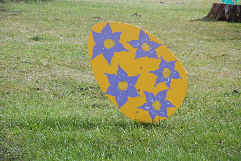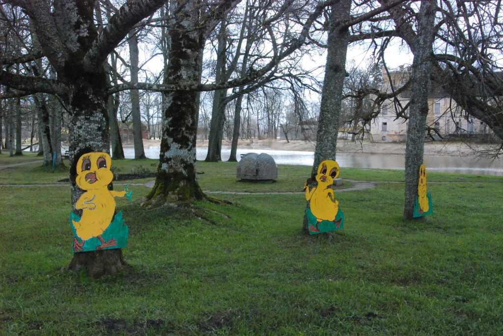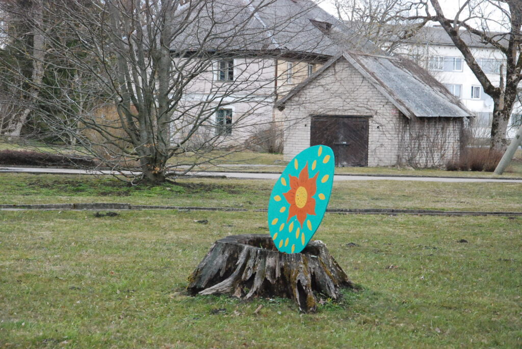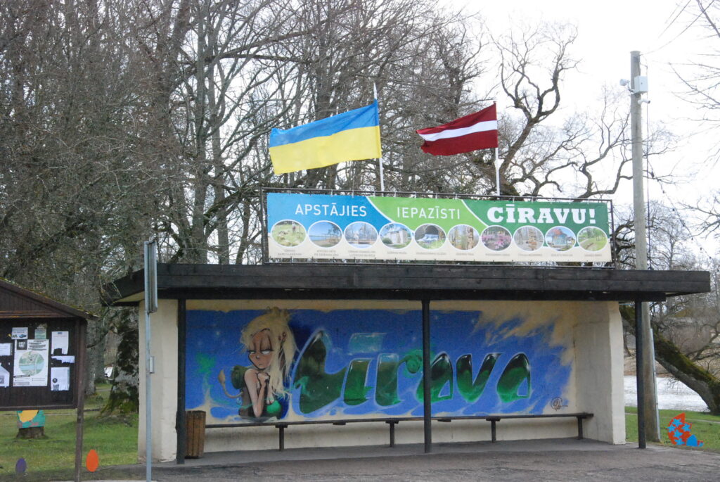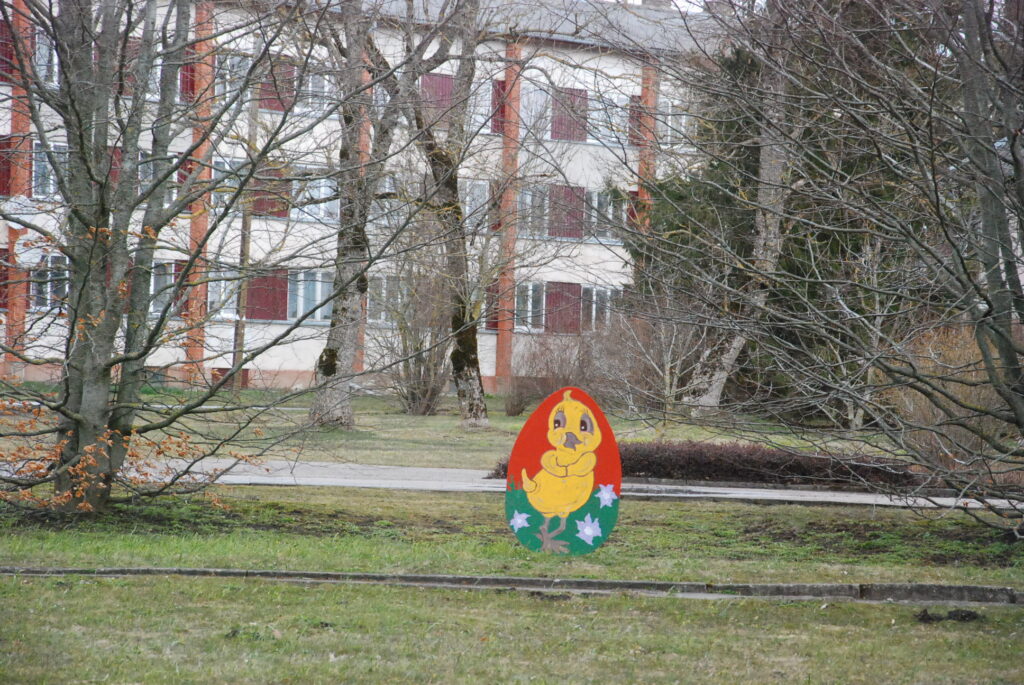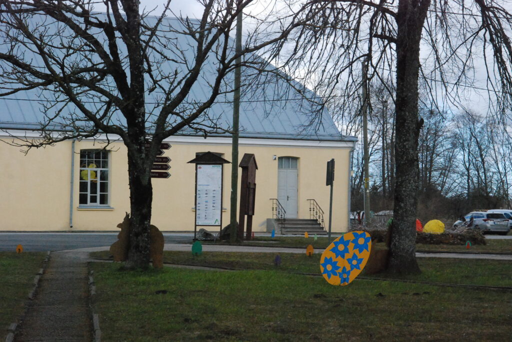 Fotoieskats, kā Lieldienām rotājusies Cīrava, kur pagasta centrā blakus autobusa pieturai pārsteidz milzīga izmēra Lieldienu zaķis.