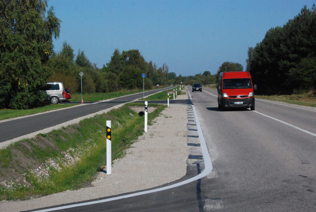 Uz gājēju un velobraucēju ceļa uzklāti horizontālie apzīmējumi un tas aprīkots ar ceļazīmēm Nr. 417 “Kopīgs gājēju un velosipēdistu ceļš’”. Tas nozīmē, ka autovadītājiem, šķērsojot gājēju / velo ceļu lai nogrieztos uz īpašumu vai izbrauktu no blakus ceļa, ir jādod ceļš gājējiem un velosipēdistiem.