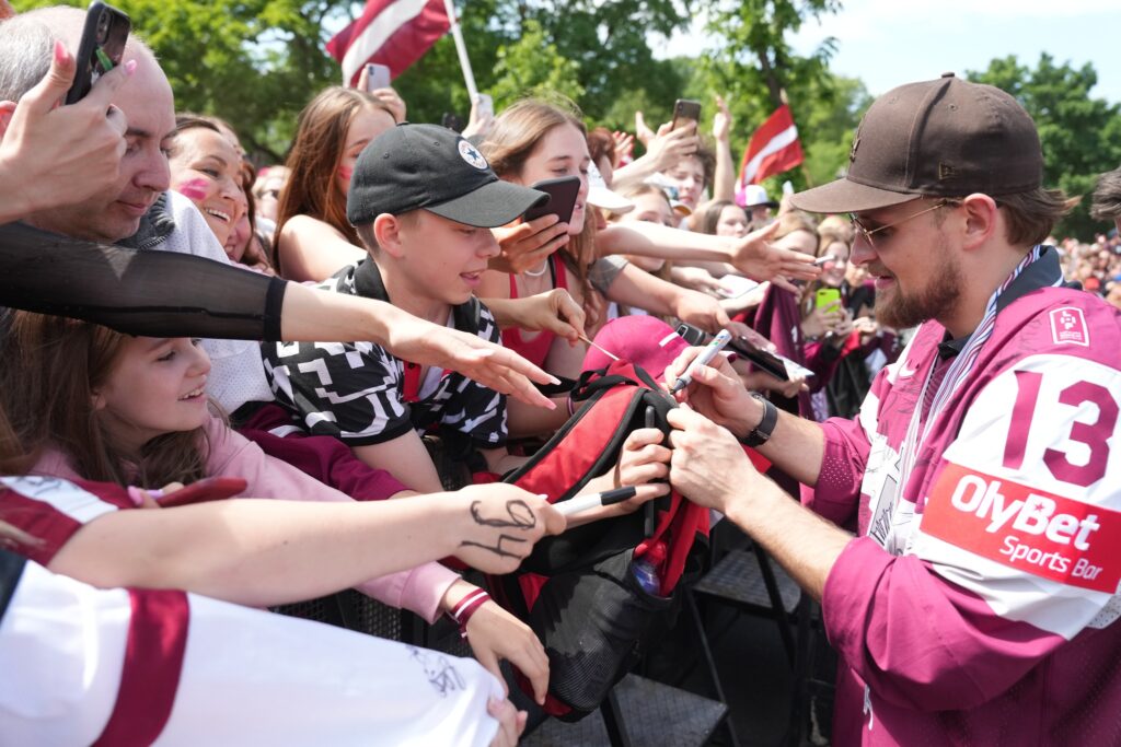 Pie Brīvības pieminekļa notiek bronzas medaļas Pasaules čempionātā hokejā izcīnījušās Latvijas hokeja izlases tikšanās ar līdzjutējiem. Foto – Edijs Pālens/LETA