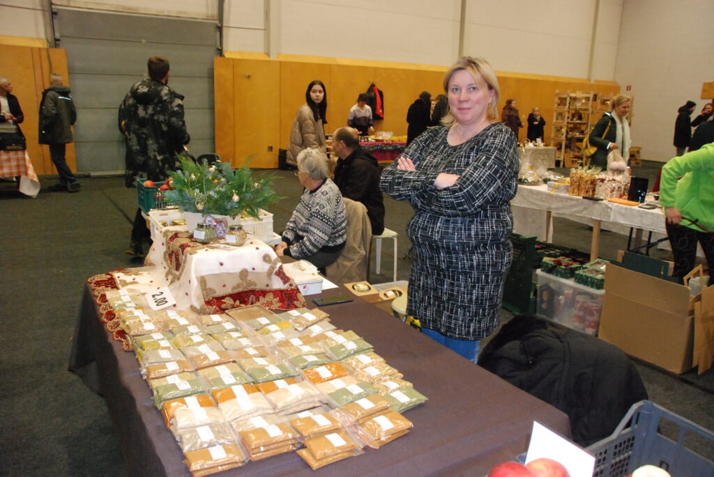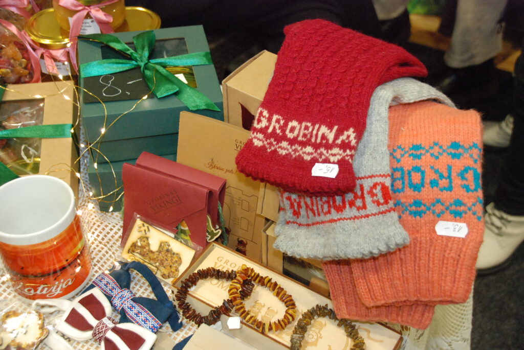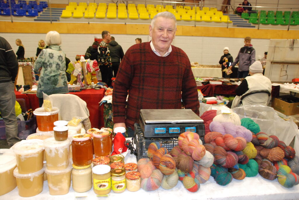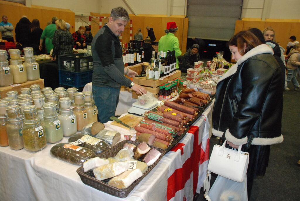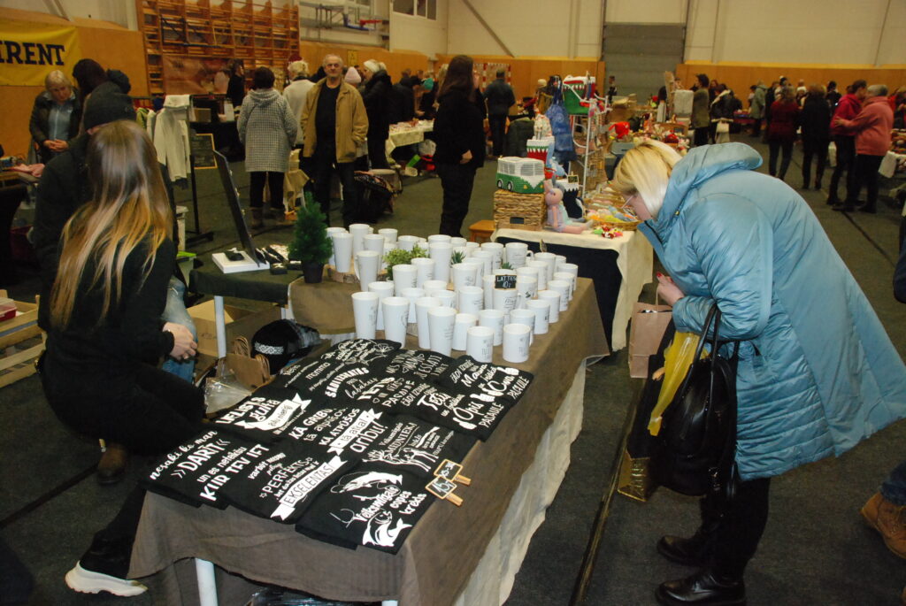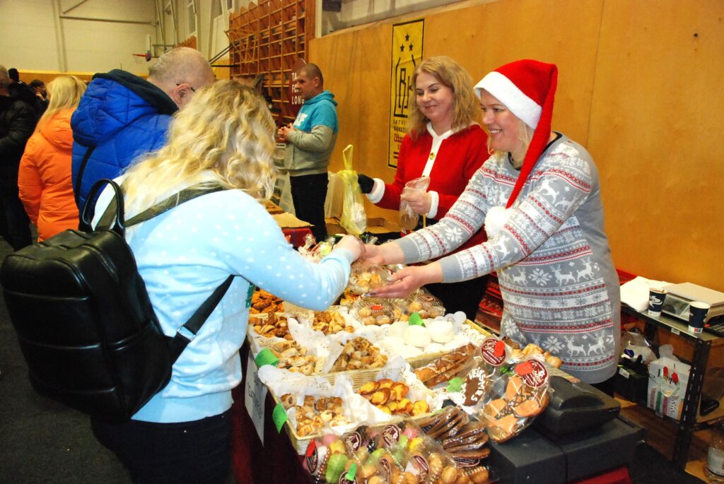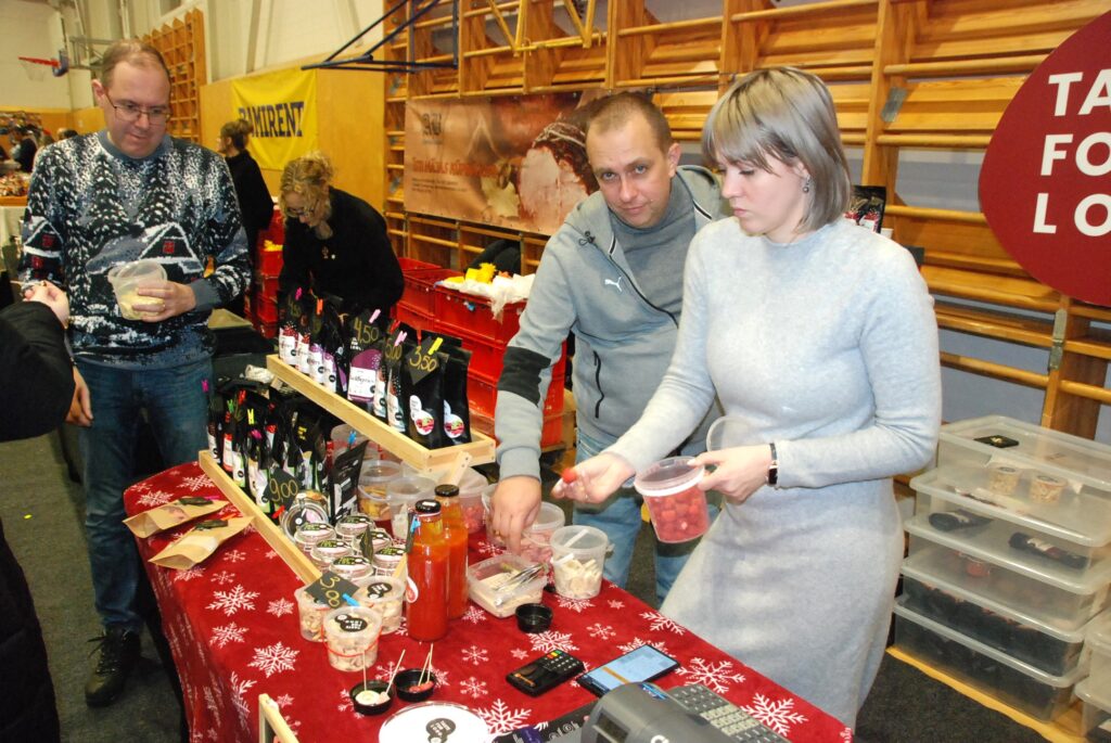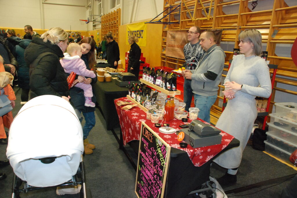 Grobiņas Sporta centra arēna bija piepildīta ar tirgotājiem, kuri piedāvāja gan dažādus gardumus, gan citas lietas gaidāmajiem Ziemassvētkiem.