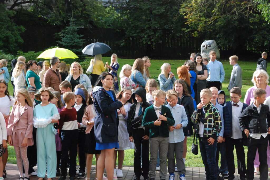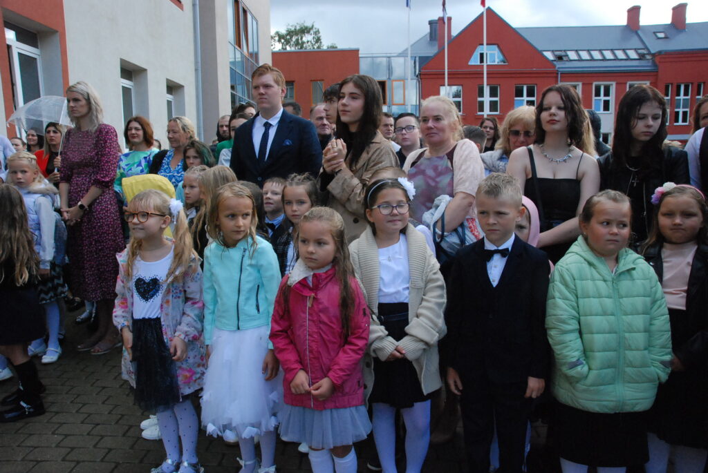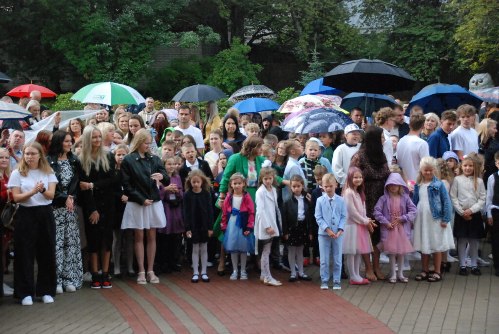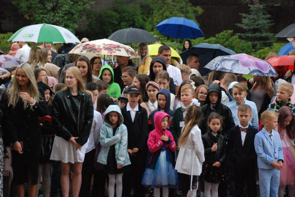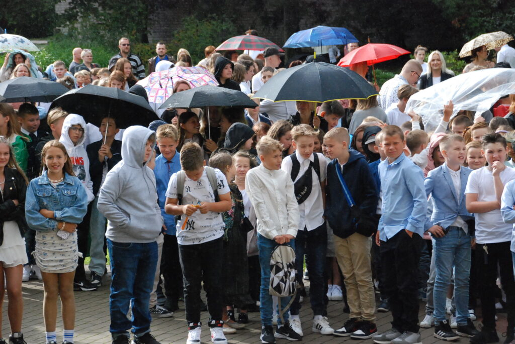Zentas Mauriņas Grobiņas vidusskolas 1. septembra svinīgajā pasākumā skolēnus šogad laikapstākļi nelutināja.
