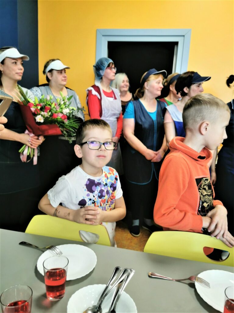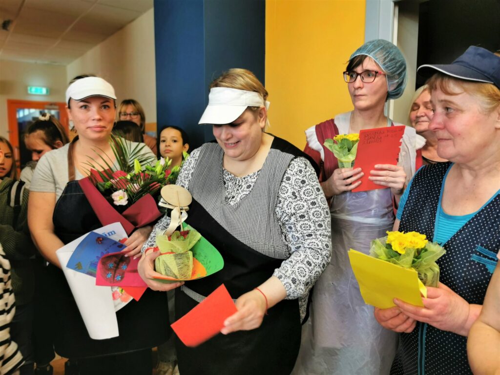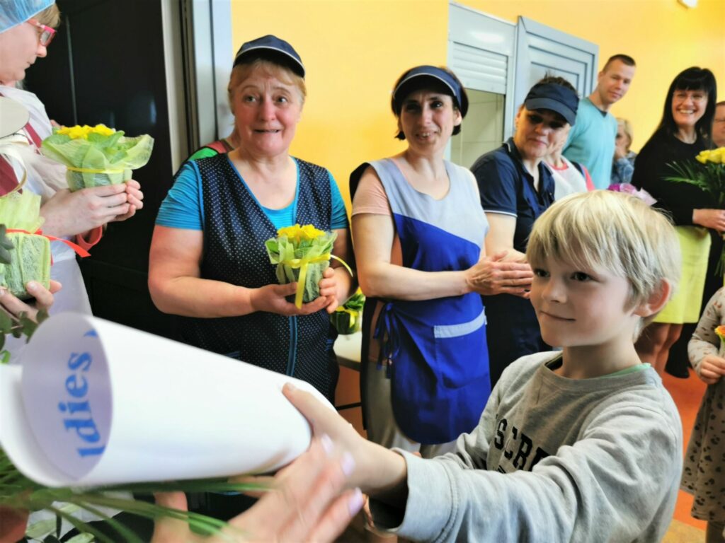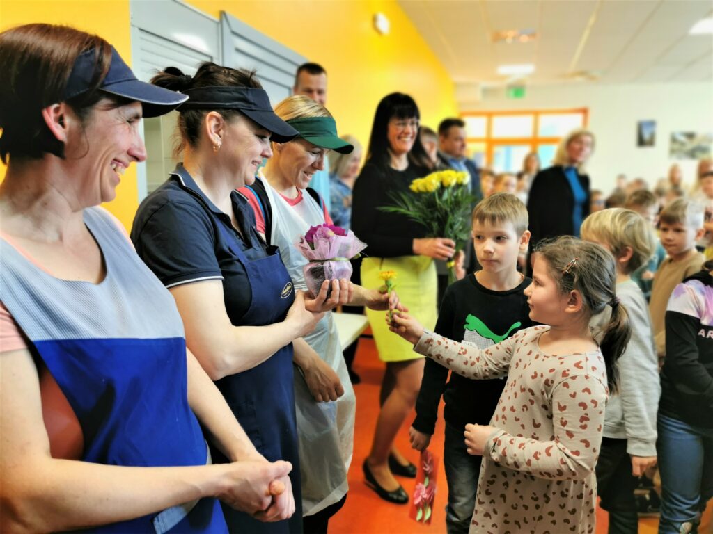 Visu ēdinātāju komandu ar īpaši šai reizei sagatavotu plakātu, dziesmu, ziediem, skaļu paldies un sirsnīgiem, ilgiem aplausiem sveica arī skolēni.