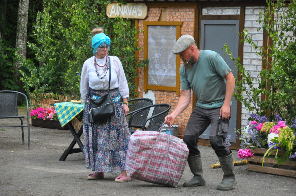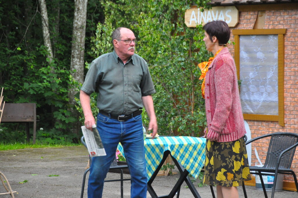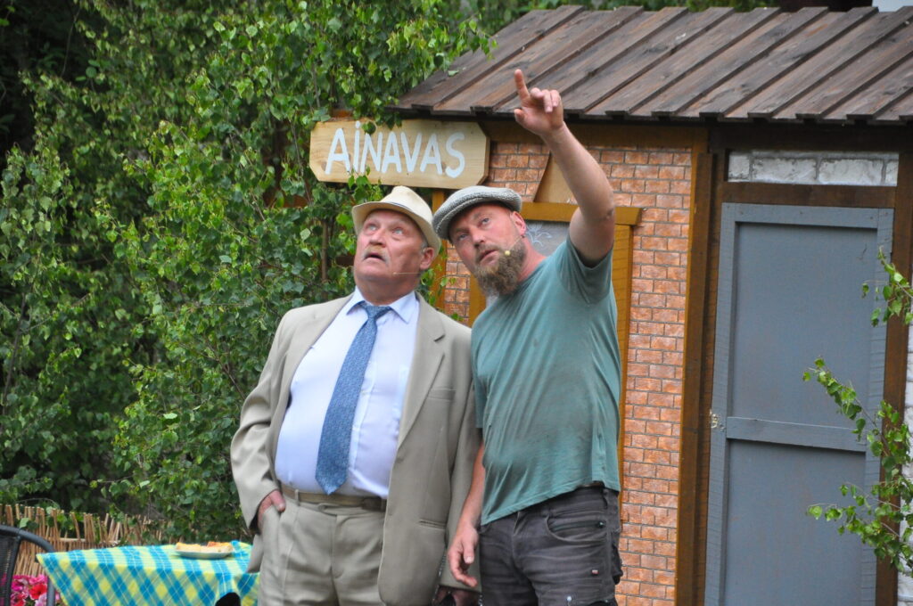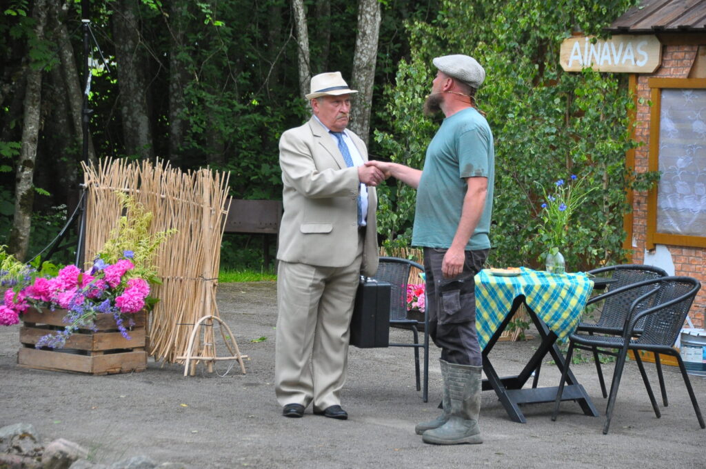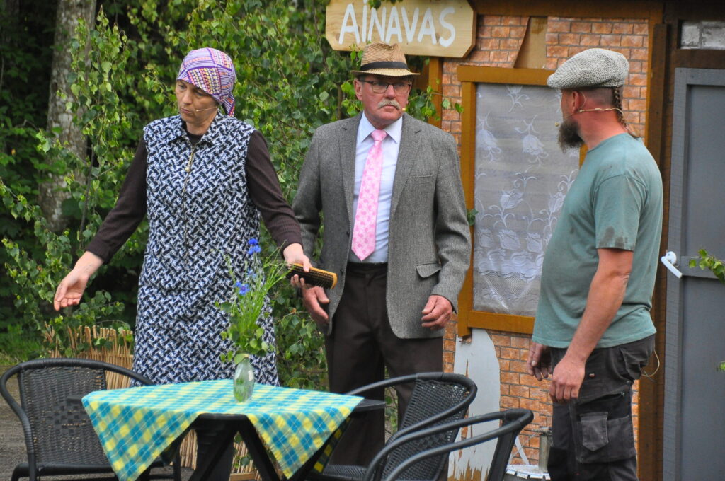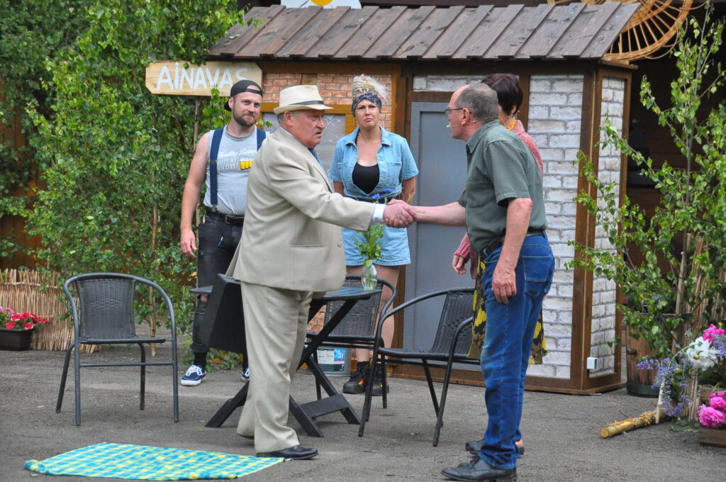 Nepārspējams izrādē bija arī Aizputes Tautas teātra režisors Igors Māters, kurš iejutās Levija Šnicela lomā – “Sāls” bankas kredītdaļas vadītājā. Savukārt saimnieku bērni bija Sindija Ruzaiķe un Elgars Jonass.