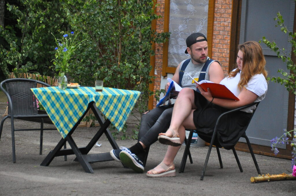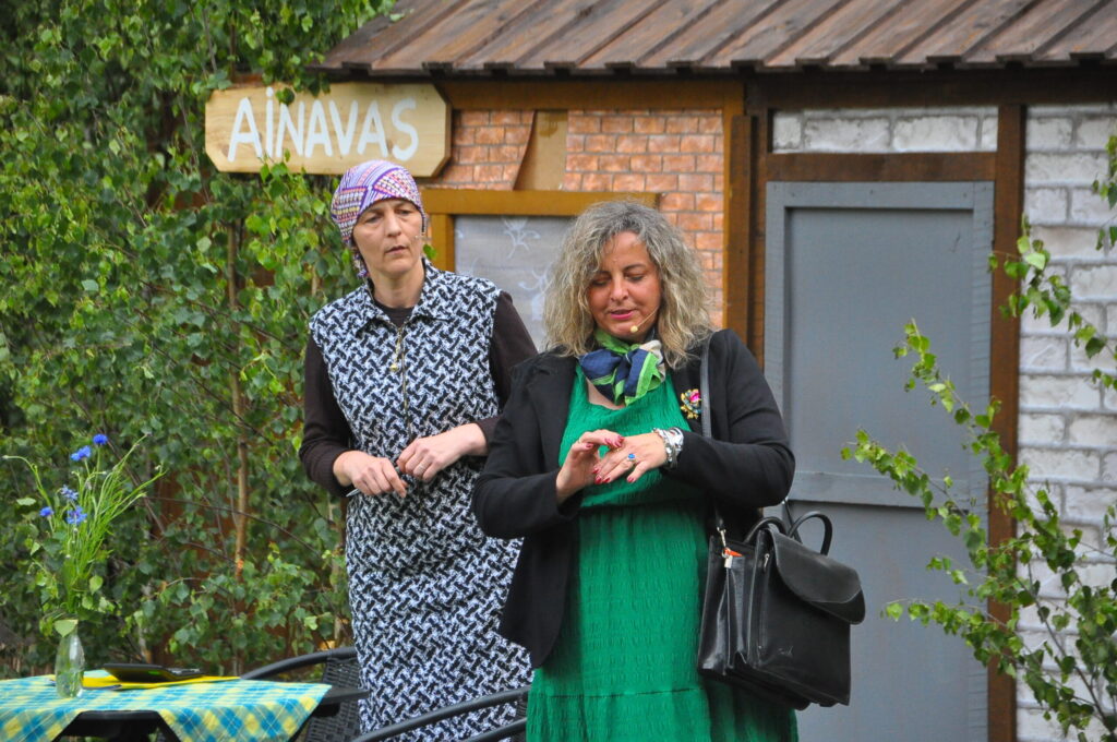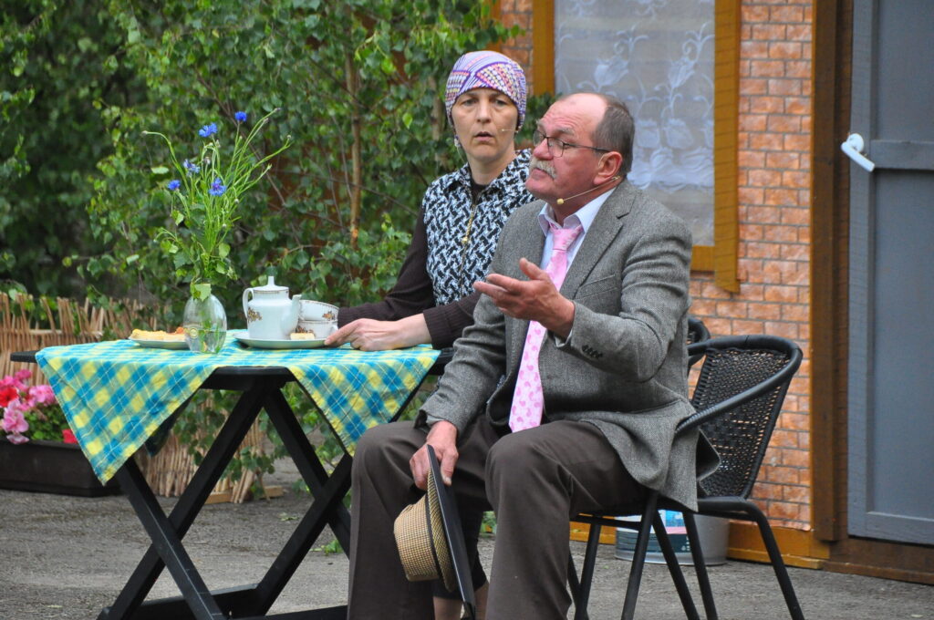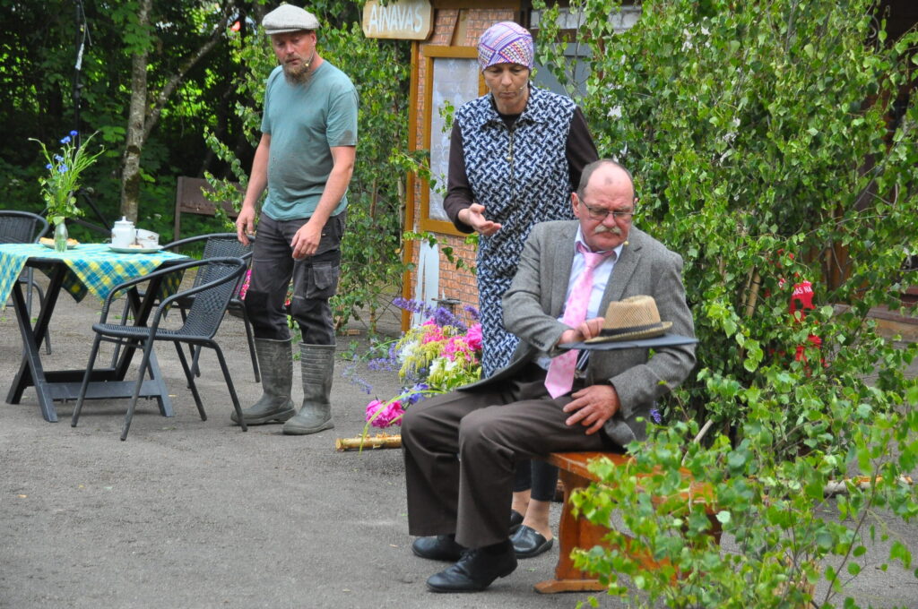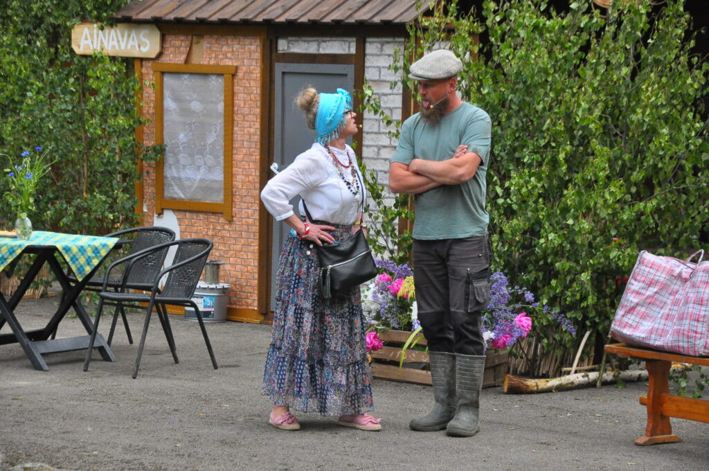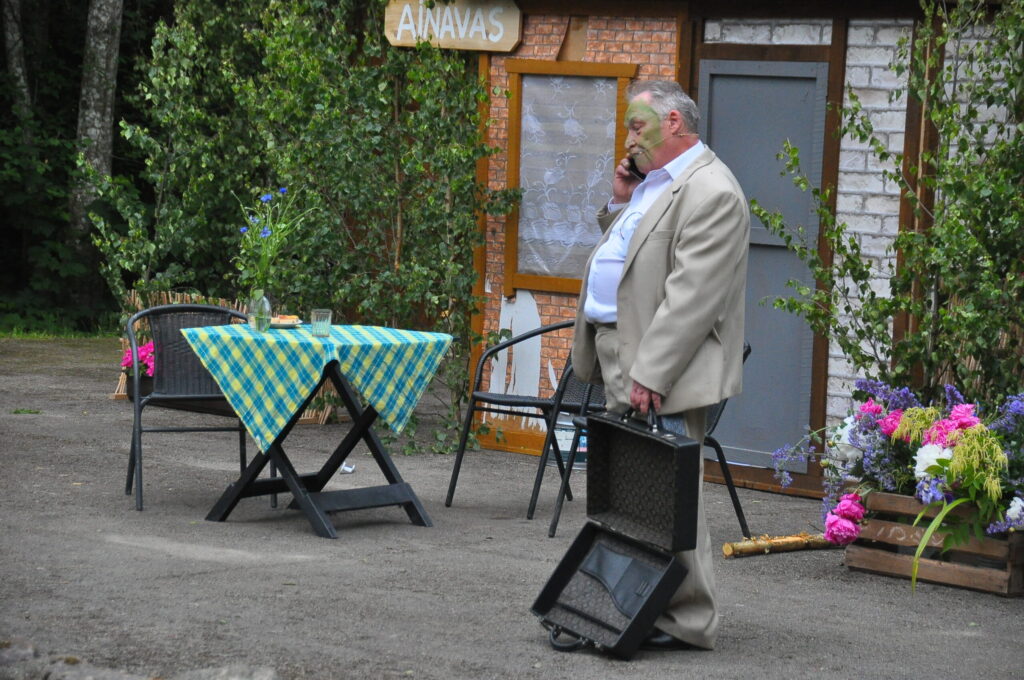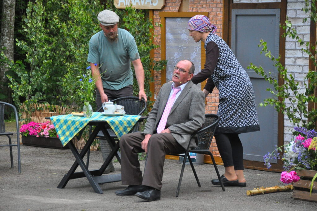 Nepārspējams izrādē bija arī Aizputes Tautas teātra režisors Igors Māters, kurš iejutās Levija Šnicela lomā – “Sāls” bankas kredītdaļas vadītājā. Savukārt saimnieku bērni bija Sindija Ruzaiķe un Elgars Jonass.