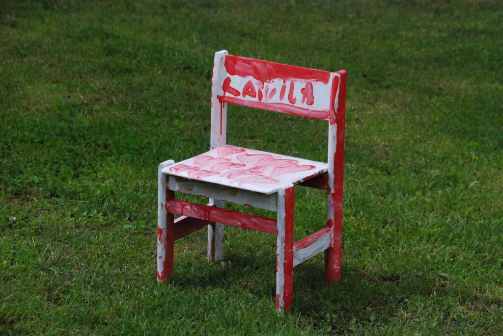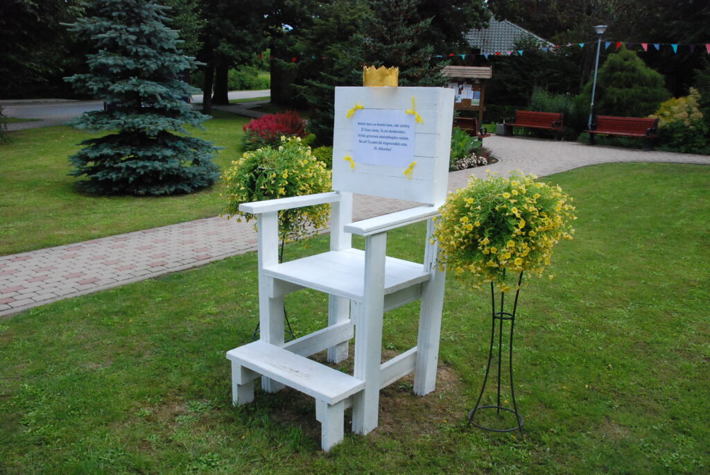 “Pat meitene, kas dzīvo Somijā, bet ir durbeniece, atbrauca ciemos un paspēja divus krēslus uztaisīt. Krēsls ir visiem dzīves gadījumiem, no mūža sākuma līdz beigām. Lielais baltais krēsls ir domāts kā varenais durbenieku krēsls. Tas mums ir pašā centrā goda vietā, kurā ikviens var iesēsties, nofotogrāfēties un justies kā īsts Durbes saimnieks,” stāsta D. Veilande.