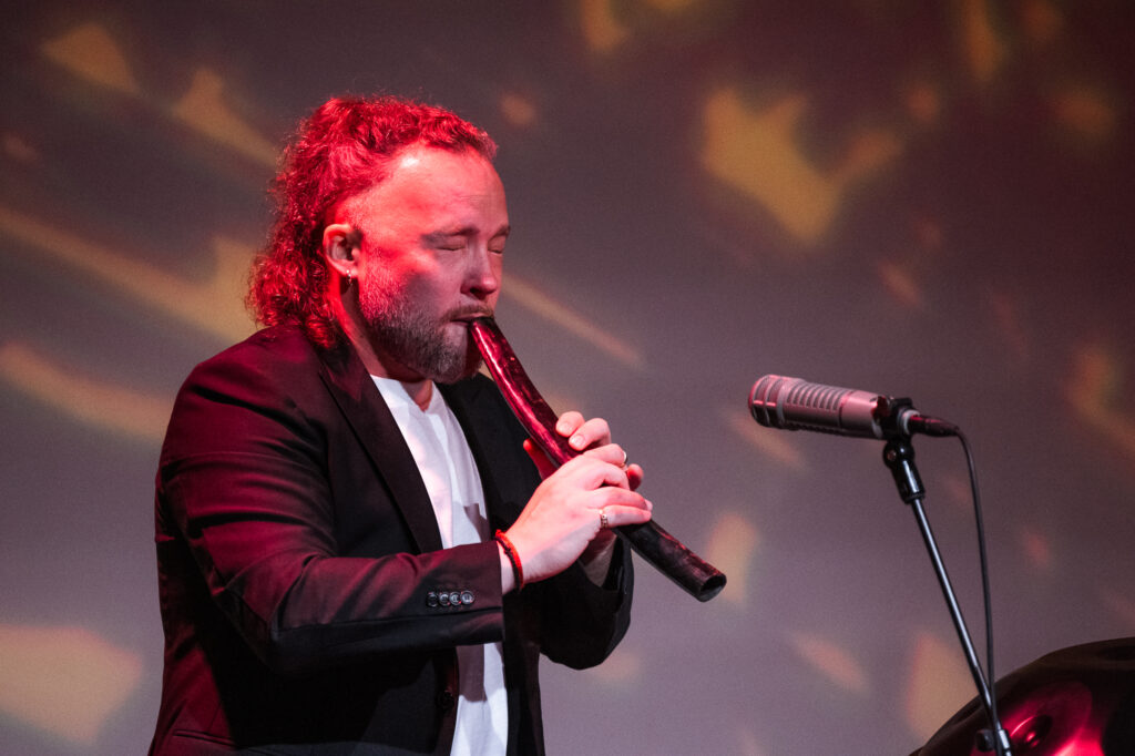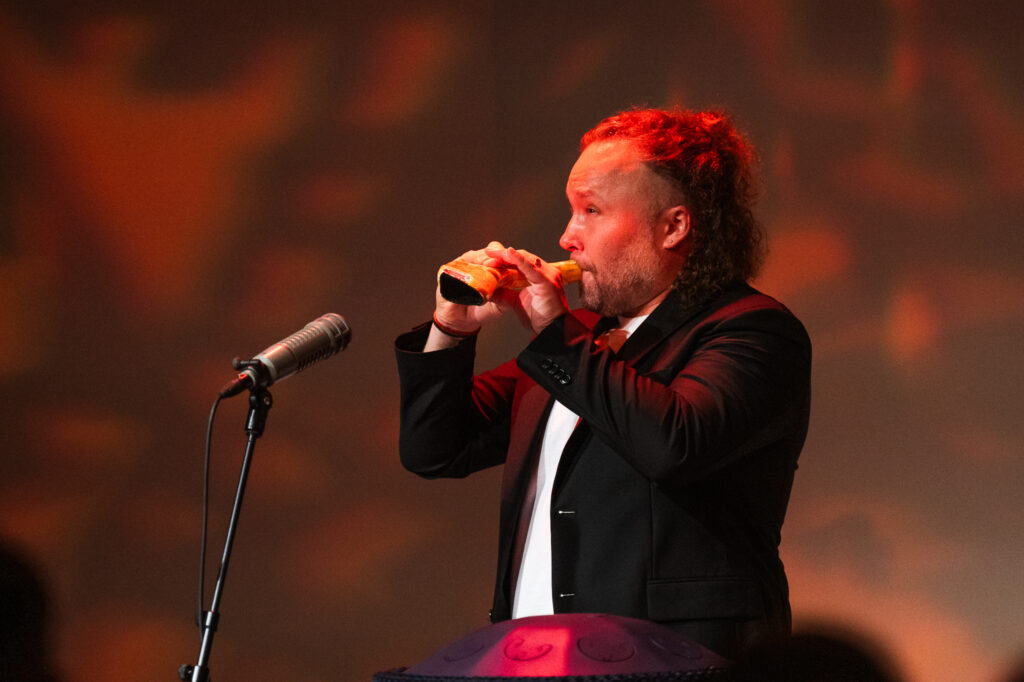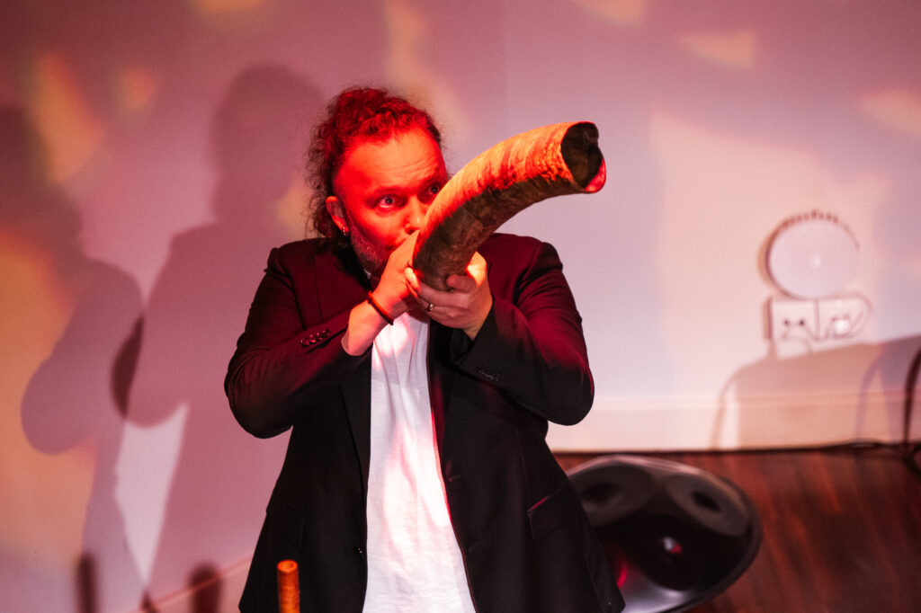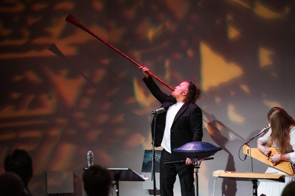 Mūziķa meistarīgajā atskaņojumā apmeklētāji tika iepazīstināti ar ragu ar dzintara inkrustācijām, hulusi, trompeti, duduku, bansuri, dažādiem ragiem, luru jeb senu skandināvu tauri, koka trompeti, hangu, neju u. c. Pirms skaņdarba “Mariana” atskaņošanas multiinstrumentālists dalījās stāstā par savu jaunāko instrumentu, hangam līdzīgo meditatīvo zvangu: “Es viņu saucu par “ceptuvi”. Šis instruments izmainīja manu dzīvi. Man ir 100 flautas, 30 brasa pūšaminstrumenti un 100 dažādi ragi. Taču tuvojas ziemas melanholija un man vajadzēja ko jaunu. Šis man ir kā D vitamīna deva. Rekomendēju ikvienam šo instrumentu, jo tas dod vislabāko terapiju.”