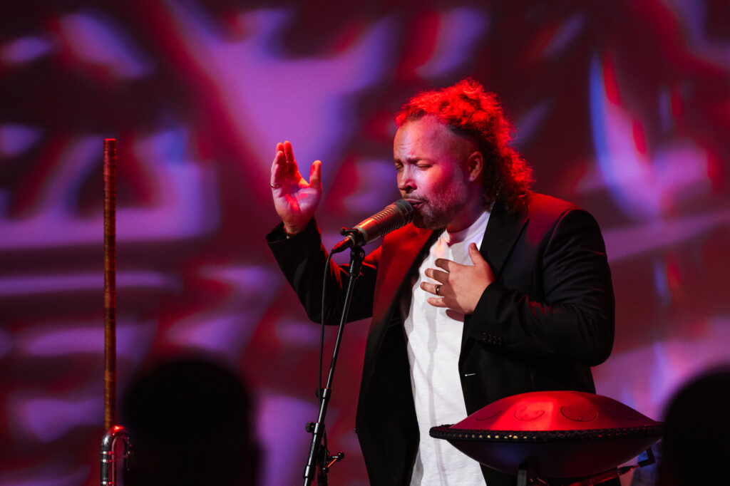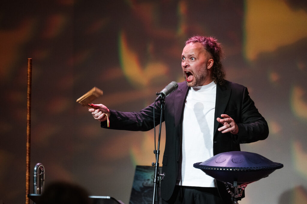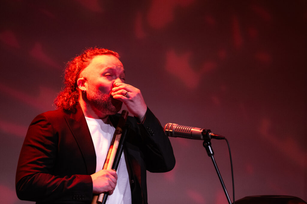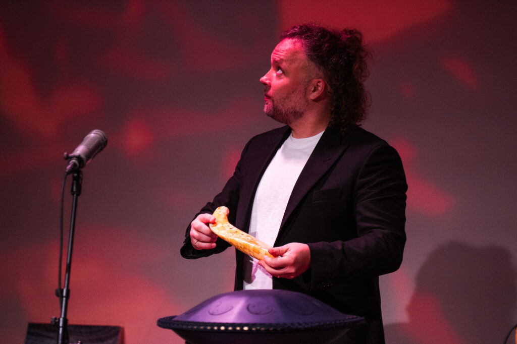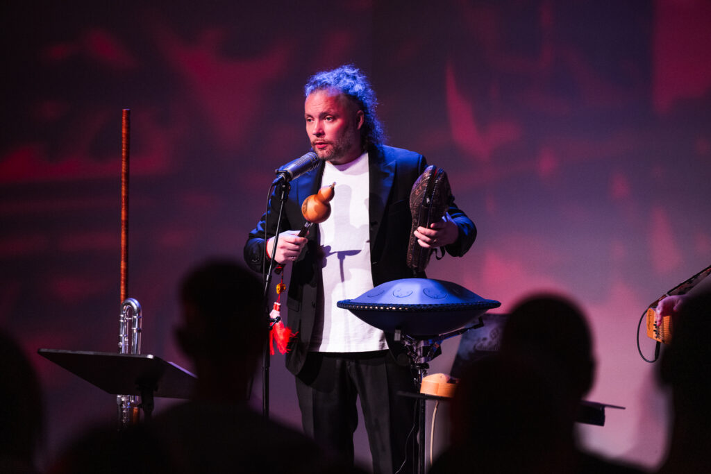 Mūziķa meistarīgajā atskaņojumā apmeklētāji tika iepazīstināti ar ragu ar dzintara inkrustācijām, hulusi, trompeti, duduku, bansuri, dažādiem ragiem, luru jeb senu skandināvu tauri, koka trompeti, hangu, neju u. c. Pirms skaņdarba “Mariana” atskaņošanas multiinstrumentālists dalījās stāstā par savu jaunāko instrumentu, hangam līdzīgo meditatīvo zvangu: “Es viņu saucu par “ceptuvi”. Šis instruments izmainīja manu dzīvi. Man ir 100 flautas, 30 brasa pūšaminstrumenti un 100 dažādi ragi. Taču tuvojas ziemas melanholija un man vajadzēja ko jaunu. Šis man ir kā D vitamīna deva. Rekomendēju ikvienam šo instrumentu, jo tas dod vislabāko terapiju.”