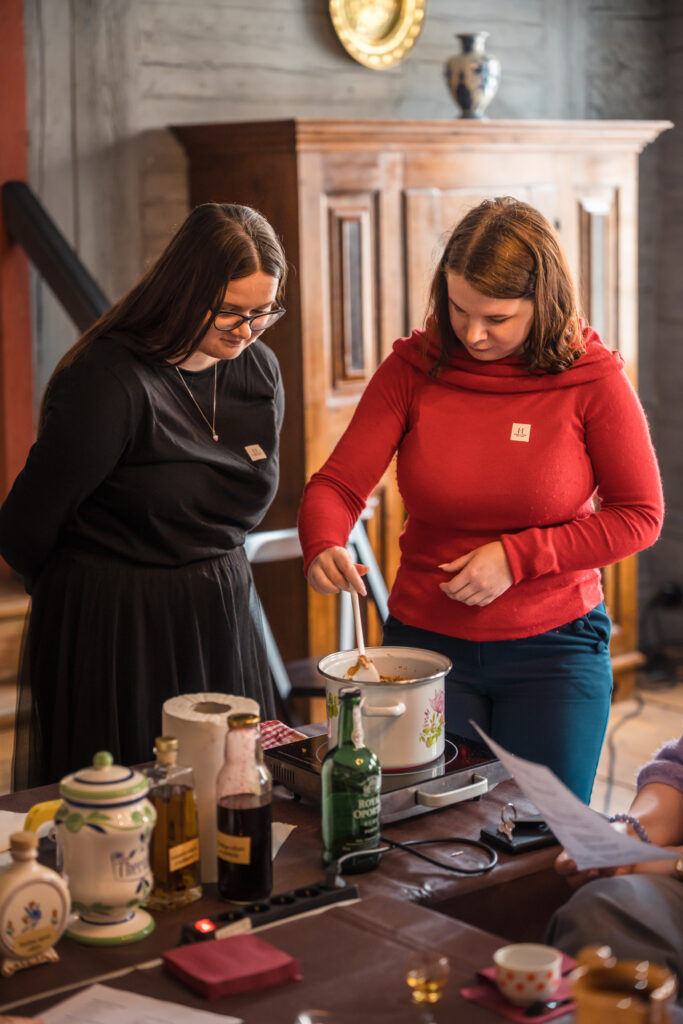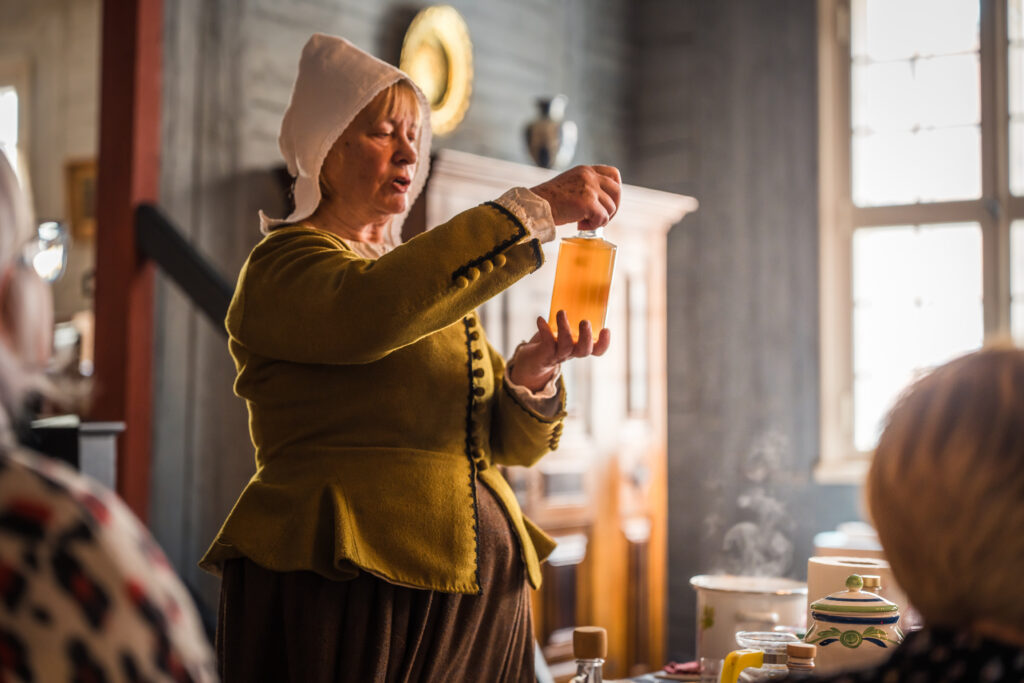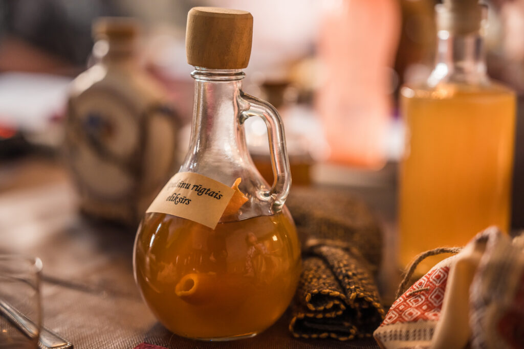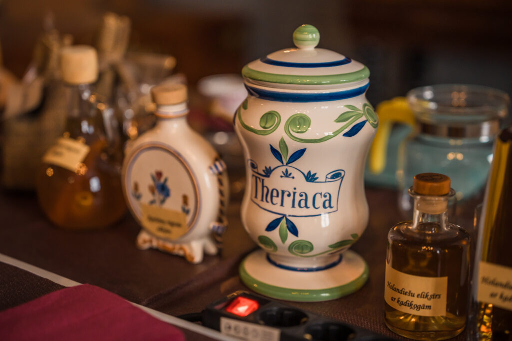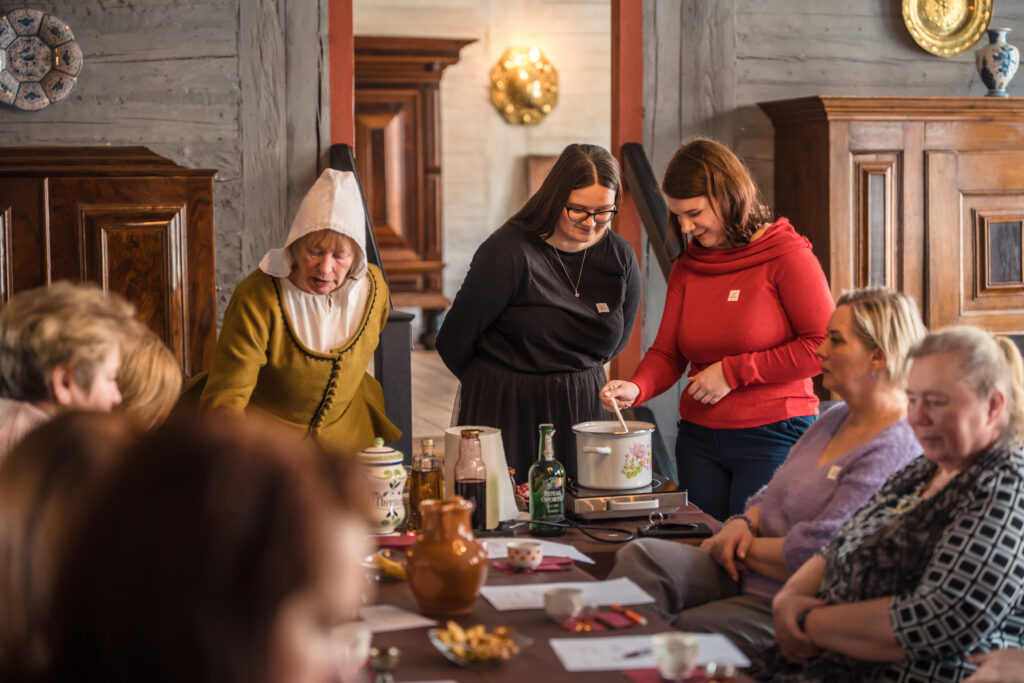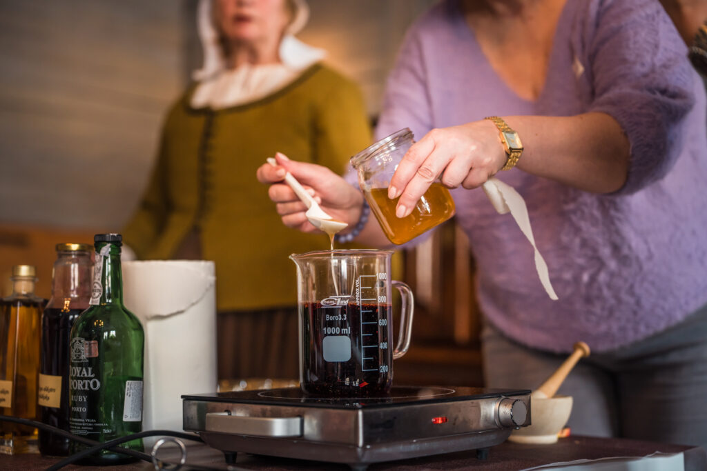 “Holandiešu veselības eliksīru” darbnīcā dalībniekiem bija iespēja uzzināt, kā mūsdienās mājas apstākļos gatavot veselības tonikus, kuru pamatā ir vēsturiskās receptes un eliksīru pagatavošanas tehnoloģijas. Klātesošajiem bija iespēja pagatavot un nogaršot kopumā septiņu veidu veselības eliksīrus, kuru gatavošanā izmantotas ogas, ziedi un garšvielas, tostarp holandiešu eliksīru ar kadiķogām, teriaku, kadiķu eliksīru ar plūškoku. muskatvīnu, kā arī citus, portālu “ReKurZeme” informē Liepājas muzeja struktūrvienības Liepājas 17.-19.gs. interjera muzejs “Hoijeres kundzes viesu nams” vadītāja Ieva Dzintare.