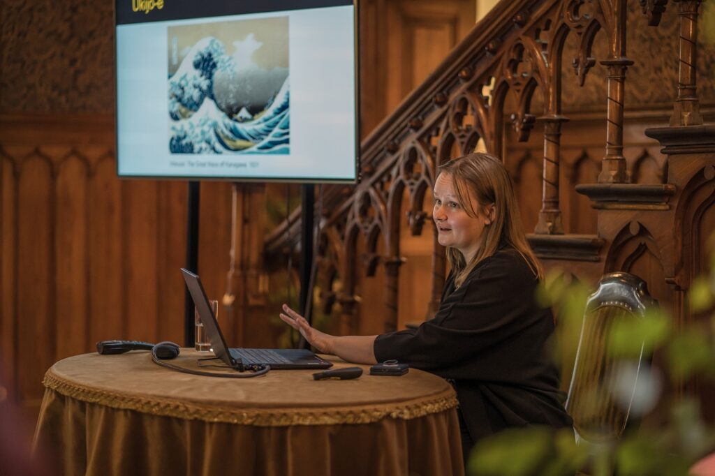 Sarunas laikā Kristīne Milere sniedza ieskatu Japānas vēsturē, aplūkoja galvenos mākslas virzienus Japānā, Japānas keramiku un porcelānu, kā arī runāja par lakas priekšmetiem. Lektore ar vizuālu piemēru demonstrēšanu, pastāstīja par Japānas glezniecību un grafiku, galvenās atšķirības starp tām, kā arī Japānismu un tā ietekmi Eiropā un Latvijā.