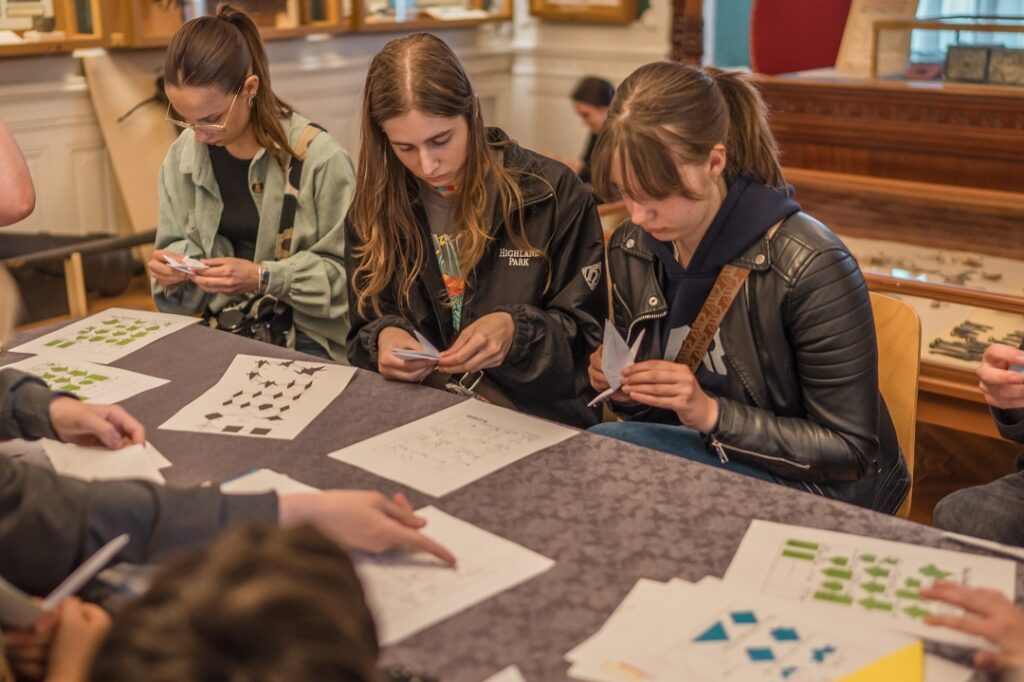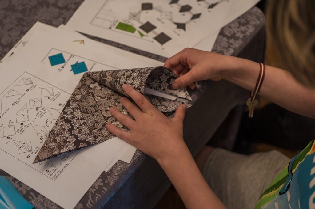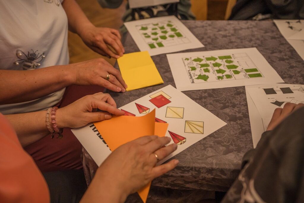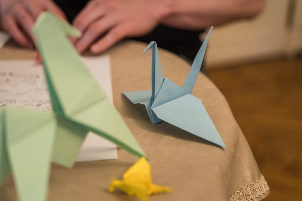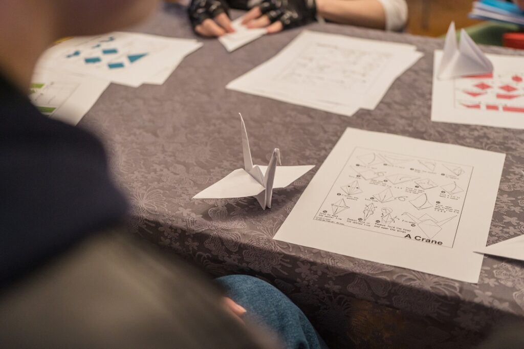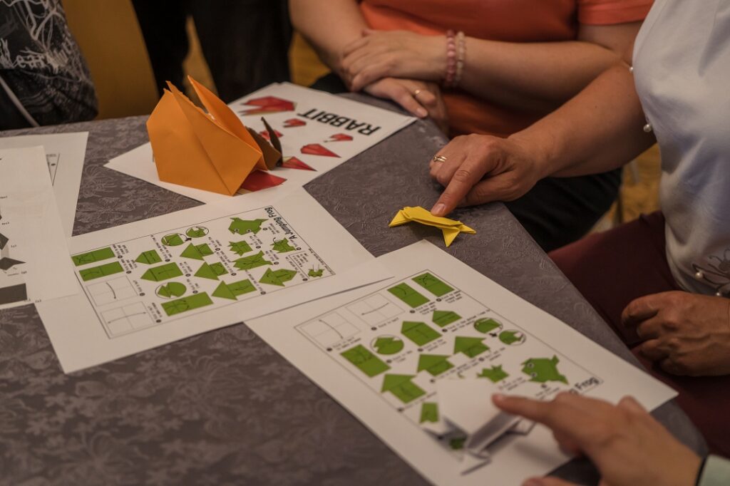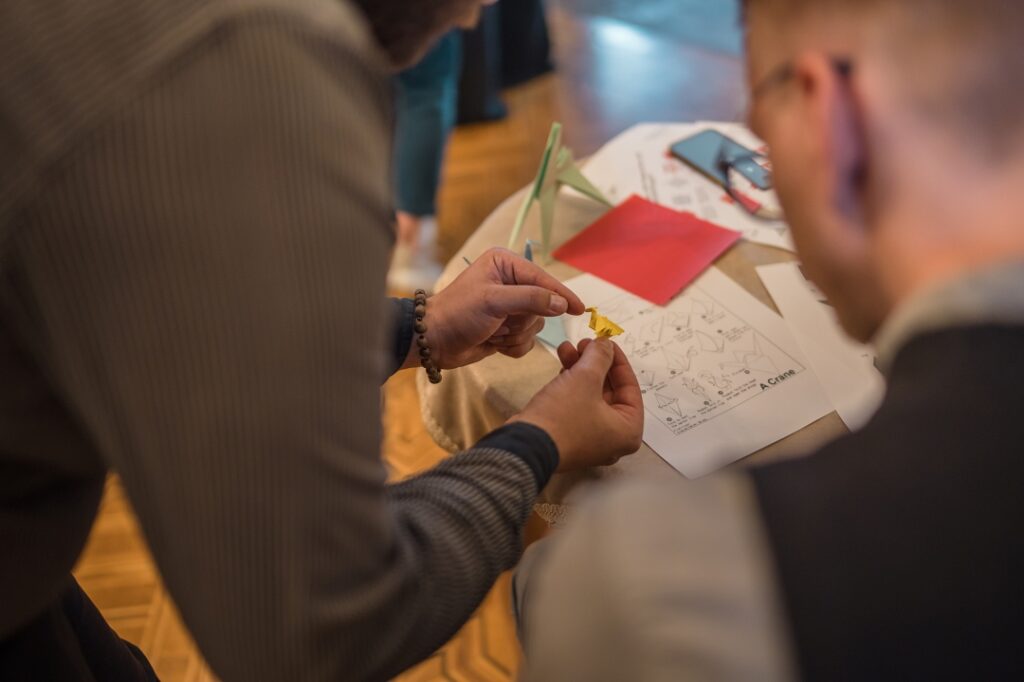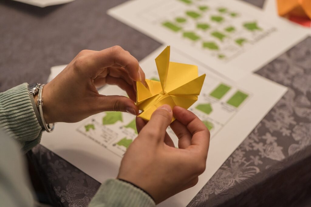 Lekcijas noslēgumā tika aizvadīta origami radošā darbnīca, kurā, atbilstoši prasmēm vai pacietībai, dalībnieki iemēģināju roku dažādu formu – vardes, dzērves, lilijas, truša, laternas, pūķa, zirga – un citu origami mākslas darbu veidošanā. Kā novēroja darbnīcas vadītājs Gustavs Zālītis, darbi izdevās lieliski.