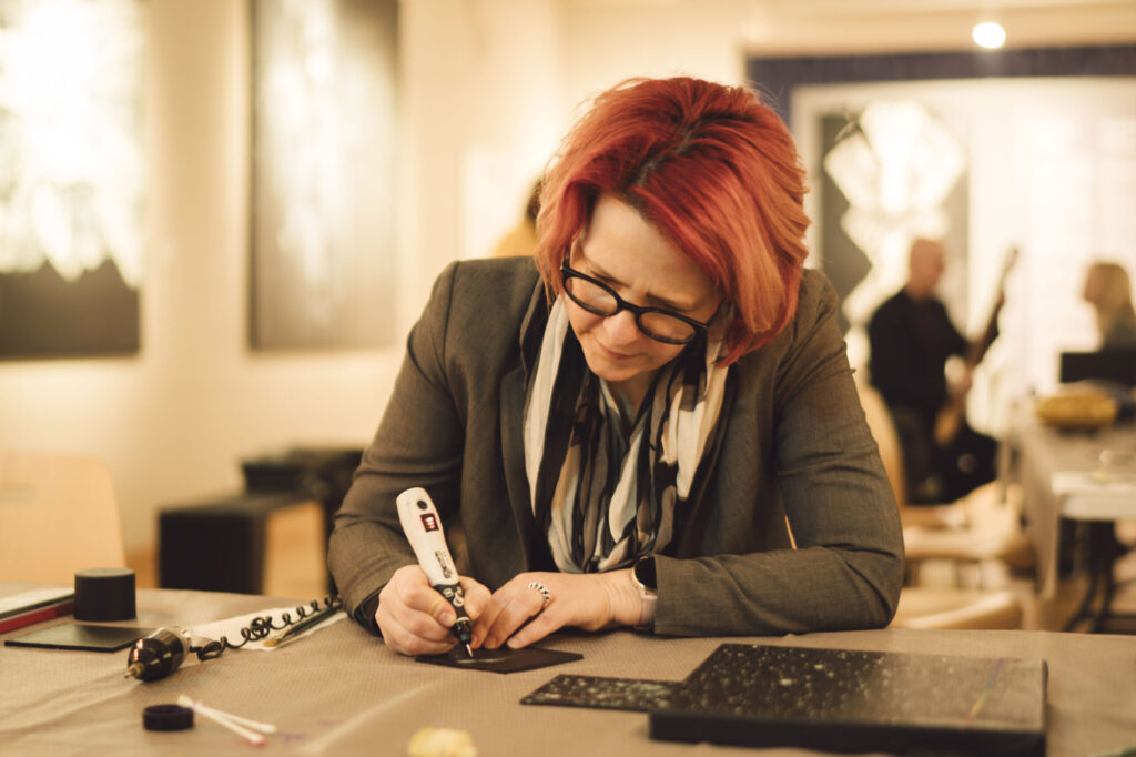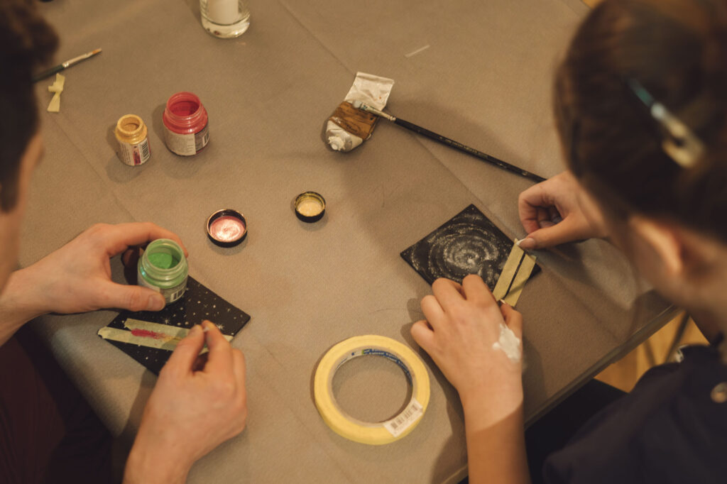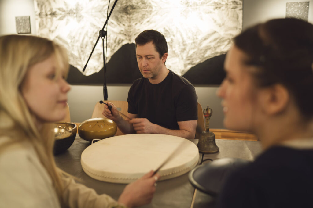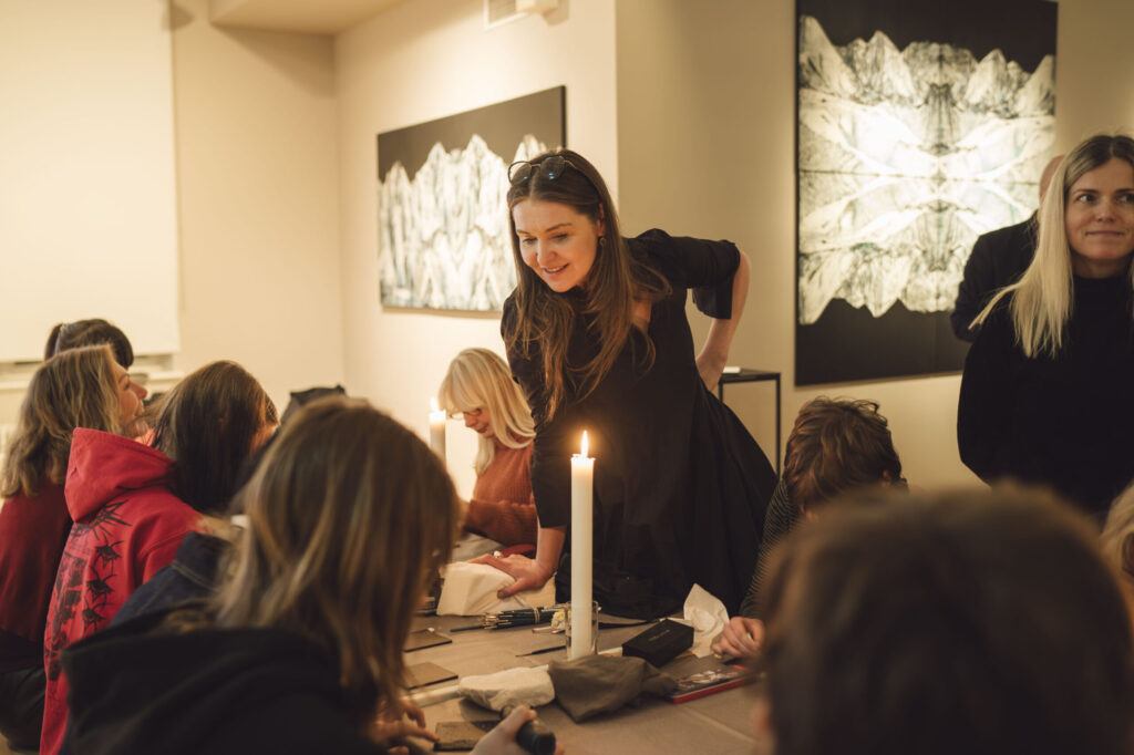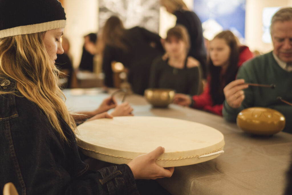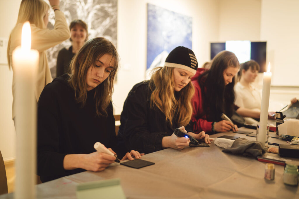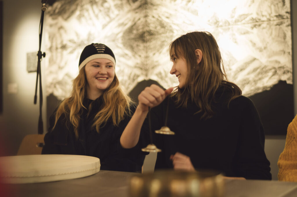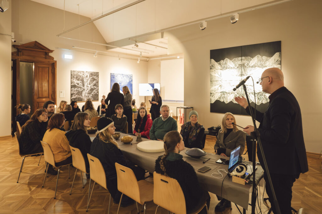 Meistarklase kļuva par kopizstādes “Visuma pieskāriens” praktisku turpinājumu – kopīgu klātbūšanu klusumā un sarunās, vērojumā un procesā, kur glezniecība un skaņa savijās vienotā pieredzē.