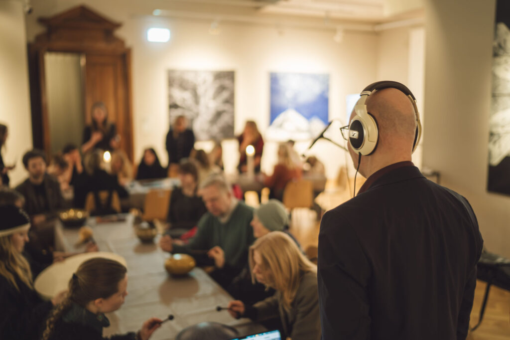 Sarunās pirms meistarklases māksliniece Agate Apkalne dalījās savā radošajā darbā – atziņu gleznošanā un intensīvā klātbūtnē, kas nereti var ilgt līdz pat 20 stundām dienā. Savukārt Kristaps Grasis iepazīstināja ar ikdienas darbu skaņu ierakstu studijā, skaņas instrumentiem izstādē, īpašu uzmanību pievēršot klusumam kā nozīmīgai pieredzes daļai, nepieciešamībai ļaut skaņai izskanēt, kā arī uzsverot, ka klusuma brīži pastiprina telpas, kustības un materiāla uztveri, ļaujot gan glezniecības, gan skaņrades procesam kļūt lēnākam un apzinātākam.