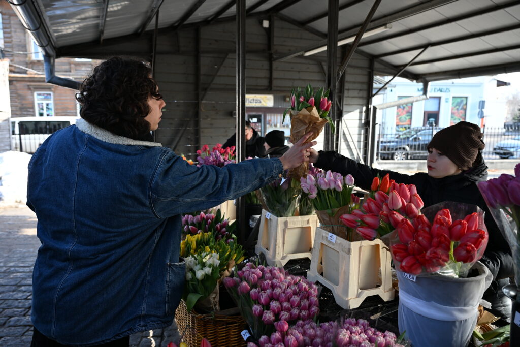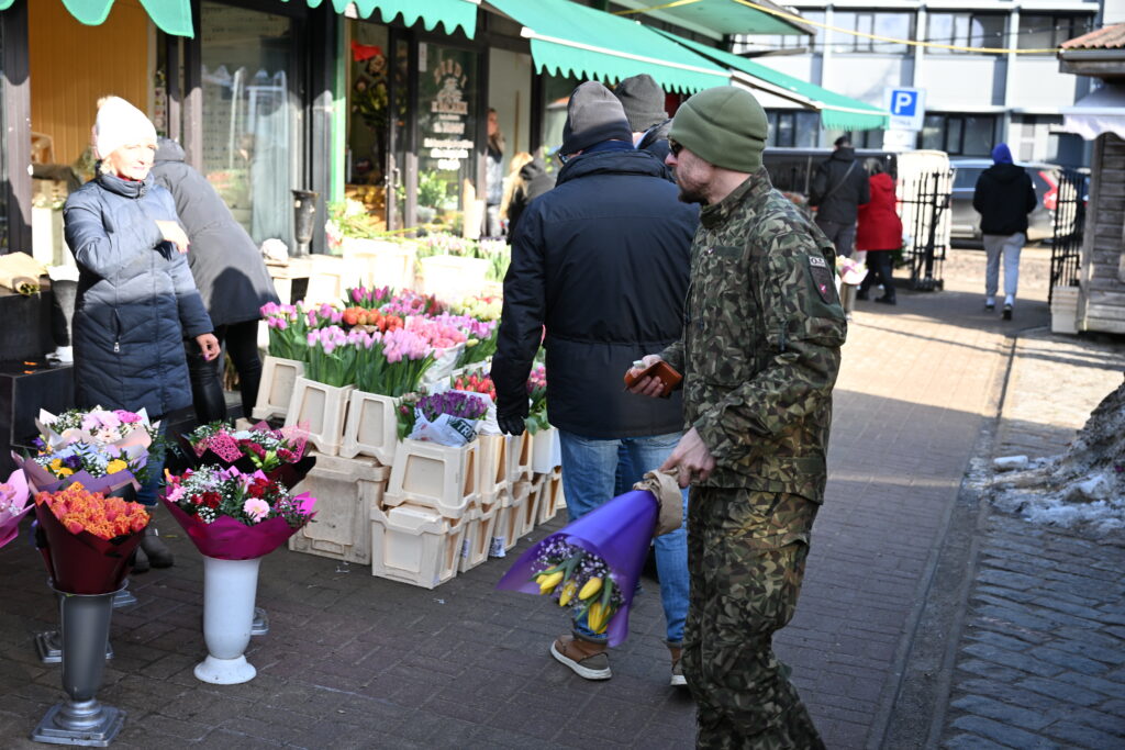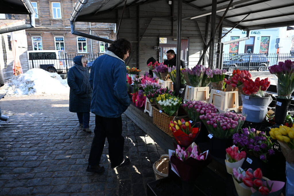 Svētdien, 8. martā, Liepājas Pētetirgū vislielākā rosība valda ziedu stendos, kru vīrieši steidz pirkt skaistākos ziedus dāmām.