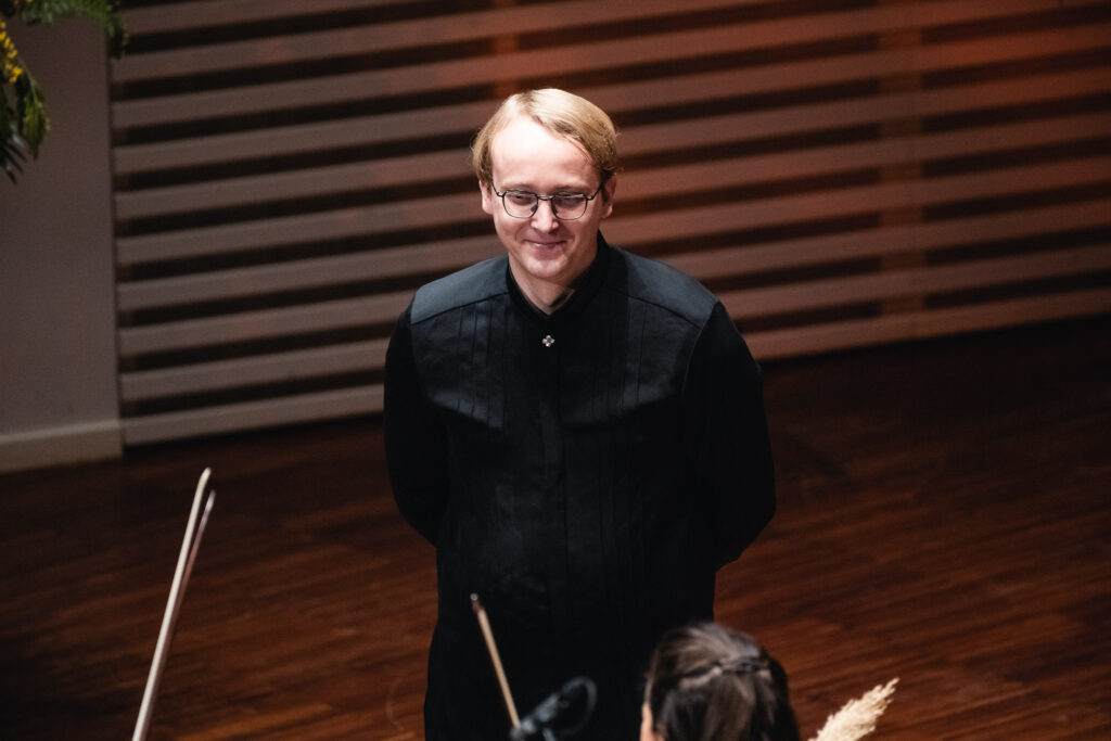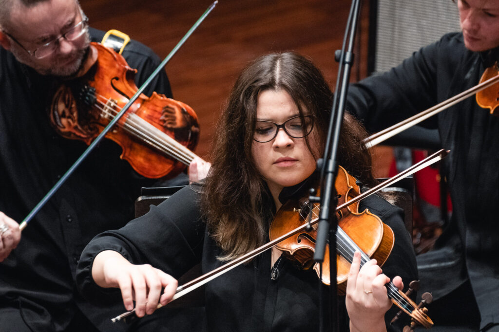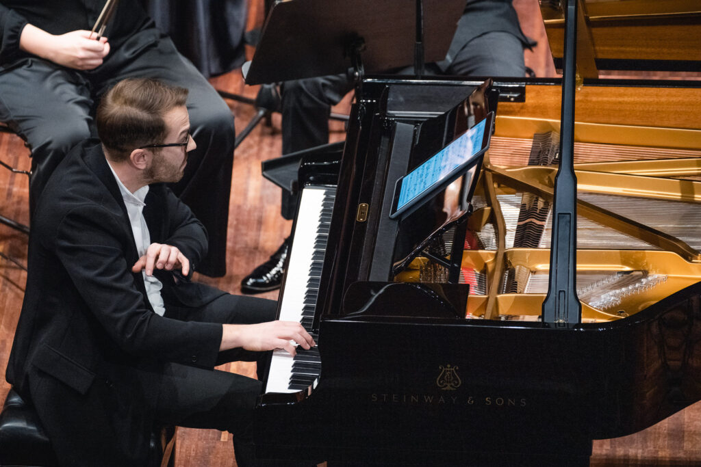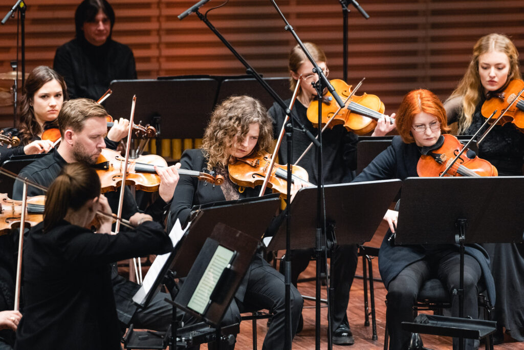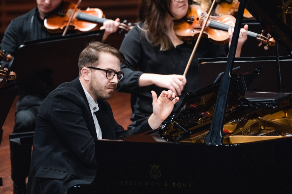 Jaunu strāvojumu orķestra sastāvam piešķīra pianists Adams Kosmeja, kurš melnbaltajos taustiņus ietērpa padomju laika komponista Alfrēda Šnitkes drūmos un vētrainos tēlus “Koncertā klavierēm un stīgām”, aktualizējot cīņu starp tumsu un gaismu un mūžīgos jautājumus par cilvēka eksistenci un dzīves ierobežotību.