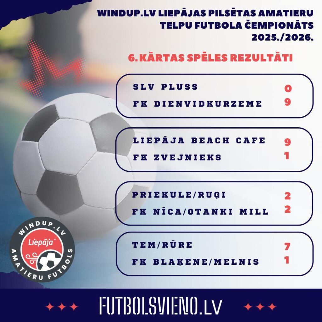 WindUp.lv Liepājas amatieru telpu futbola čempionāts svētdien, 18. janvārī, atgriezās Liepājas Olimpiskajā centrā, bet turnīra tabulas spicē pamanījās atgriezties “TEM/Rūre”, izmantojot to, ka “Priekule/Ruģi” demonstrēja raksturu un atņēma pirmos punktus FK “Nīca/OtankiMILL”. Šalajevs turpina bombardēt, līdz pamatturnīra beigām – viena kārta.