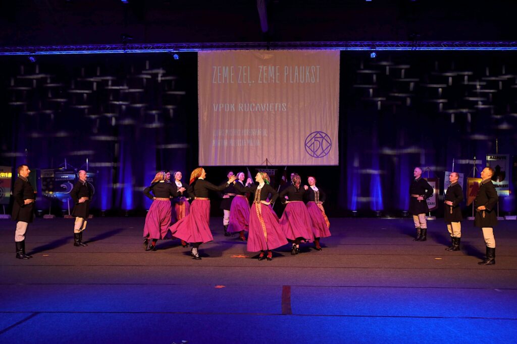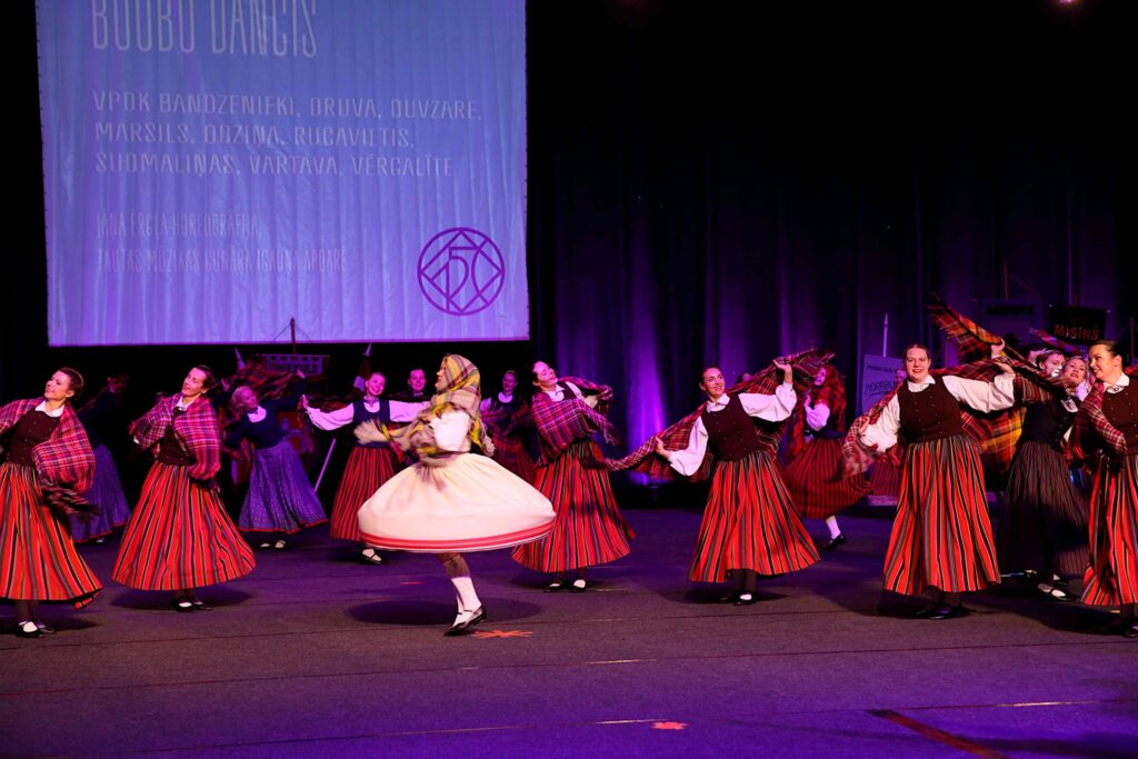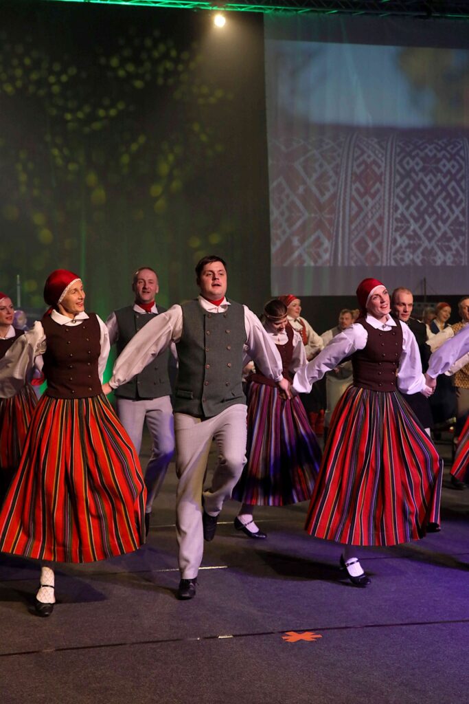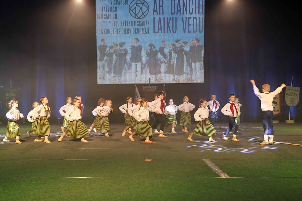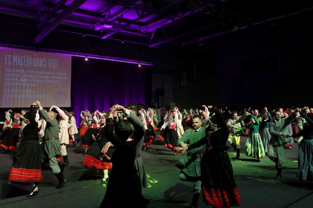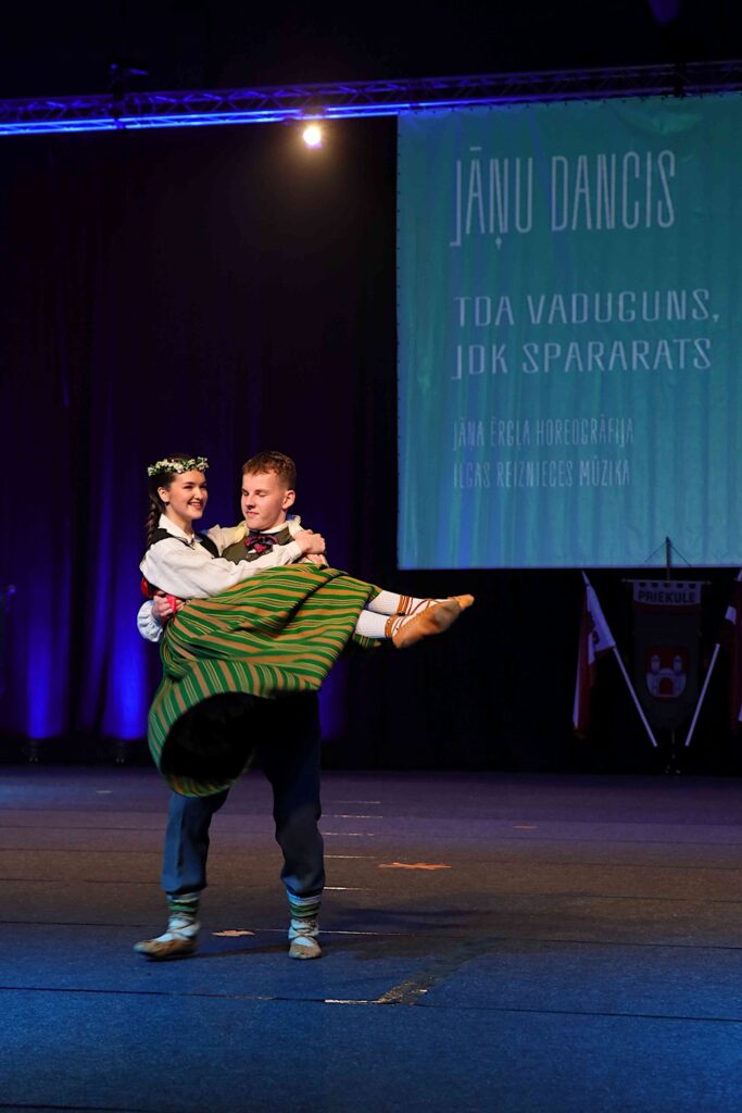 Deju koncerta laikā 25 tautas deju kolektīvi izdejoja koncepcijas autoru un režisoru Madaras Gruntmanes – Dujanas un Kaspara Bērziņa Deju svētku lieluzveduma “Mūžīgais dzinējs” repertuāru un skatuviskās dejas koncerta “Balts” un noslēguma koncerta “Kopā augšup” deju repertuāru, vēsta Dienvidkruzemes novada Kultūras pārvalde.