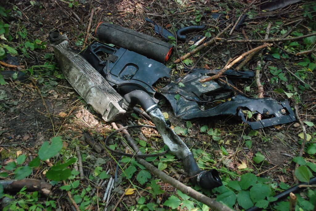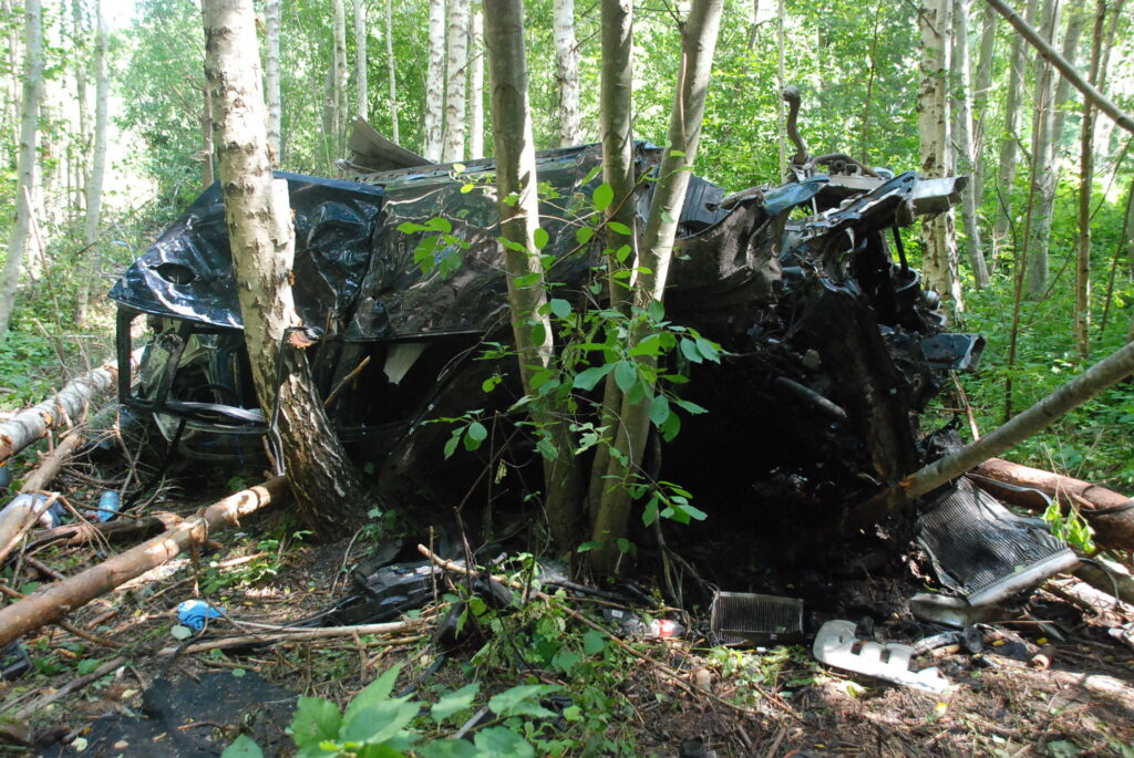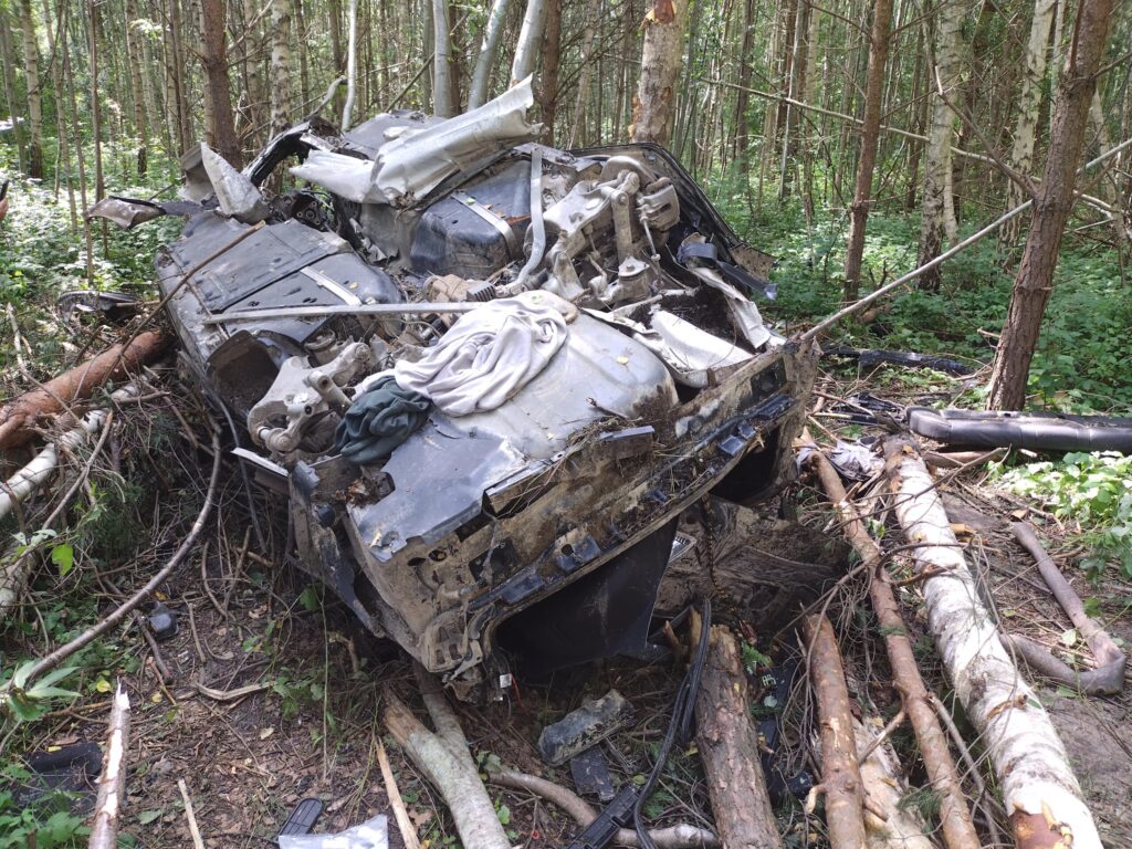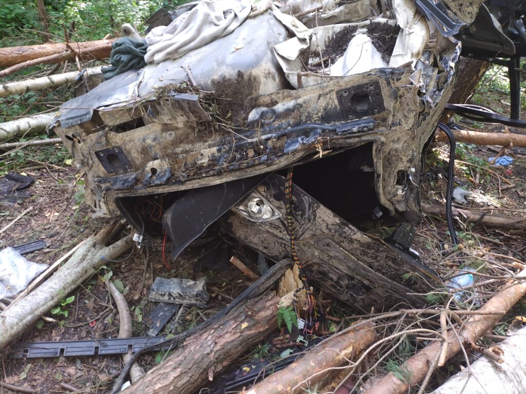 Portāls “ReKurZeme” noskaidroja avārijas vietu un pirmdien pārliecinājās, ka automašīna joprojām atrodas mežā uz jumta. Tā kā lode triekusies mežā, laužot kokus, atduroties apmēram simts metrus no ceļa. Redzams, ka tai ir jau aplasītas detaļas.
