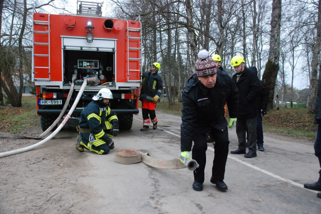 “Šodien praktiskajā daļā galvenie uzdevumi ir ugunsdzēsības inventāra izmantošana, kad ir vairākas ugunsdzēsēju mašīnas. Šī sadarbošanās, kad ir nepieciešama inventāru kopīga lietošana. Kad varam no attālumiem savienot mašīnas virknē un izpildīt komandas,” par vienu no praktiskās daļas uzdevumiem teic pasniedzējs.