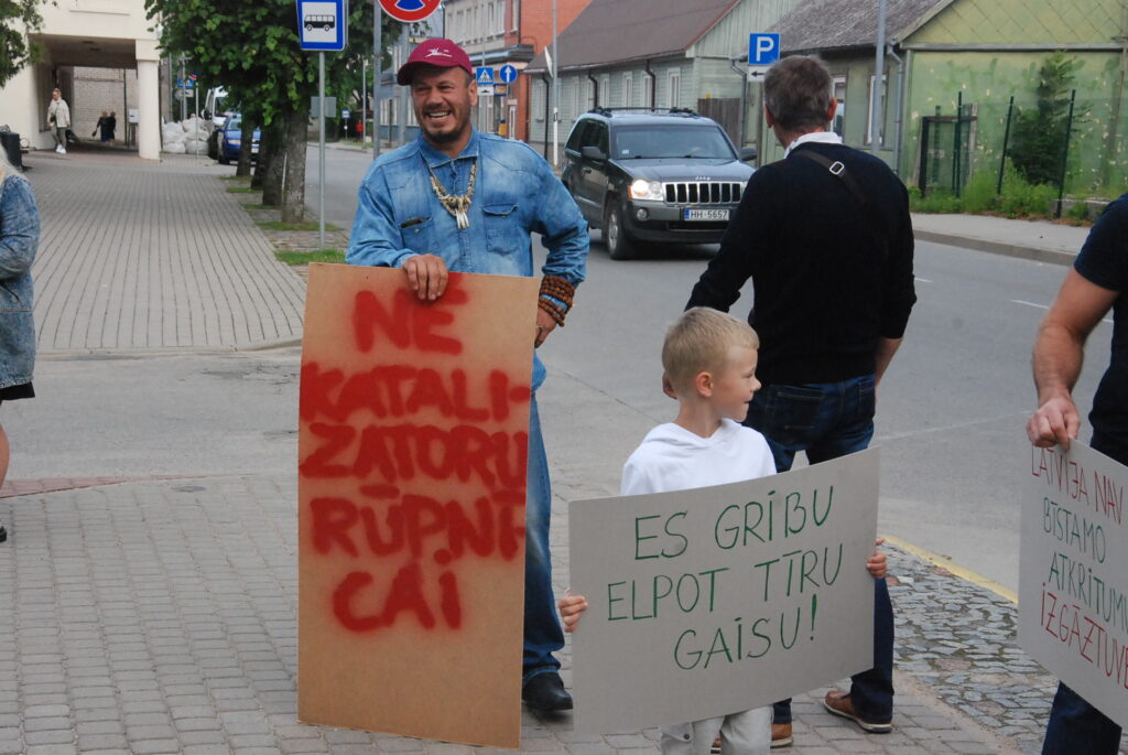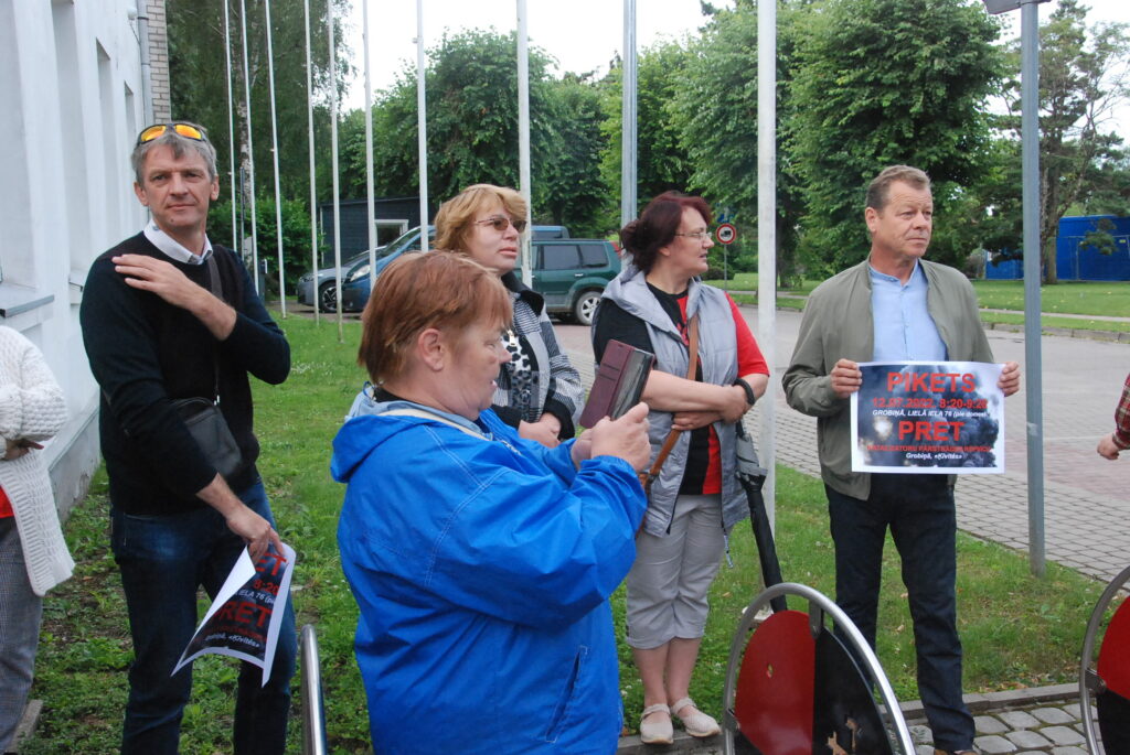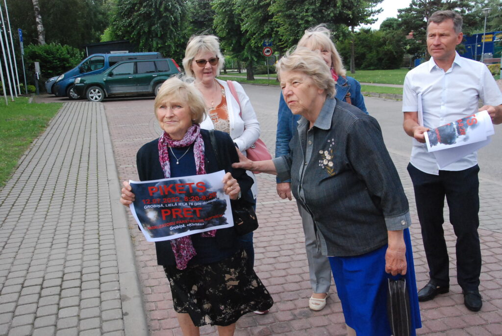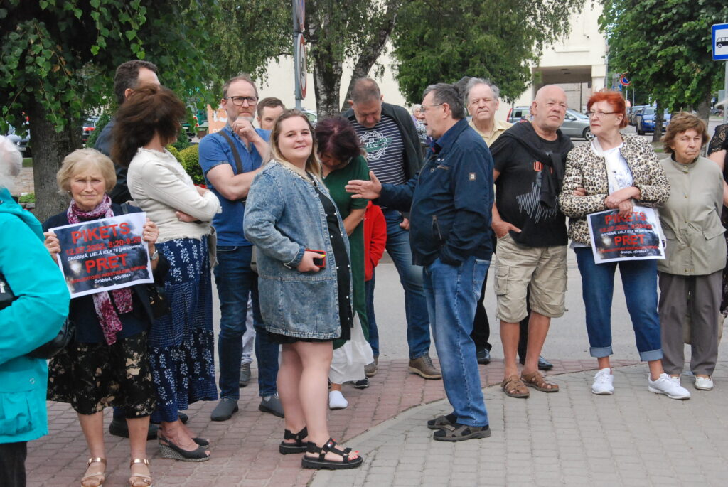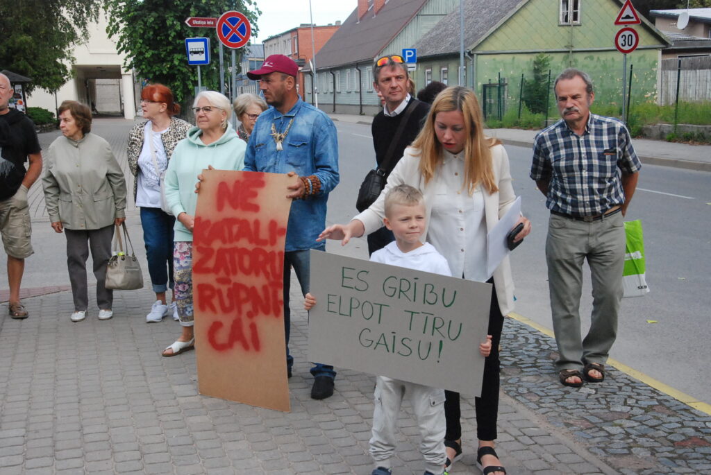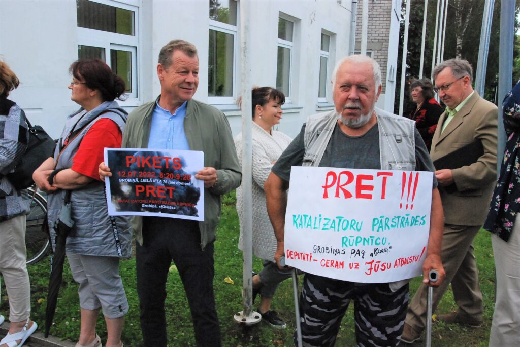 Cilvēki kuplā skaitā otrdienas rītā, 12. jūlijā, pulcējās pie Dienvidkurzemes novada domes, lai piketā paustu savu viedokli par bīstamo atkritumu – izlietoto naftas apstrādes katalizatoru pārstrādes rūpnīcas būvniecību.