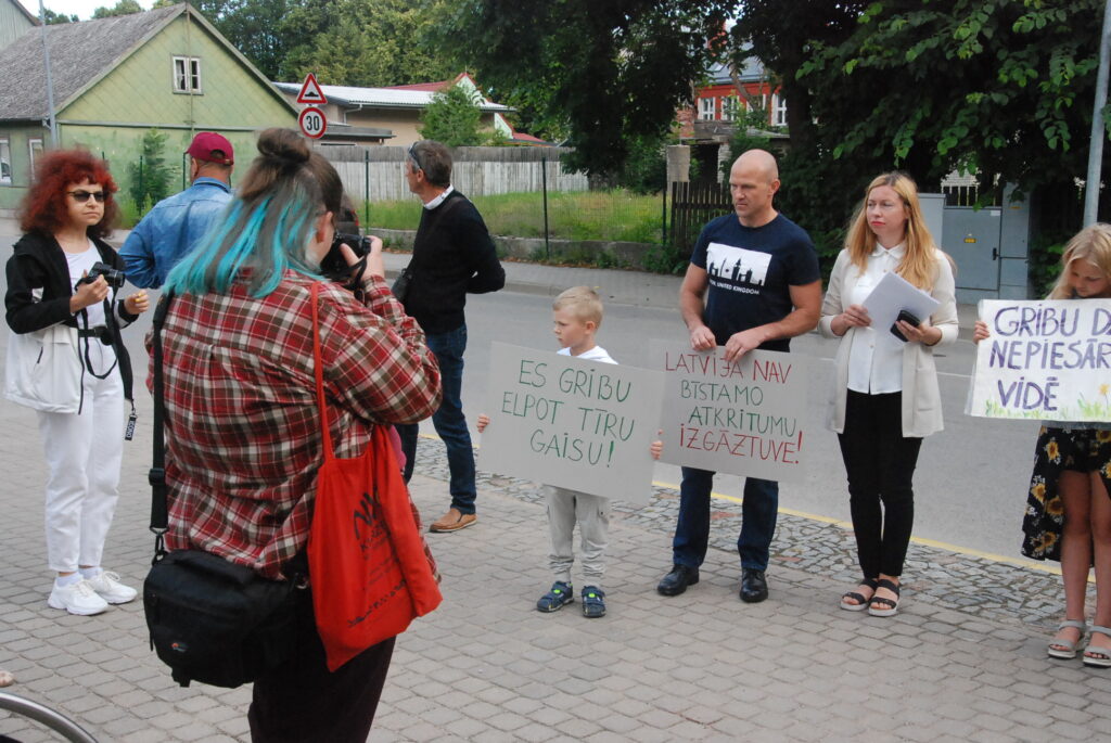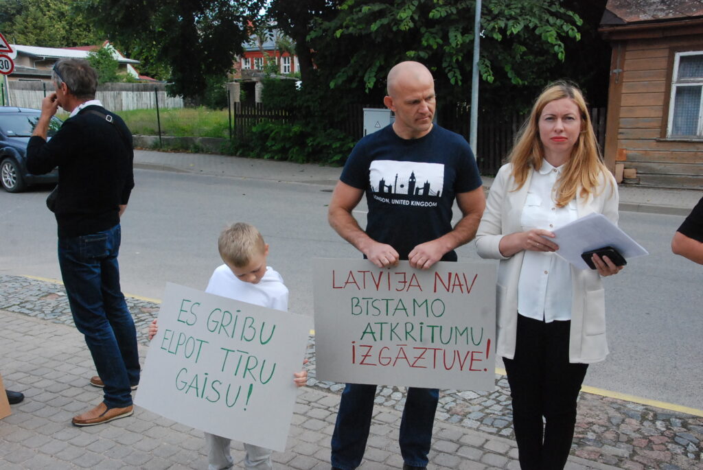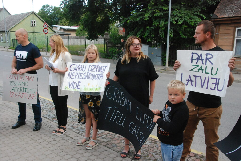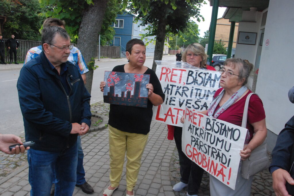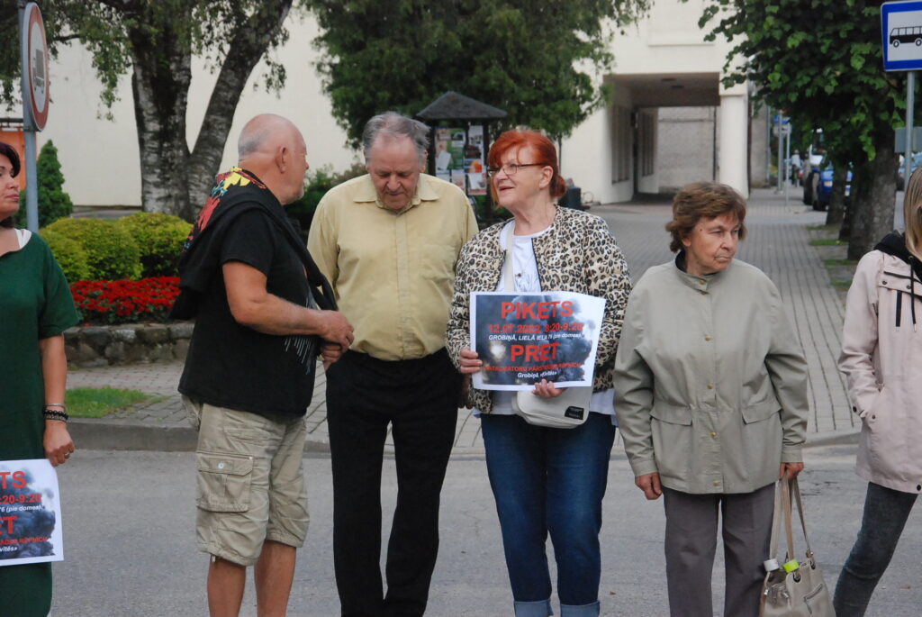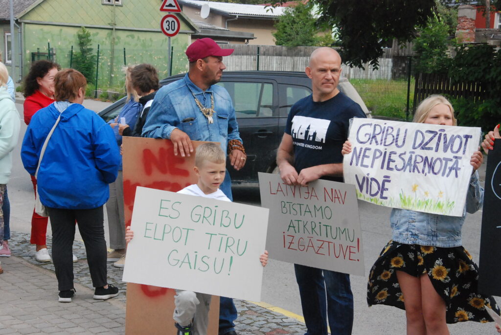 Cilvēki kuplā skaitā otrdienas rītā, 12. jūlijā, pulcējās pie Dienvidkurzemes novada domes, lai piketā paustu savu viedokli par bīstamo atkritumu – izlietoto naftas apstrādes katalizatoru pārstrādes rūpnīcas būvniecību.