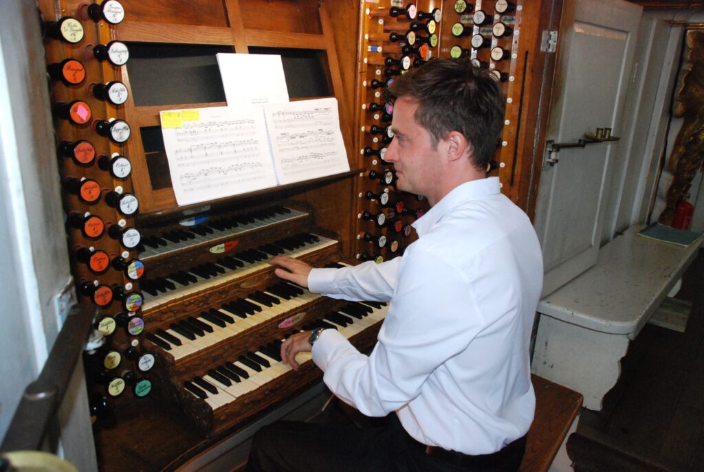 Ērģeļu un vijoles duets atskaņoja baroka laikmeta komponistu J.S.Baha un viņa skolnieka J.G. Mītela mūziku. Skanēs arī 20. gadsimta latviešu autoru – Ata Stepiņa, Helmera Pavasara, Lūcijas Garūtas un Aivara Kalēja darbi. Interesanta bija arī paša ērģelnieka Jāņa Karpoviča improvizācija.