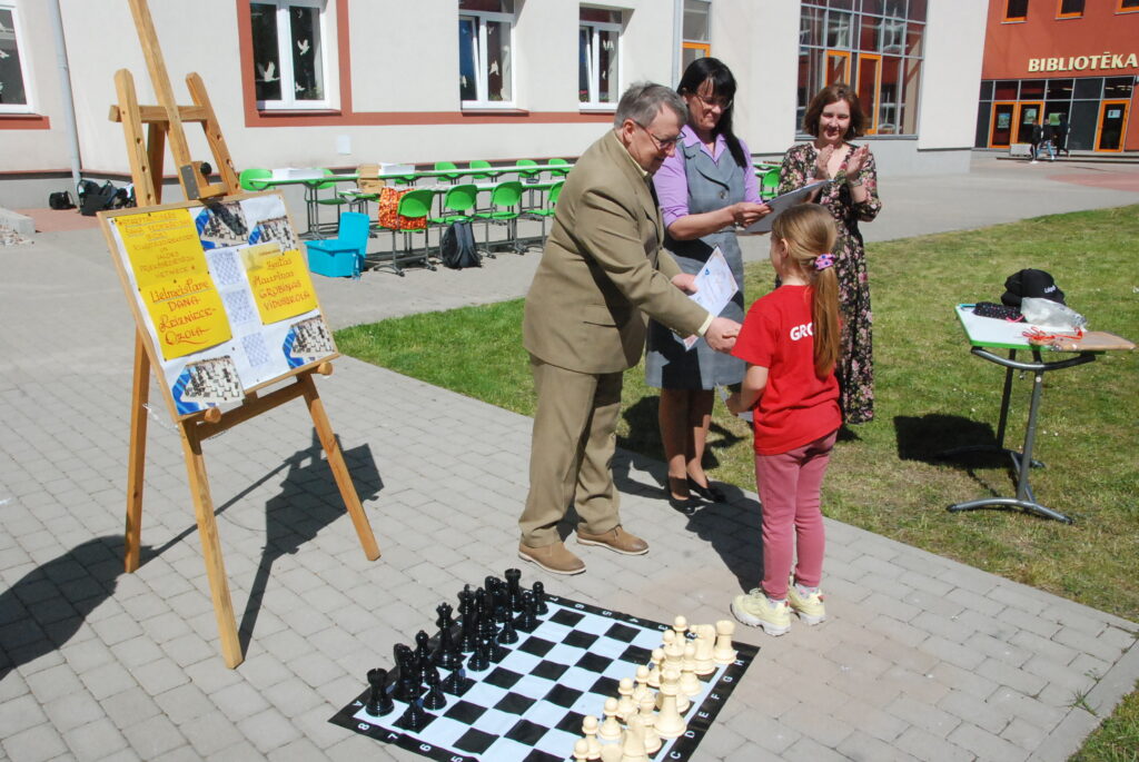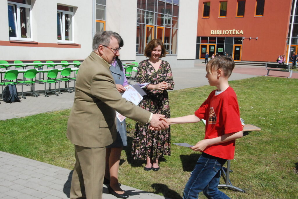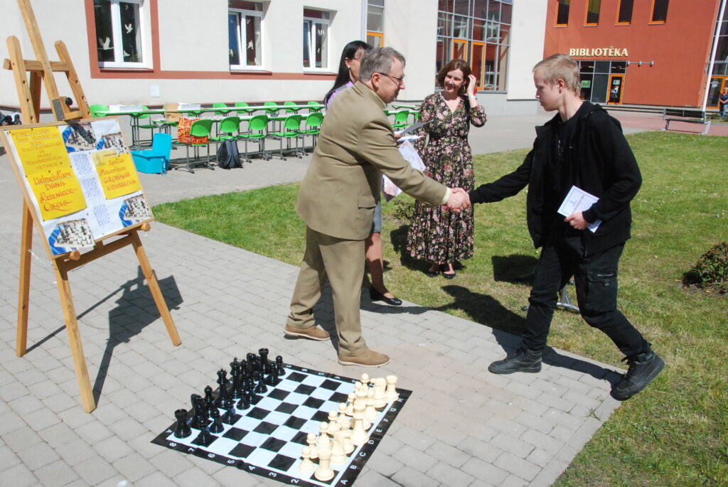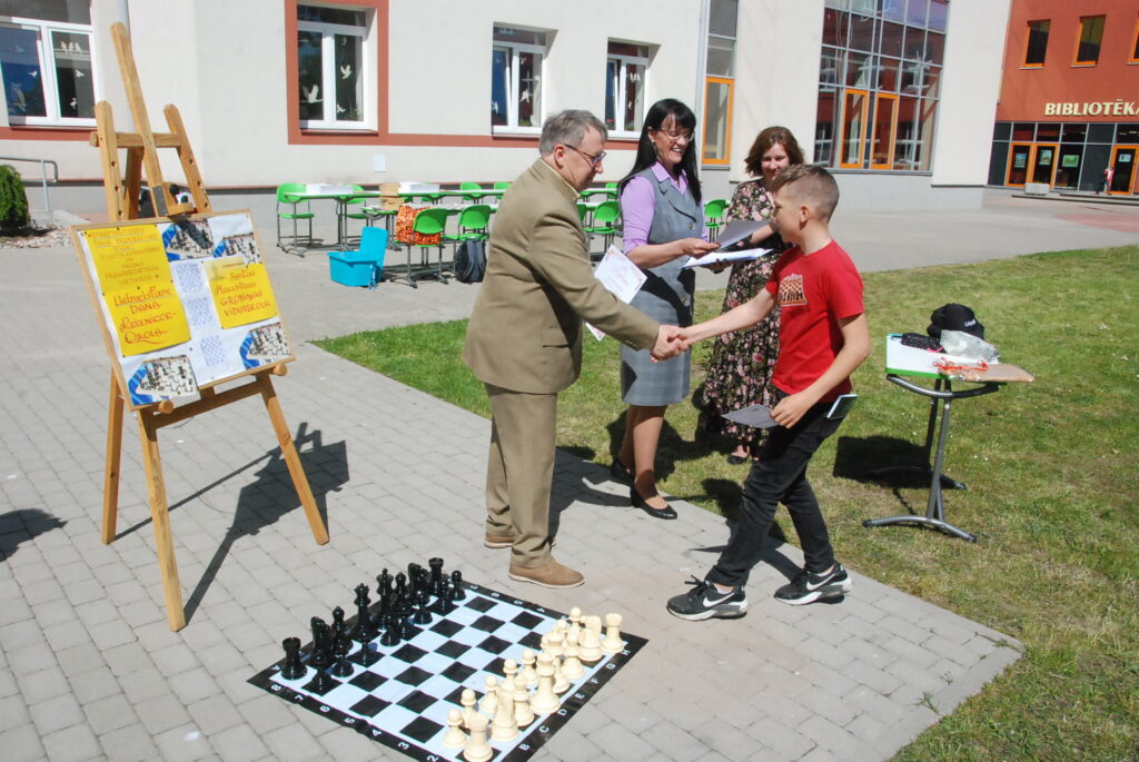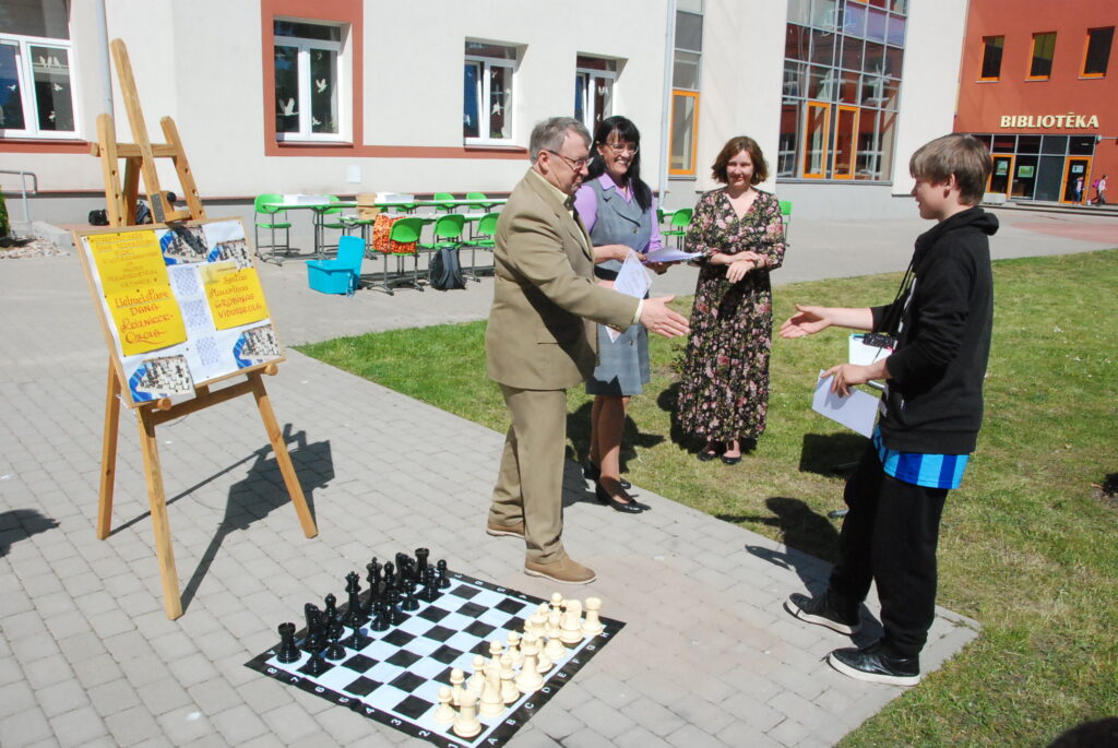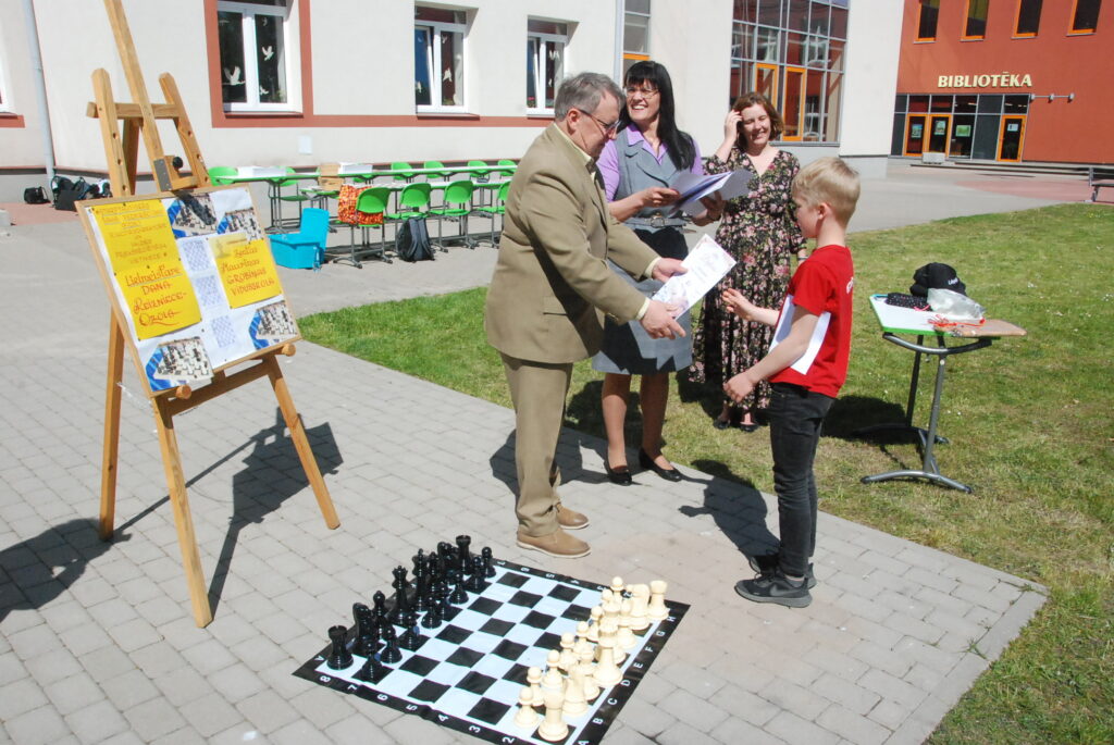 Pēc simultānspēles Dienvidkurzemes novada domes priekšsēdētājs Aivars Priedols šahistiem pasniedza Diplomus par sasniegumiem Latvijas skolu šaha olimpiādē.