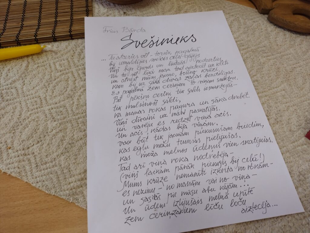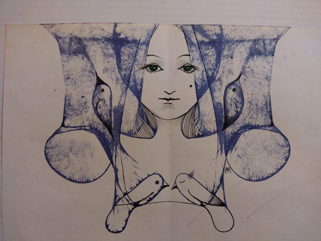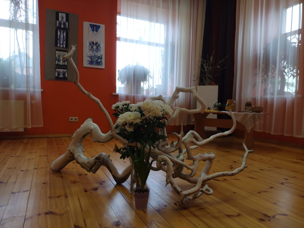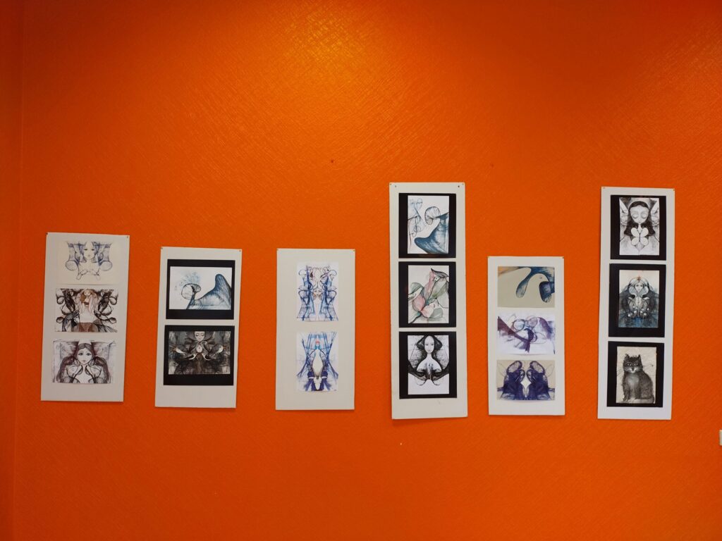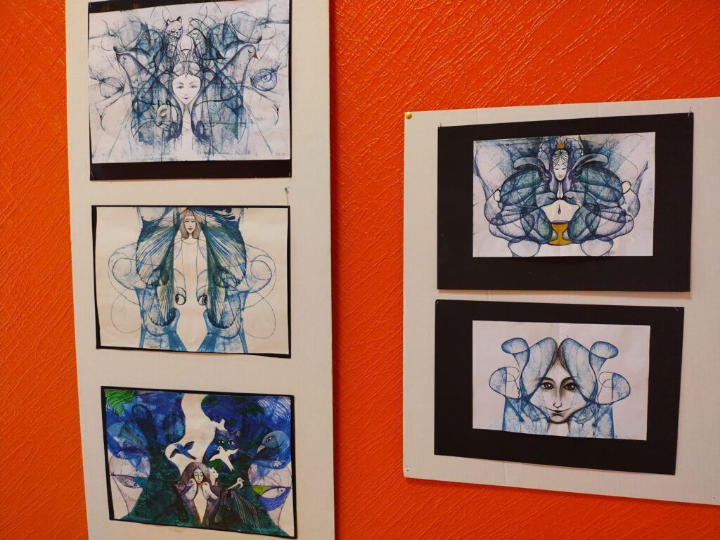 “Man pašai bija pārsteigums, kad izdomāju, ka vajag kaut ko uztaisīt, jo meditējot šoziem zīmēju mājās. Tikai kādi divi, trīs darbi ir senāk taisīti. Tad domāju, ka vajadzētu parādīt, kāpēc gan ne tepat Kalvenē,” portālam “ReKurZeme” stāsta A. Mētra. Viņa norāda, ka zīmējumos izmantota tuša, tie ir atspiedumu tehnikā.