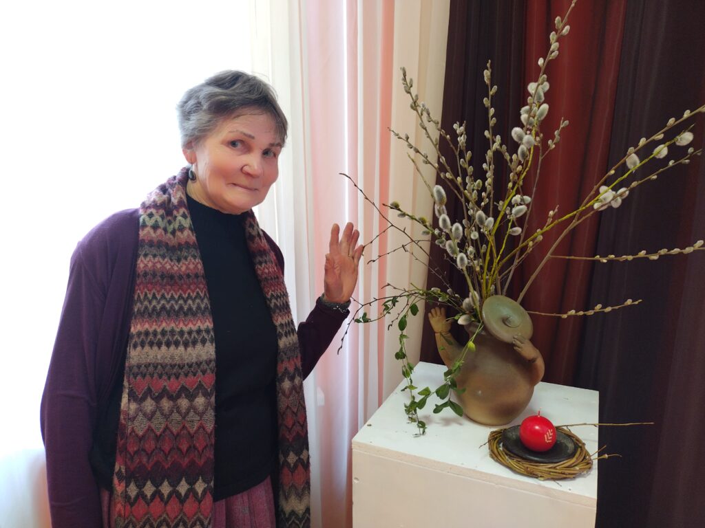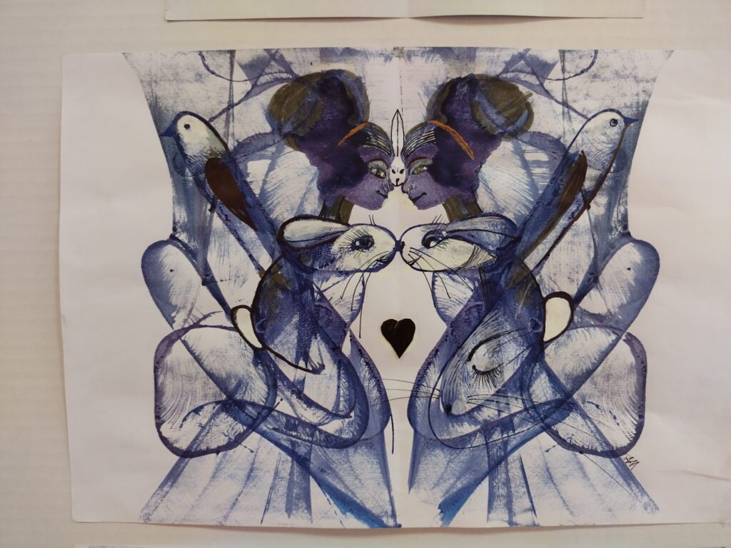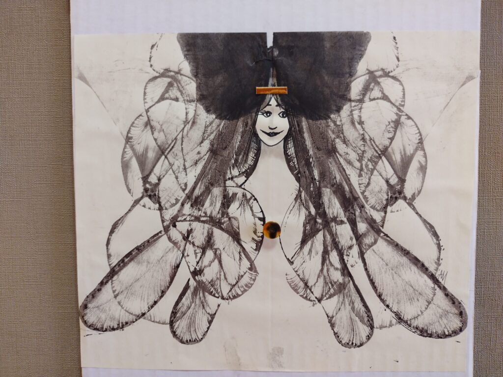 “Tā ir tāda tehnika, kāds, kas ir darījis, zina, ka tas ir kā atspiedums. Simetrija veidojas, kad lapu pārloka. Tur ielikts ir nokrāsots diegs. Kad velk ārā, pēc tam attaisa lapu un skatās, kāds tur būs brīnums. Ja liekas, ka nekas nav, jāliek vēl kāds diegs, un atkal pa jaunu,” par darbu tapšanu stāsta māksliniece.
