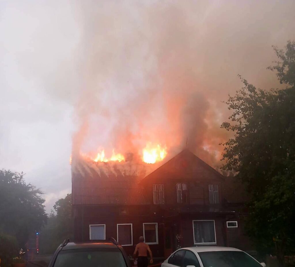 Liela ugunsnelaime Aizputē: Zibens bumba trāpa jumtā; nodeg dzīvojamā māja