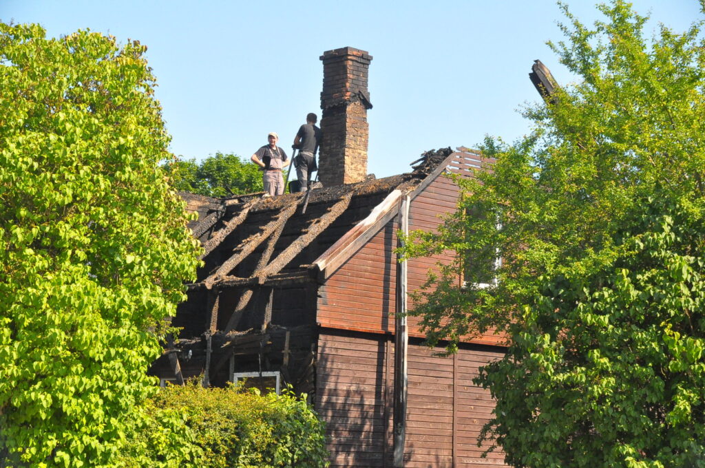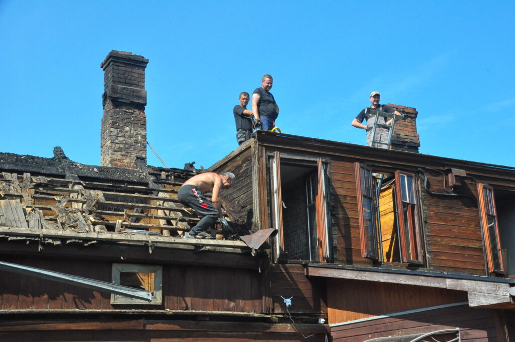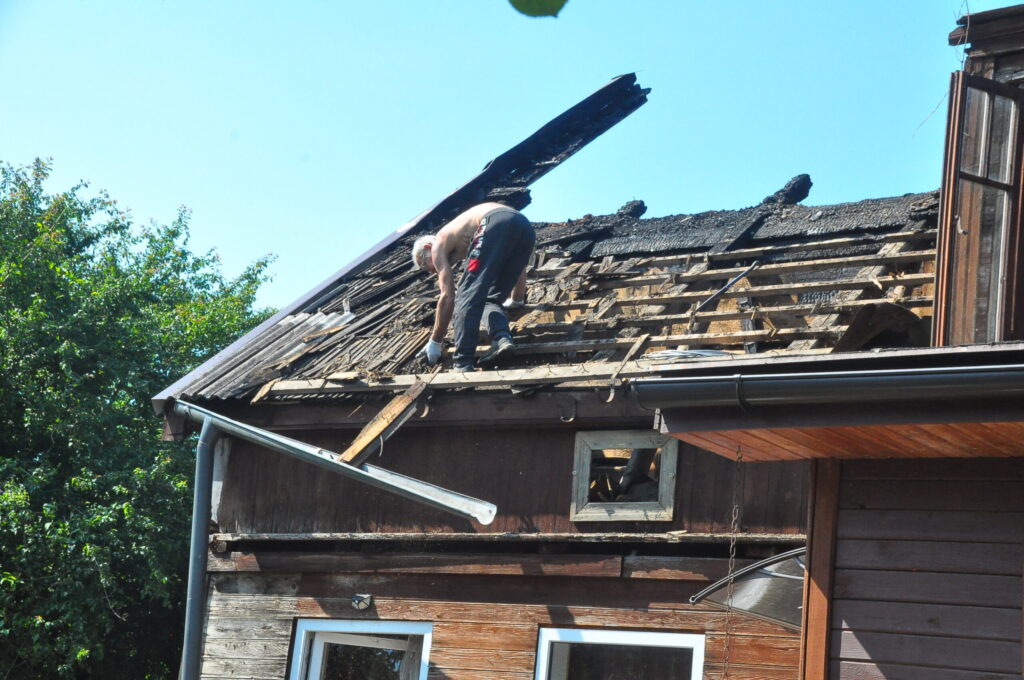 Piektdien mājas saimnieks Andris Ešenvalds kopā ar palīgiem strādāja uz jumta, novēršot lielās ugunsnelaimes sekas. Foto – Uldis Dobelis
