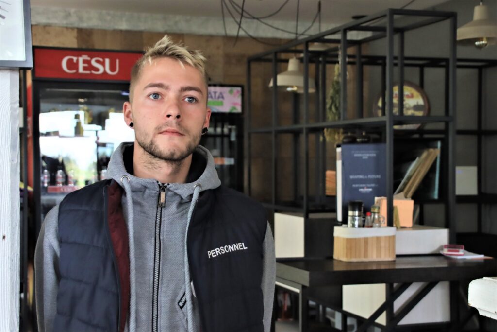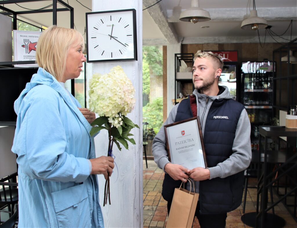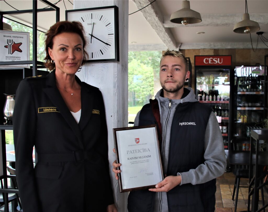 Dienvidkurzemes novada domes priekšsēdētājs Aivars Priedols, Pašvaldības policijas priekšniece Ieva Ilstere, Nīcas un Otaņķu pagastu apvienības pārvaldes vadītāja Anda Veidele un Nīcas kultūras pasākumu organizatore Sandra Skadiņa trešdien Nīcā pateicās par drošsirdību restorāna “Nīcava” bārmenim Raivim Siljānim.